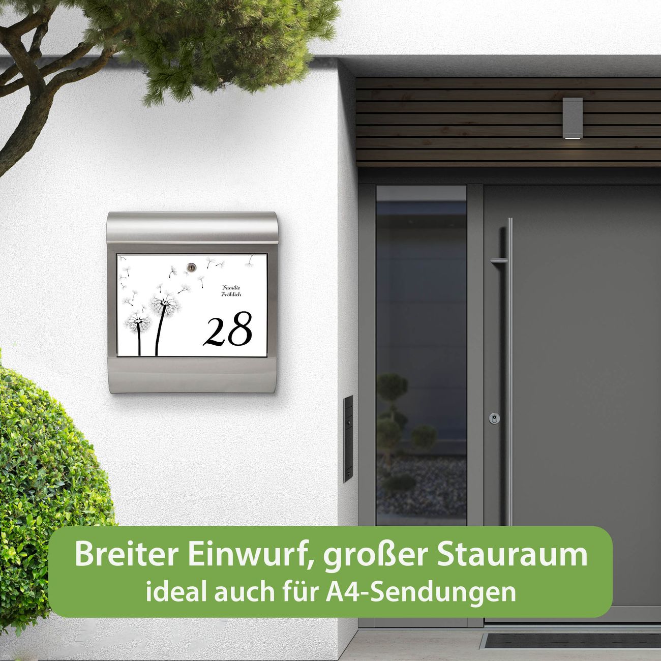 FUNKTION: Der banjado Edelstahl Briefkasten mit Motiv Motiv Pusteblume WS bietet Ihnen mit seinem Fassungsvermögen genügend Platz auch für große A4 Sendungen. Das integrierte Zeitungsfach eignet sich hervorragend um unkompliziert die Tageszeitung zu fassen. Auf Wunsch können Sie bei uns den passenden Ständer kaufen und so aus dem Wandbriefkasten einen Standbriefkasten machen. DESIGN: Der Motivbriefkasten hat ein sehr ansprechendes und ausgefallenes Design, damit entlocken Sie Ihren Nachbarn und dem Postboten ein Lächeln. Heben Sie Sich ab von der tristen grauen Masse ohne auf Funktionalität zu verzichten. DETAILS: Der Design Briefkasten mit Motiv Motiv Pusteblume WS besteht aus hochwertigem 18/0 Edelstahl. Das Motiv besteht aus einer wetter- und UV-resistenten Folie, die mit einem Schutzlaminat überzogen ist. Der Briefkasten wird mit Montagematerial und zwei Schlüsseln geliefert. NUTZEN: Sie können diesen Briefkasten sowohl als Wandbriefkasten montieren oder einen passenden Ständer auswählen und als Standbriefkasten einbetonieren. Die Größe bietet genügend Platz für Sendungen aller Art, das hochwertige Edelstahl ist rostfrei und die Motivfolie absolut wetterfest. SCHUTZ: Um Ihre Post optimal vor Witterungseinflüssen wie Starkregen zu schützen, empfehlen wir, den Briefkasten geschützt anzubringen. BANJADO: Ihr Briefkasten wird in Sachsen in einer kleinen Manufaktur von Hand veredelt. Die Motivfolie ist lösungsmittelfrei und schutzlaminiert, dies sorgt für einen langen Halt. Wir legen großen Wert auf die Verbindung von Funktionalität und Design. Sie erhalten Handarbeit aus Sachsen.