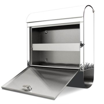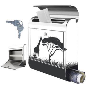 FUNKTION: Der banjado Edelstahl Briefkasten mit Motiv Motiv Savannen-Silhouette bietet Ihnen mit seinem Fassungsvermögen genügend Platz auch für große A4 Sendungen. Das integrierte Zeitungsfach eignet sich hervorragend um unkompliziert die Tageszeitung zu fassen. Auf Wunsch können Sie bei uns den passenden Ständer kaufen und so aus dem Wandbriefkasten einen Standbriefkasten machen. DESIGN: Der Motivbriefkasten hat ein sehr ansprechendes und ausgefallenes Design, damit entlocken Sie Ihren Nachbarn und dem Postboten ein Lächeln. Heben Sie Sich ab von der tristen grauen Masse ohne auf Funktionalität zu verzichten. DETAILS: Der Design Briefkasten mit Motiv Motiv Savannen-Silhouette besteht aus hochwertigem 18/0 Edelstahl. Das Motiv besteht aus einer wetter- und UV-resistenten Folie, die mit einem Schutzlaminat überzogen ist. Der Briefkasten wird mit Montagematerial und zwei Schlüsseln geliefert. NUTZEN: Sie können diesen Briefkasten sowohl als Wandbriefkasten montieren oder einen passenden Ständer auswählen und als Standbriefkasten einbetonieren. Die Größe bietet genügend Platz für Sendungen aller Art, das hochwertige Edelstahl ist rostfrei und die Motivfolie absolut wetterfest. SCHUTZ: Um Ihre Post optimal vor Witterungseinflüssen wie Starkregen zu schützen, empfehlen wir, den Briefkasten geschützt anzubringen. BANJADO: Ihr Briefkasten wird in Sachsen in einer kleinen Manufaktur von Hand veredelt. Die Motivfolie ist lösungsmittelfrei und schutzlaminiert, dies sorgt für einen langen Halt. Wir legen großen Wert auf die Verbindung von Funktionalität und Design. Sie erhalten Handarbeit aus Sachsen.