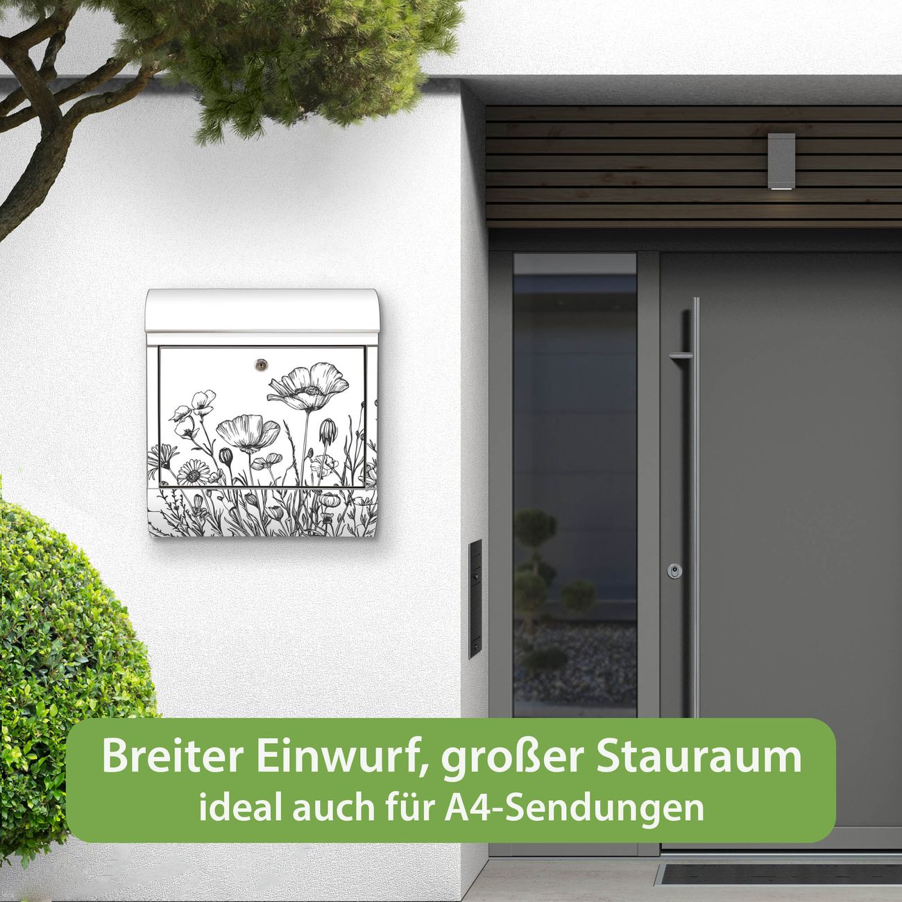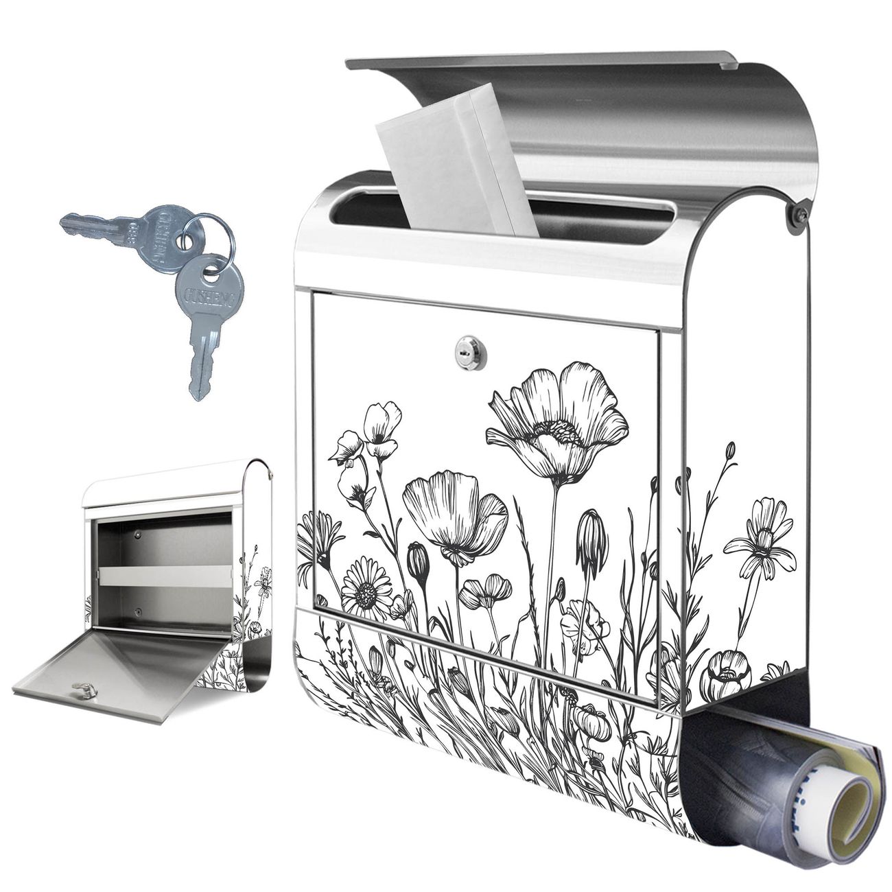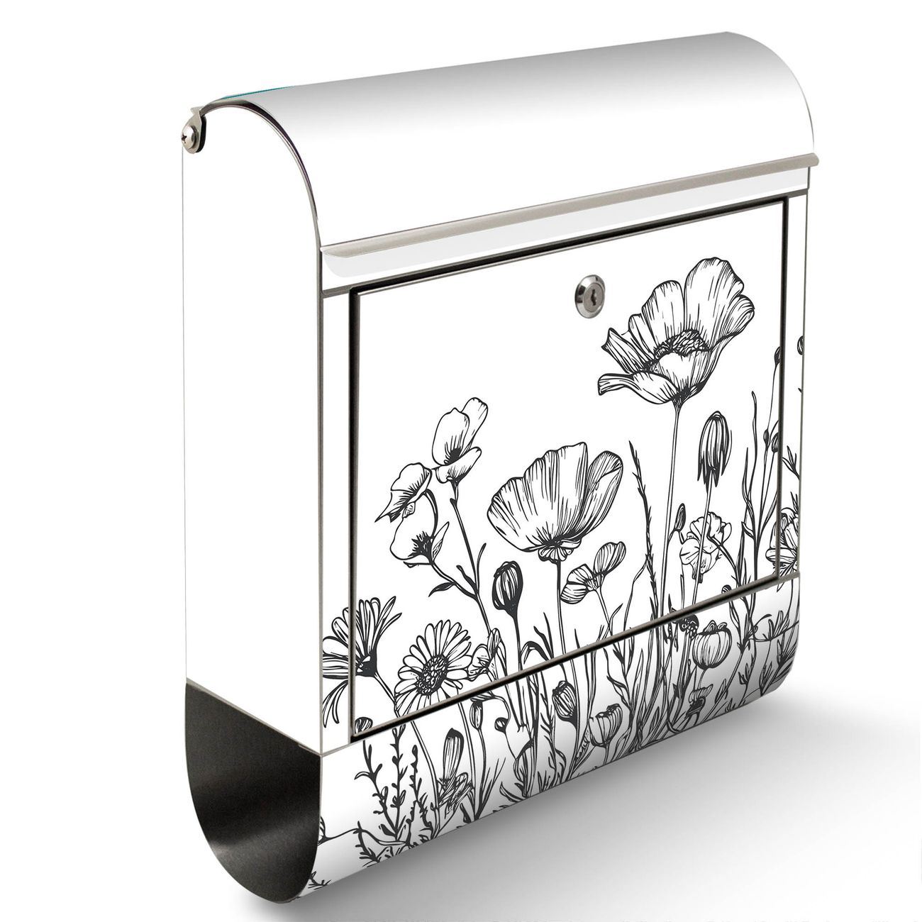 Wandbriefkasten Edelstahl Motiv Schwarz-Weiß Blumenzeichnung