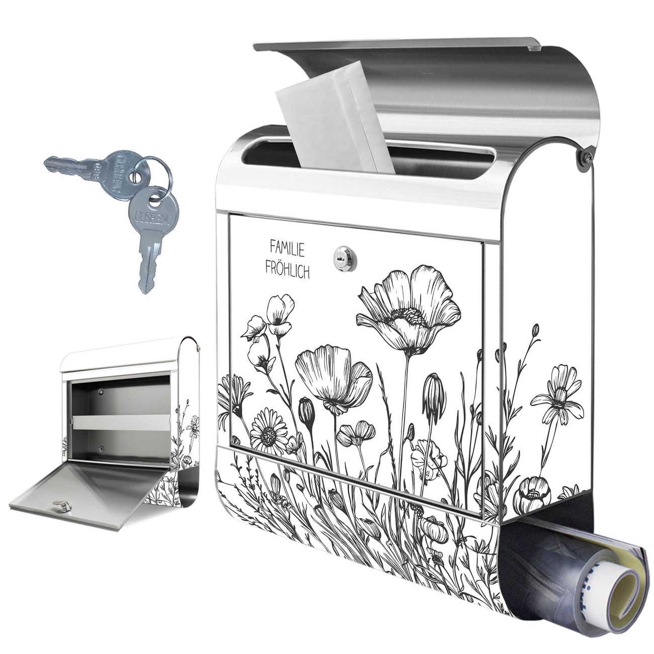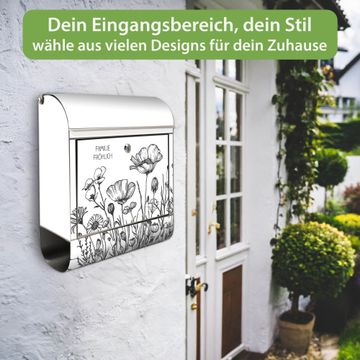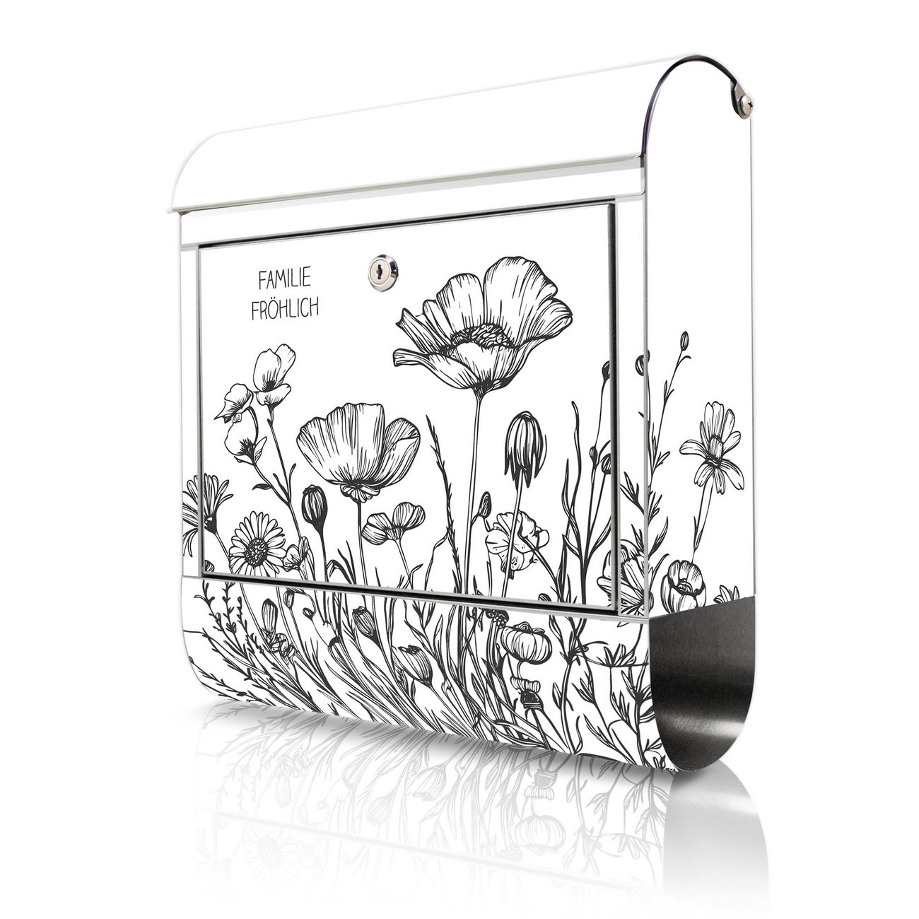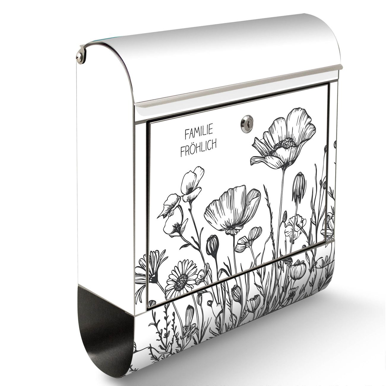 Wandbriefkasten Edelstahl Motiv Schwarz-Weiß Blumenzeichnung