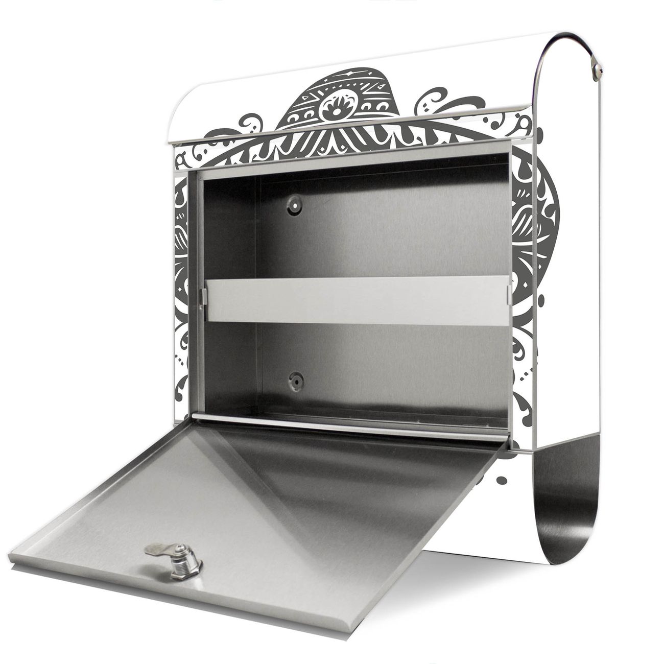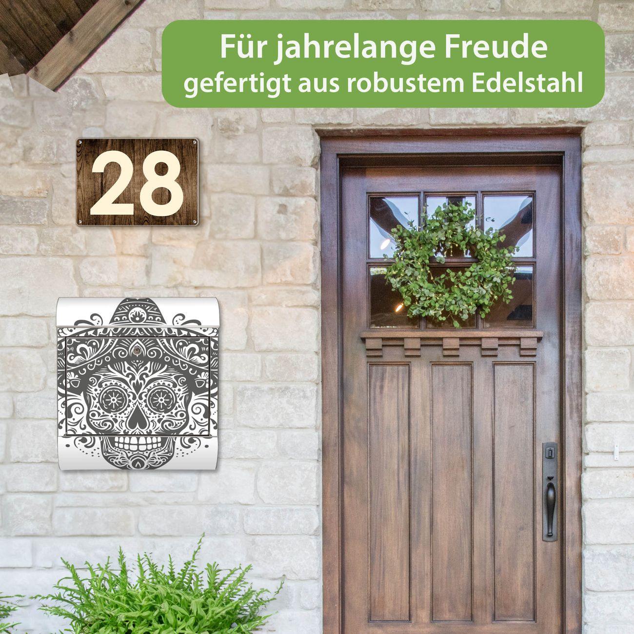FUNKTION: Der banjado Edelstahl Briefkasten mit Motiv Motiv Sombrero Totenkopf bietet Ihnen mit seinem Fassungsvermögen genügend Platz auch für große A4 Sendungen. Das integrierte Zeitungsfach eignet sich hervorragend um unkompliziert die Tageszeitung zu fassen. Auf Wunsch können Sie bei uns den passenden Ständer kaufen und so aus dem Wandbriefkasten einen Standbriefkasten machen. DESIGN: Der Motivbriefkasten hat ein sehr ansprechendes und ausgefallenes Design, damit entlocken Sie Ihren Nachbarn und dem Postboten ein Lächeln. Heben Sie Sich ab von der tristen grauen Masse ohne auf Funktionalität zu verzichten. DETAILS: Der Design Briefkasten mit Motiv Motiv Sombrero Totenkopf besteht aus hochwertigem 18/0 Edelstahl. Das Motiv besteht aus einer wetter- und UV-resistenten Folie, die mit einem Schutzlaminat überzogen ist. Der Briefkasten wird mit Montagematerial und zwei Schlüsseln geliefert. NUTZEN: Sie können diesen Briefkasten sowohl als Wandbriefkasten montieren oder einen passenden Ständer auswählen und als Standbriefkasten einbetonieren. Die Größe bietet genügend Platz für Sendungen aller Art, das hochwertige Edelstahl ist rostfrei und die Motivfolie absolut wetterfest. SCHUTZ: Um Ihre Post optimal vor Witterungseinflüssen wie Starkregen zu schützen, empfehlen wir, den Briefkasten geschützt anzubringen. BANJADO: Ihr Briefkasten wird in Sachsen in einer kleinen Manufaktur von Hand veredelt. Die Motivfolie ist lösungsmittelfrei und schutzlaminiert, dies sorgt für einen langen Halt. Wir legen großen Wert auf die Verbindung von Funktionalität und Design. Sie erhalten Handarbeit aus Sachsen.