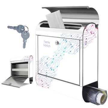 FUNKTION: Der banjado Edelstahl Briefkasten mit Motiv Motiv Technologiemuster bietet Ihnen mit seinem Fassungsvermögen genügend Platz auch für große A4 Sendungen. Das integrierte Zeitungsfach eignet sich hervorragend um unkompliziert die Tageszeitung zu fassen. Auf Wunsch können Sie bei uns den passenden Ständer kaufen und so aus dem Wandbriefkasten einen Standbriefkasten machen. DESIGN: Der Motivbriefkasten hat ein sehr ansprechendes und ausgefallenes Design, damit entlocken Sie Ihren Nachbarn und dem Postboten ein Lächeln. Heben Sie Sich ab von der tristen grauen Masse ohne auf Funktionalität zu verzichten. DETAILS: Der Design Briefkasten mit Motiv Motiv Technologiemuster besteht aus hochwertigem 18/0 Edelstahl. Das Motiv besteht aus einer wetter- und UV-resistenten Folie, die mit einem Schutzlaminat überzogen ist. Der Briefkasten wird mit Montagematerial und zwei Schlüsseln geliefert. NUTZEN: Sie können diesen Briefkasten sowohl als Wandbriefkasten montieren oder einen passenden Ständer auswählen und als Standbriefkasten einbetonieren. Die Größe bietet genügend Platz für Sendungen aller Art, das hochwertige Edelstahl ist rostfrei und die Motivfolie absolut wetterfest. SCHUTZ: Um Ihre Post optimal vor Witterungseinflüssen wie Starkregen zu schützen, empfehlen wir, den Briefkasten geschützt anzubringen. BANJADO: Ihr Briefkasten wird in Sachsen in einer kleinen Manufaktur von Hand veredelt. Die Motivfolie ist lösungsmittelfrei und schutzlaminiert, dies sorgt für einen langen Halt. Wir legen großen Wert auf die Verbindung von Funktionalität und Design. Sie erhalten Handarbeit aus Sachsen.
