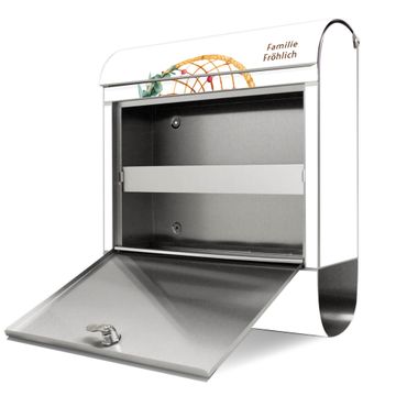 FUNKTION: Der banjado Edelstahl Briefkasten mit Motiv Motiv Traumfänger Federn und Blumen bietet Ihnen mit seinem Fassungsvermögen genügend Platz auch für große A4 Sendungen. Das integrierte Zeitungsfach eignet sich hervorragend um unkompliziert die Tageszeitung zu fassen. Auf Wunsch können Sie bei uns den passenden Ständer kaufen und so aus dem Wandbriefkasten einen Standbriefkasten machen. DESIGN: Der Motivbriefkasten hat ein sehr ansprechendes und ausgefallenes Design, damit entlocken Sie Ihren Nachbarn und dem Postboten ein Lächeln. Heben Sie Sich ab von der tristen grauen Masse ohne auf Funktionalität zu verzichten. DETAILS: Der Design Briefkasten mit Motiv Motiv Traumfänger Federn und Blumen besteht aus hochwertigem 18/0 Edelstahl. Das Motiv besteht aus einer wetter- und UV-resistenten Folie, die mit einem Schutzlaminat überzogen ist. Der Briefkasten wird mit Montagematerial und zwei Schlüsseln geliefert. NUTZEN: Sie können diesen Briefkasten sowohl als Wandbriefkasten montieren oder einen passenden Ständer auswählen und als Standbriefkasten einbetonieren. Die Größe bietet genügend Platz für Sendungen aller Art, das hochwertige Edelstahl ist rostfrei und die Motivfolie absolut wetterfest. SCHUTZ: Um Ihre Post optimal vor Witterungseinflüssen wie Starkregen zu schützen, empfehlen wir, den Briefkasten geschützt anzubringen. BANJADO: Ihr Briefkasten wird in Sachsen in einer kleinen Manufaktur von Hand veredelt. Die Motivfolie ist lösungsmittelfrei und schutzlaminiert, dies sorgt für einen langen Halt. Wir legen großen Wert auf die Verbindung von Funktionalität und Design. Sie erhalten Handarbeit aus Sachsen.