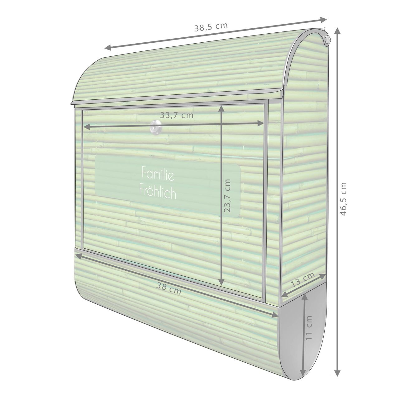 Motiv Bambus Grün Nr. 10353 Material: schwarz pulverbeschichtetes Stahlblech Dekorfolie: UV-beständig, wetterfest Gesamtgröße: 38x46x12,5cm BxHxT Briefschlitz: 33x3,5cm BxH Gewicht: ca. 3,4 kg Zubehör: Montagezubehör, 2 Schlüssel, Bohrschablone