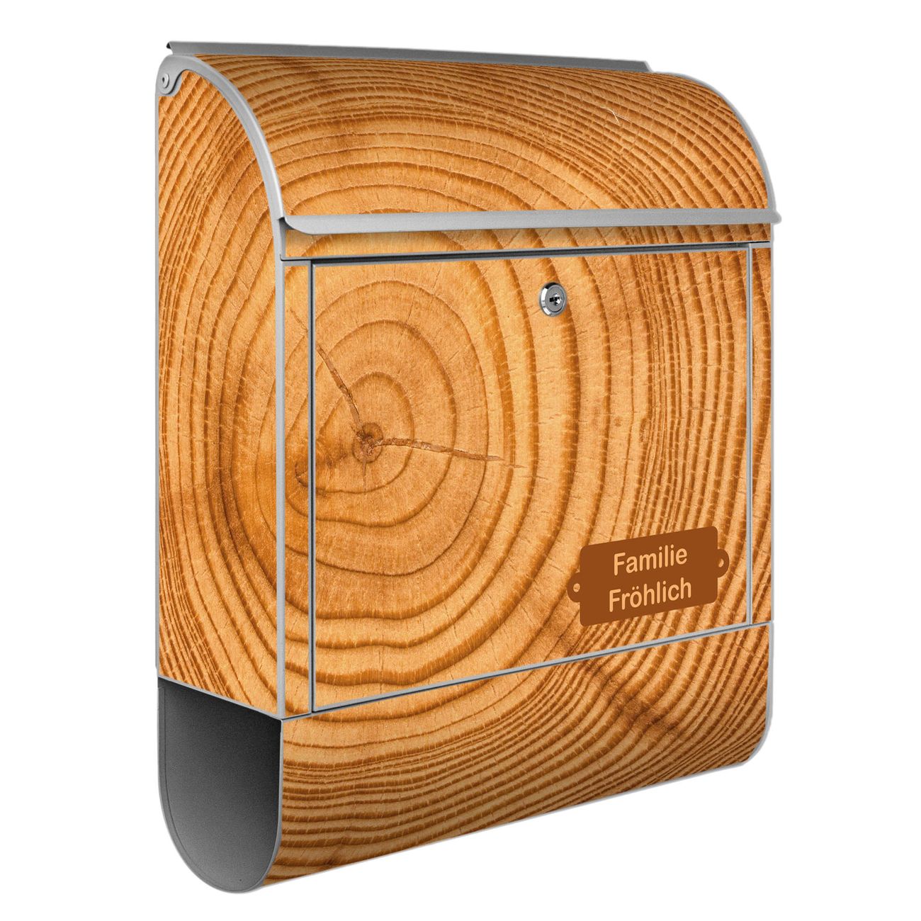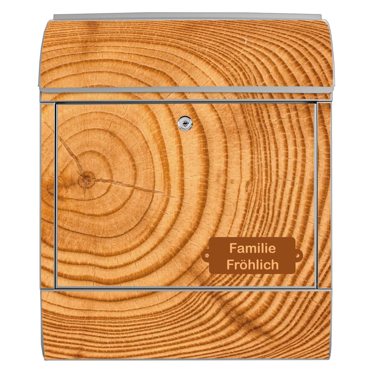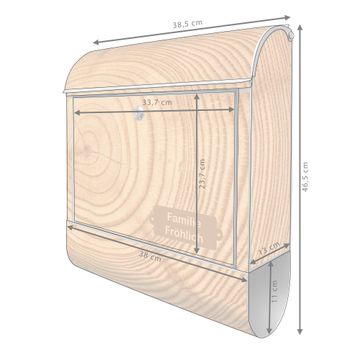 Motiv Baumstamm Nr. 10289 Material: silber-grau pulverbeschichtetes Stahlblech Dekorfolie: UV-beständig, wetterfest Gesamtgröße: 38x46x12,5cm BxHxT Briefschlitz: 33x3,5cm BxH Gewicht: ca. 3,4 kg Zubehör: Montagezubehör, 2 Schlüssel, Bohrschablone