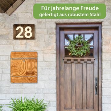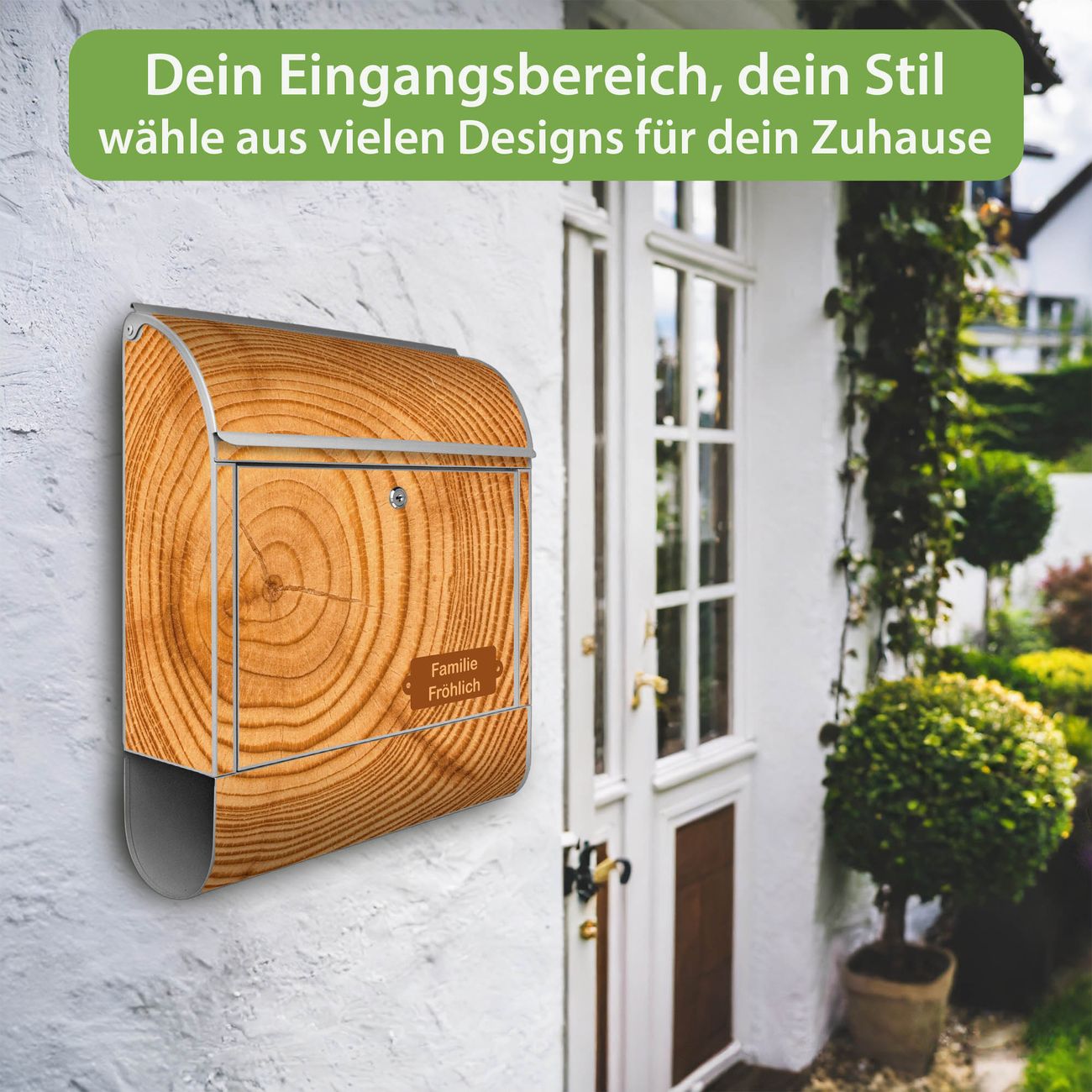 DESIGN: Der Postkasten mit Motiv Motiv Baumstamm hat ein sehr ansprechendes und ausgefallenes Design, damit entlocken Sie Ihren Nachbarn und dem Postboten ein Lächeln. Heben Sie Sich von der tristen grauen Masse ab, ohne auf Funktionalität zu verzichten. DETAILS: Der Postkasten besteht aus pulverbeschichtetem Stahl. Er ist 38x46x12,5cm groß. Das Motiv besteht aus einer wetter- und UV-resistenten Folie, die mit einem Schutzlaminat überzogen ist, sodass der Briefkasten zusätzlich vor Kratzern geschützt ist. Der Briefkasten wird mit Montagematerial, zusätzlich zwei Schlüssel sowie einer Bohrschablone geliefert. NUTZEN: Sie können diesen Briefkasten sowohl als Wandbriefkasten montieren oder einen passenden Ständer kaufen und als Standbriefkasten einbetonieren. Die Größe bietet genügend Platz für Sendungen aller Art, der Einwurf fasst auch größere A4 Sendungen. BANJADO: Ihr Briefkasten wird in Sachsen in einer kleinen Manufaktur von Hand veredelt. Die Motivfolie ist lösungsmittelfrei und schutzlaminiert für einen langen Halt. Wir legen großen Wert auf die Verbindung von Funktionalität und Design. Sie erhalten Handarbeit aus Sachsen.