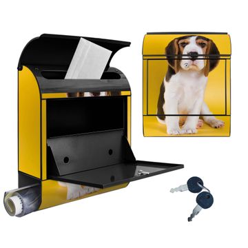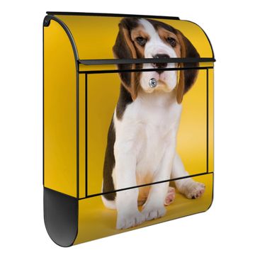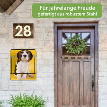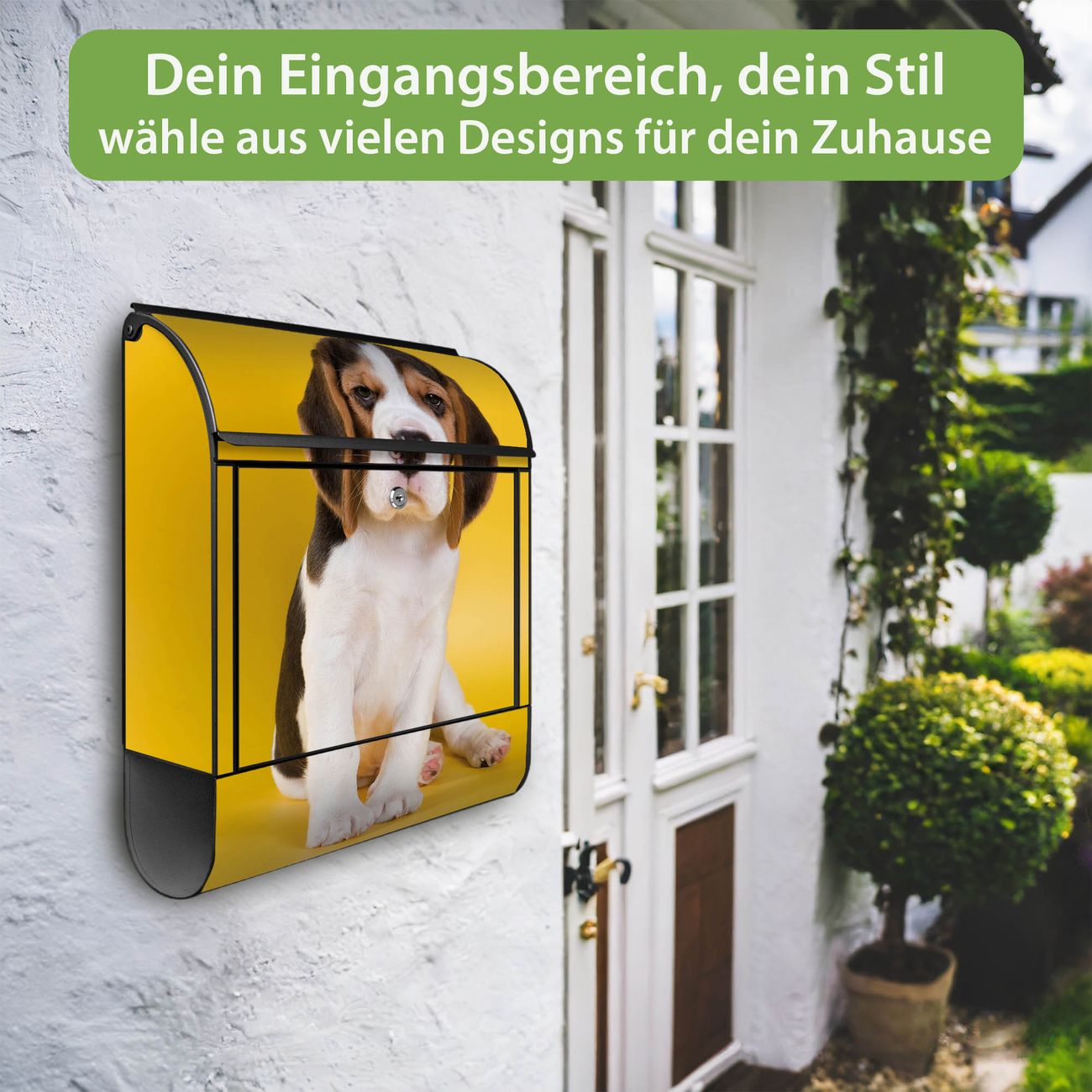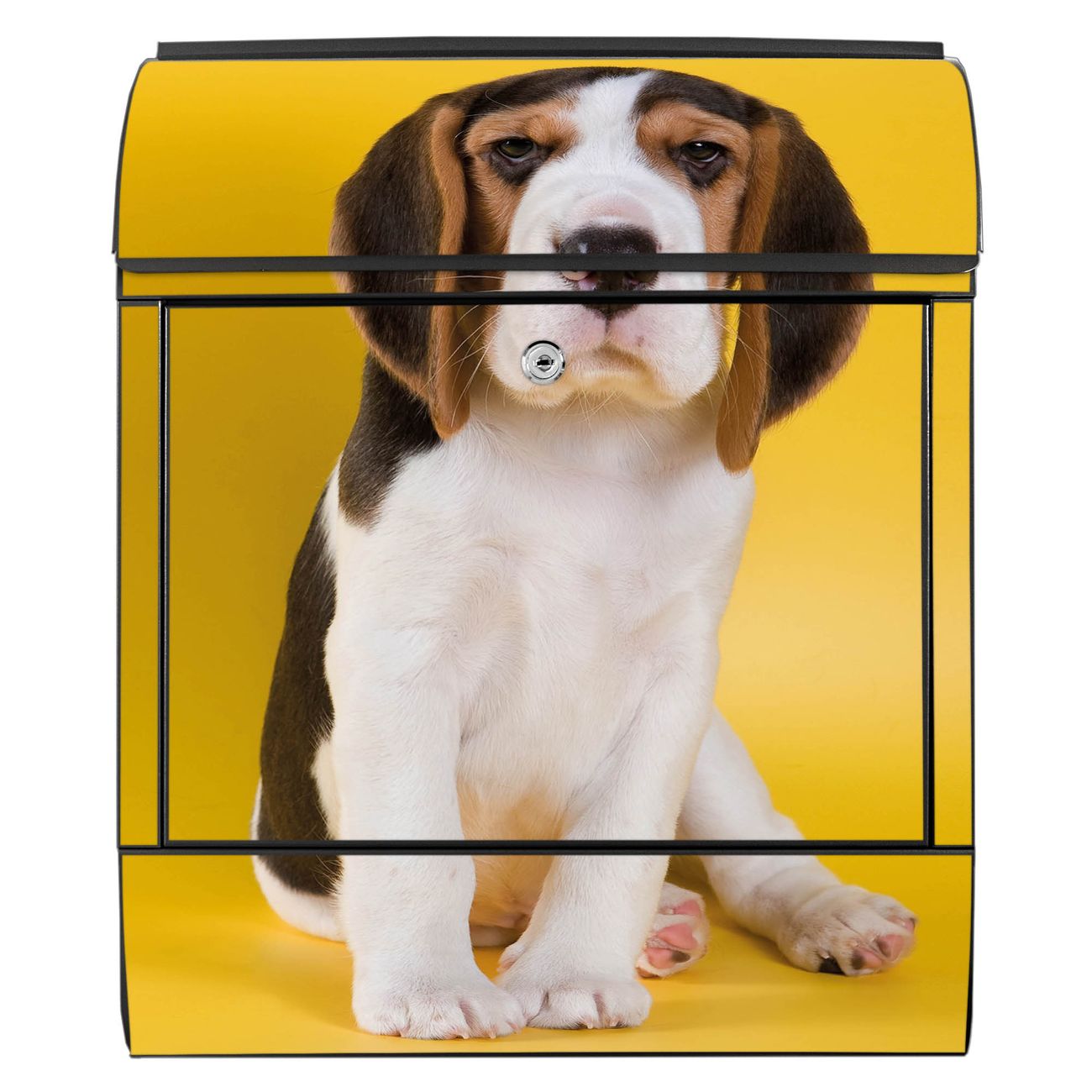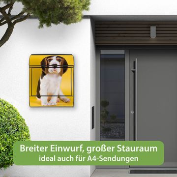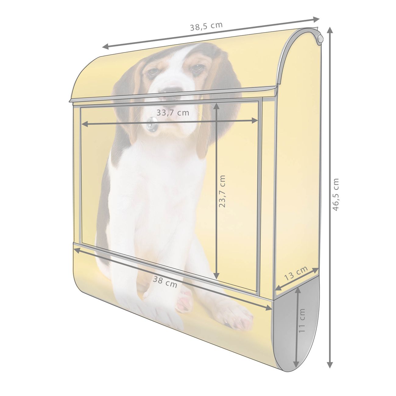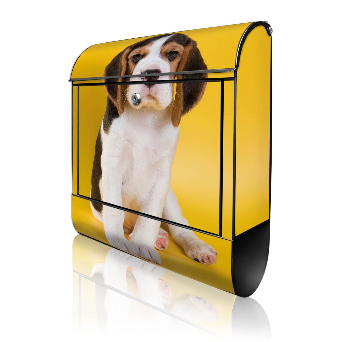 Motiv Beagle Nr. 10193 Material schwarz pulverbeschichtetes Stahlblech Dekorfolie UV-beständig, wetterfest Gesamtgröße 38x47x13cm BxHxT Briefschlitz 33x3,5cm BxH Gewicht ca. 3,5 kg Zubehör Montagezubehör, 2 Schlüssel, Bohrschablone