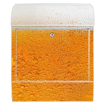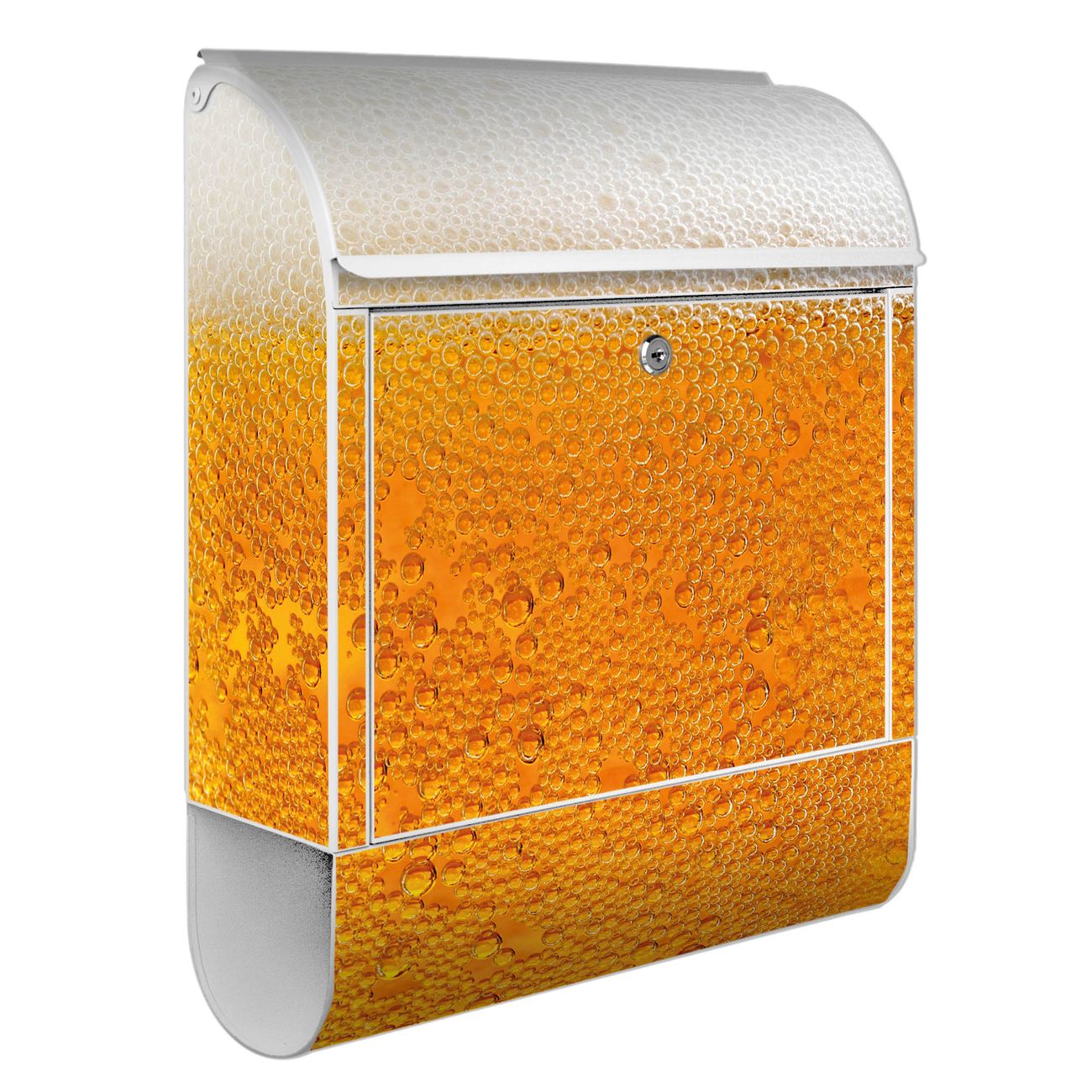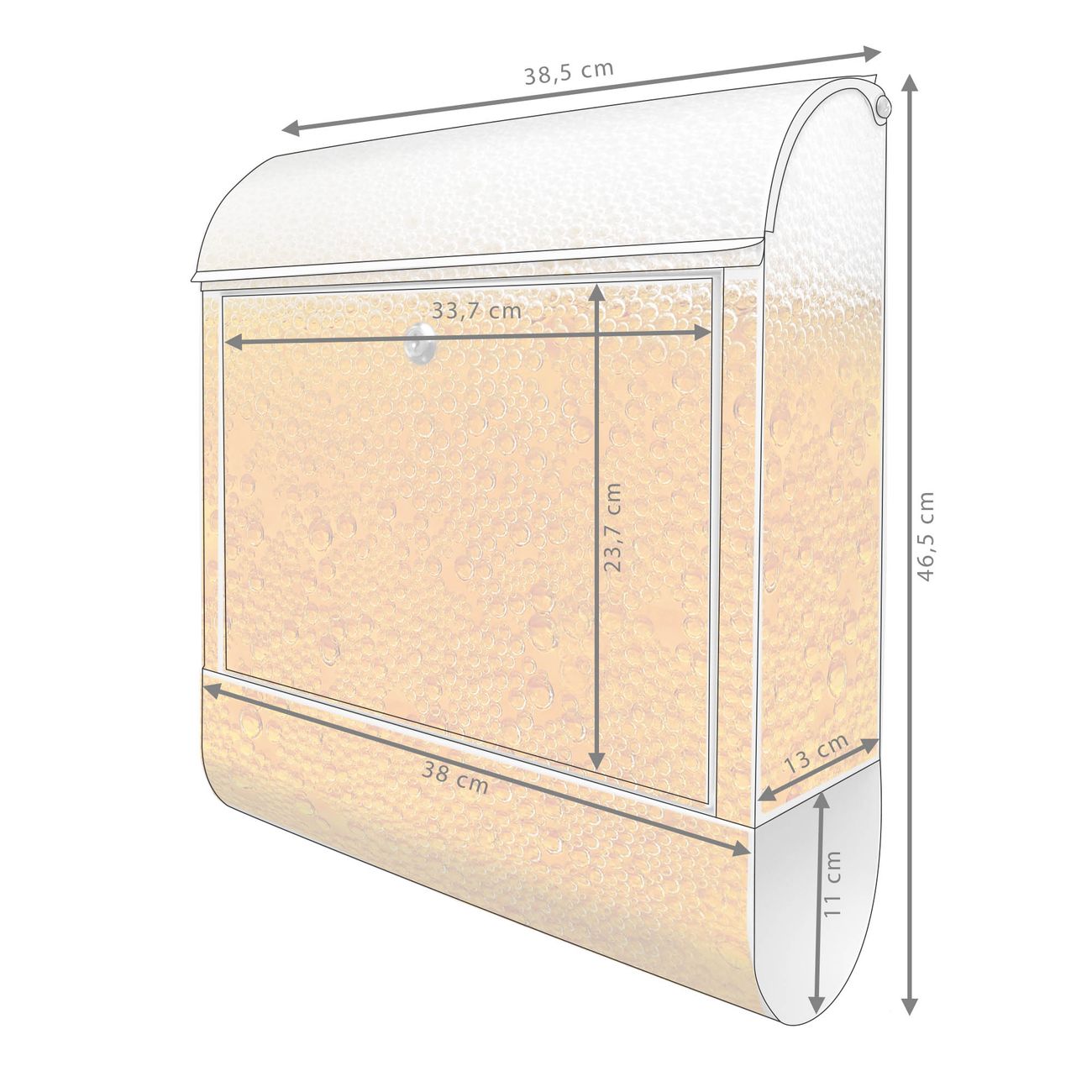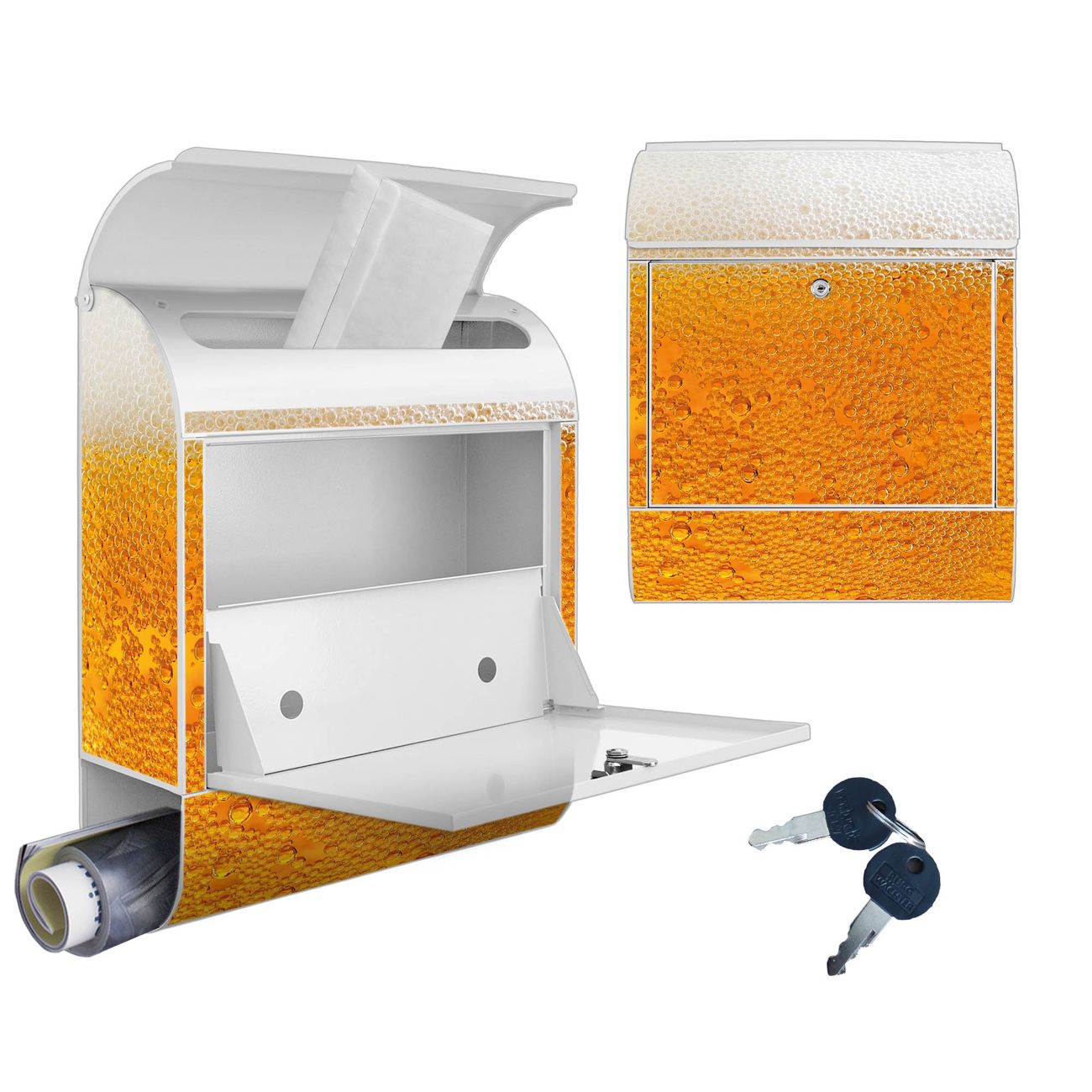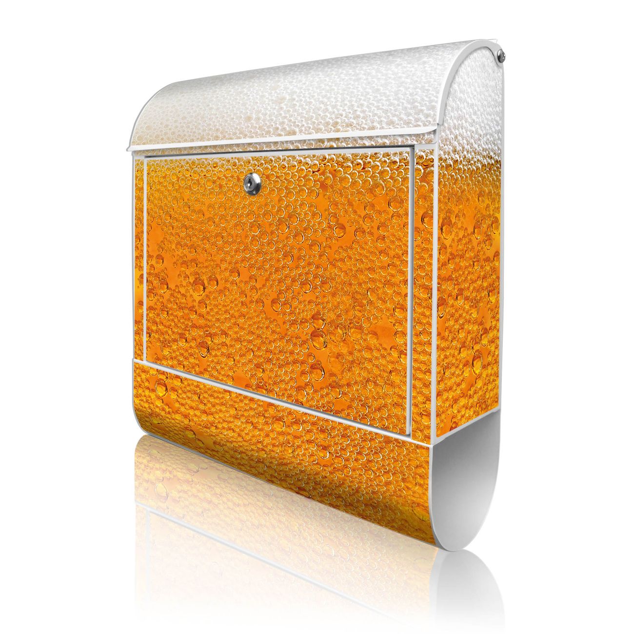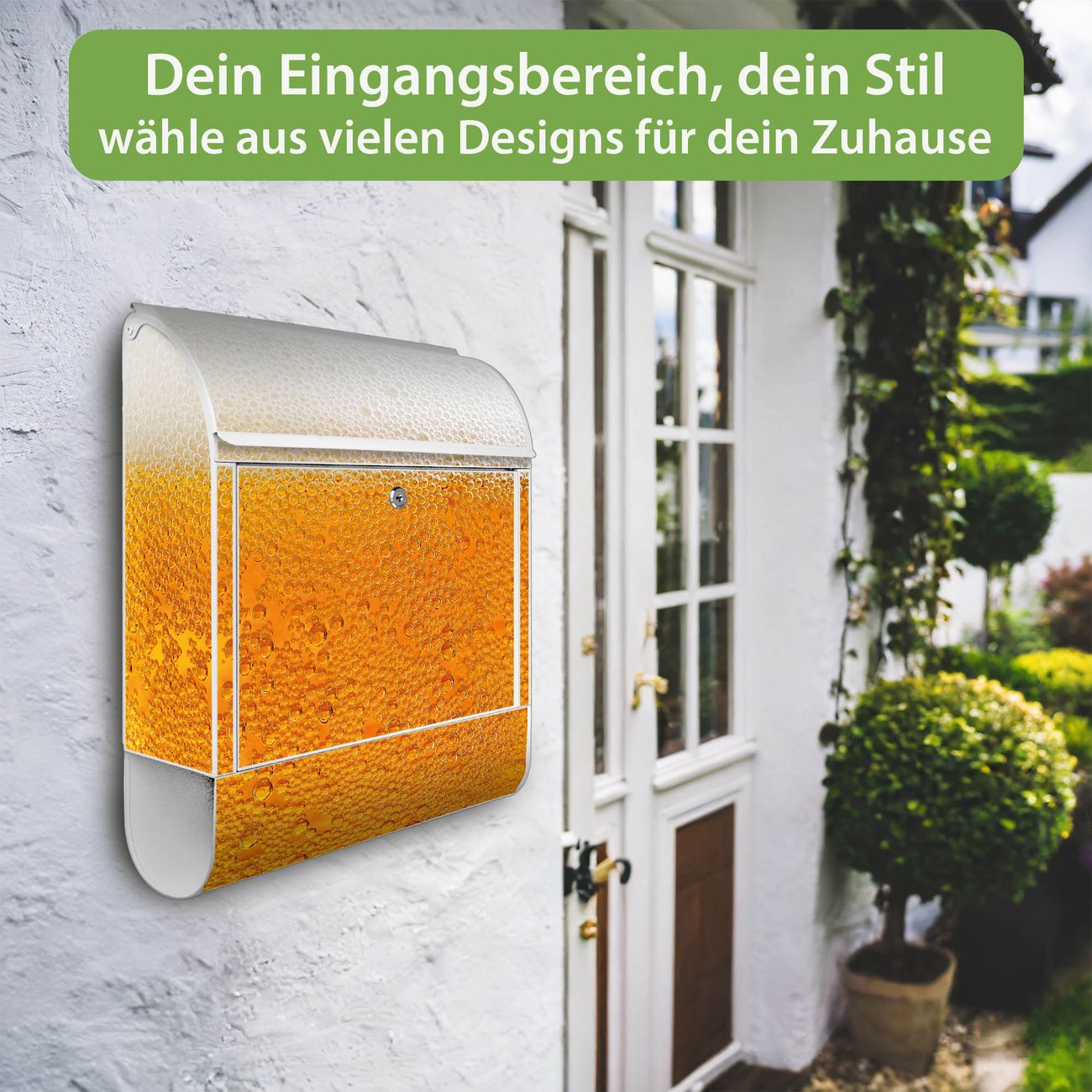 Motiv Bier Nr. 10145 Material weiß pulverbeschichtetes Stahlblech Dekorfolie UV-beständig, wetterfest Gesamtgröße 38x47x13cm BxHxT Briefschlitz 33x3,5cm BxH Gewicht ca. 3,5 kg Zubehör Montagezubehör, 2 Schlüssel, Bohrschablone