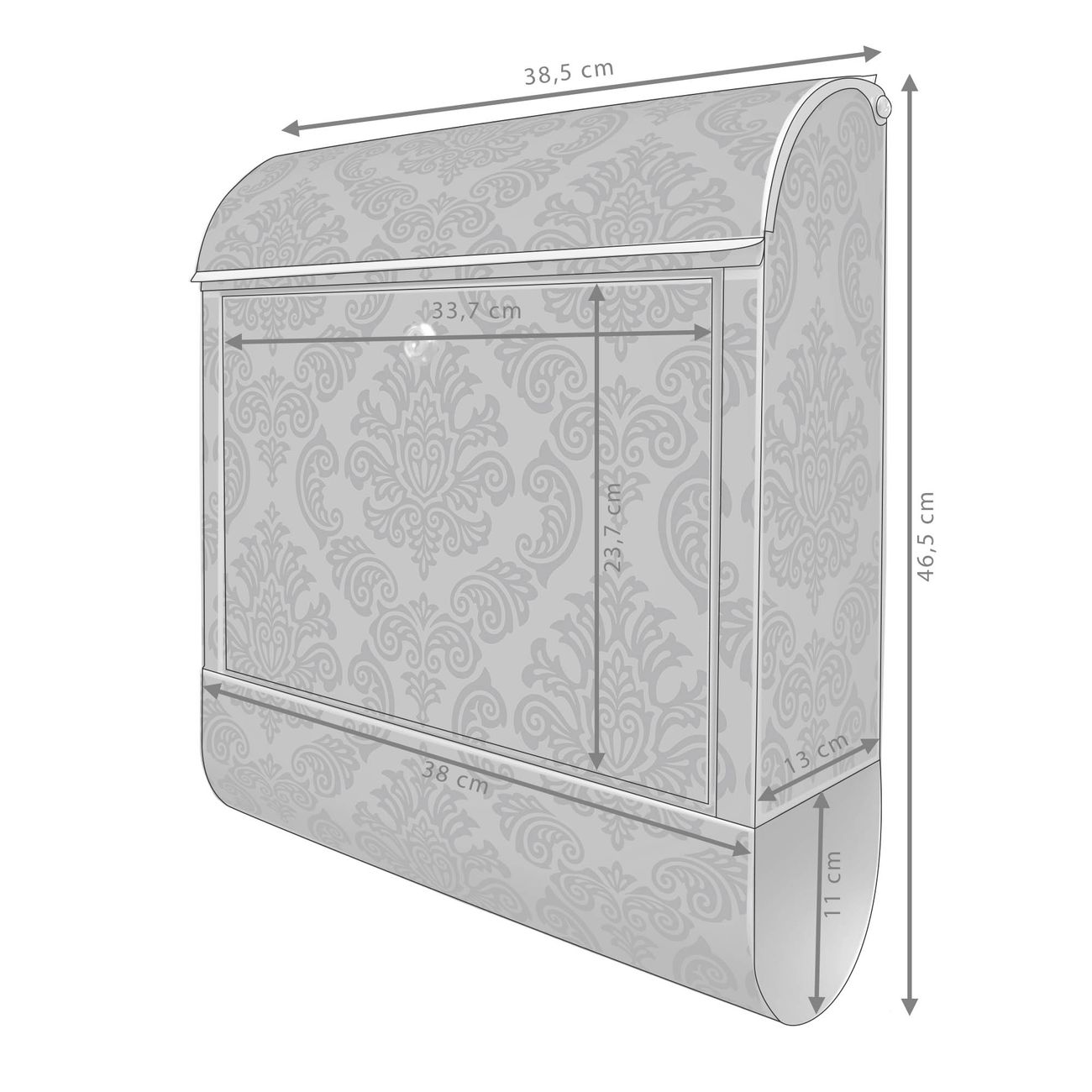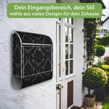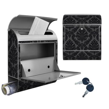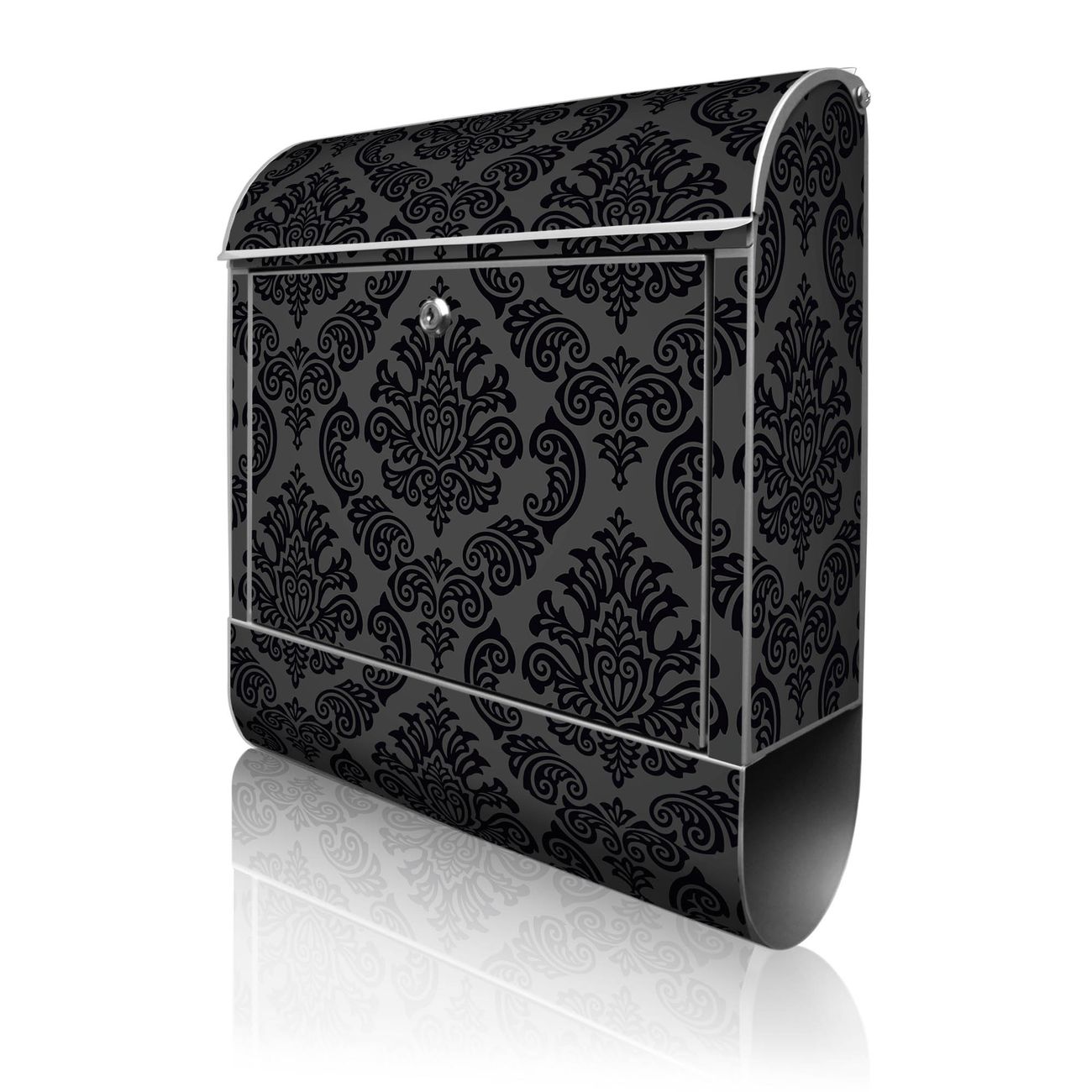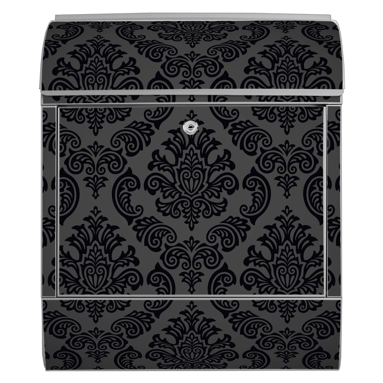 Motiv Black Deluxe Nr. 10199 Material silber pulverbeschichtetes Stahlblech Dekorfolie UV-beständig, wetterfest Gesamtgröße 38x47x13cm BxHxT Briefschlitz 33x3,5cm BxH Gewicht ca. 3,5 kg Zubehör Montagezubehör, 2 Schlüssel, Bohrschablone