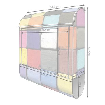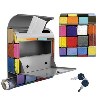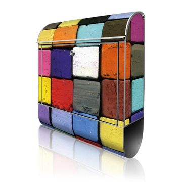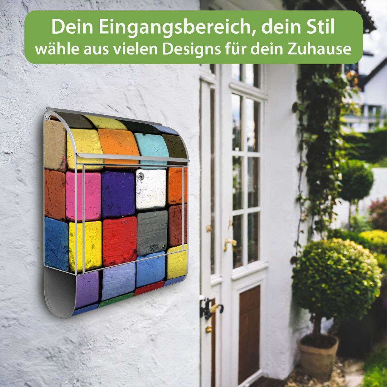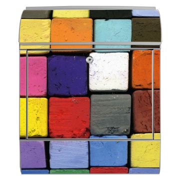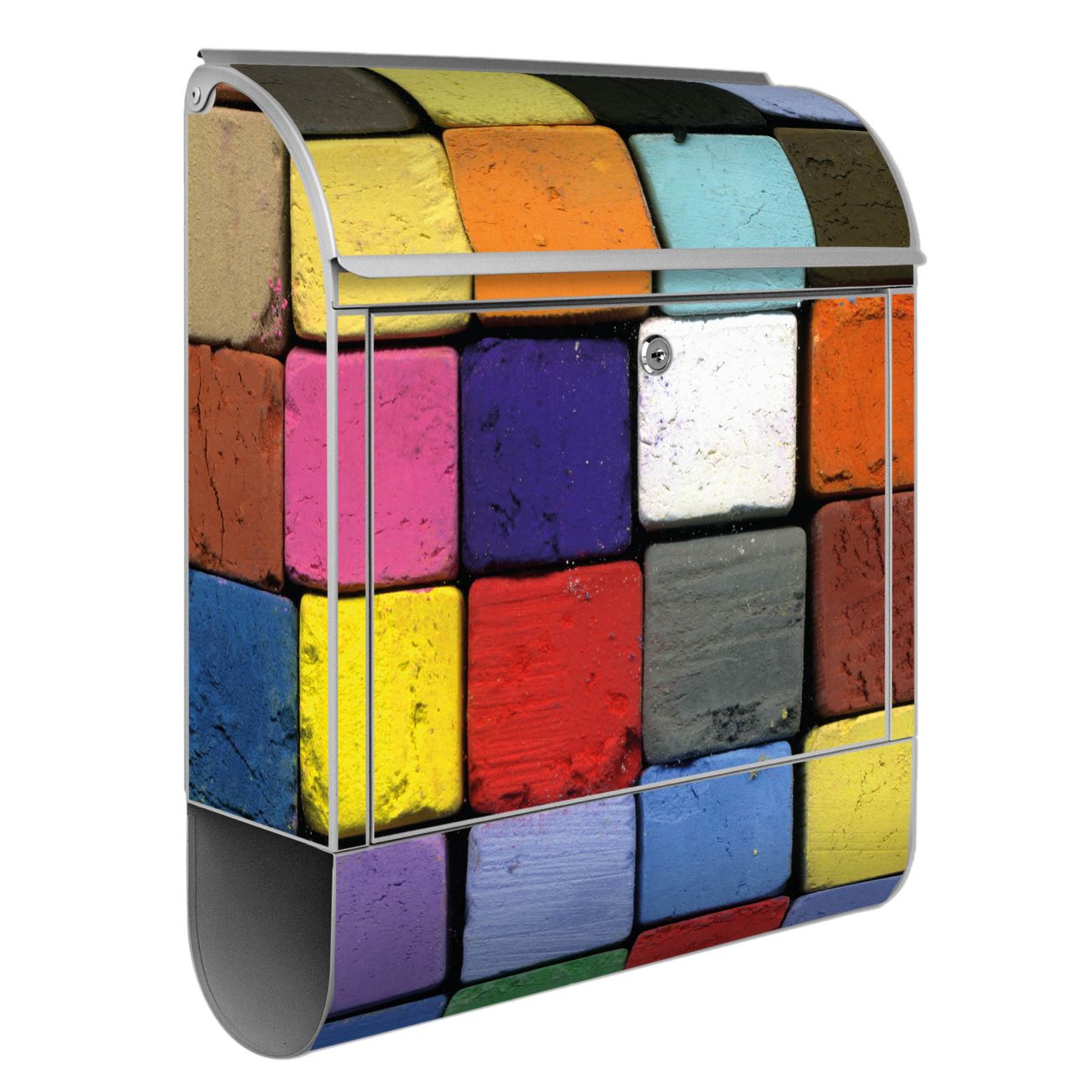 Motiv Bunte Kreide Nr. 10185 Material silber pulverbeschichtetes Stahlblech Dekorfolie UV-beständig, wetterfest Gesamtgröße 38x47x13cm BxHxT Briefschlitz 33x3,5cm BxH Gewicht ca. 3,5 kg Zubehör Montagezubehör, 2 Schlüssel, Bohrschablone