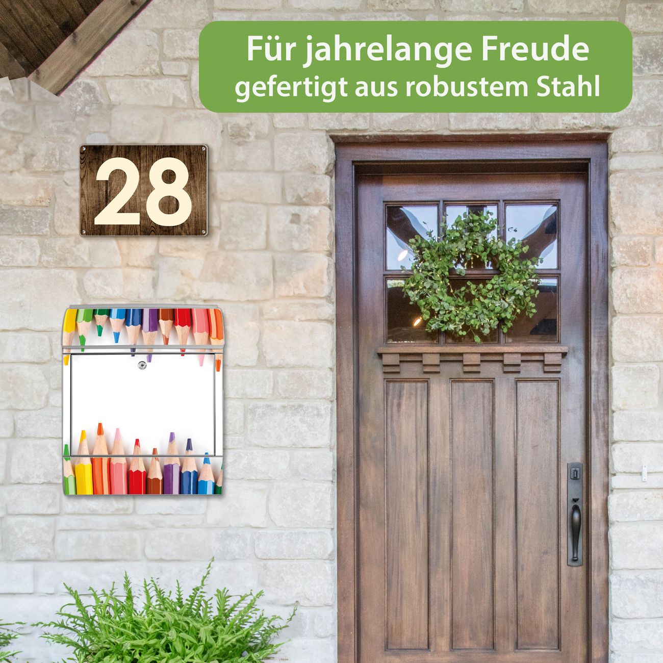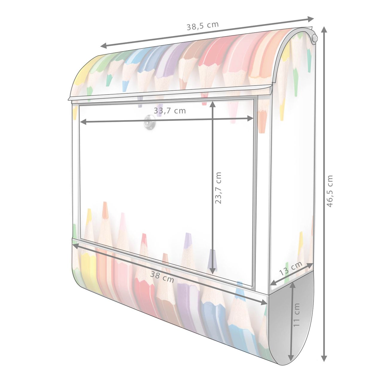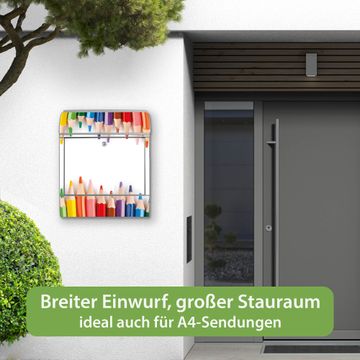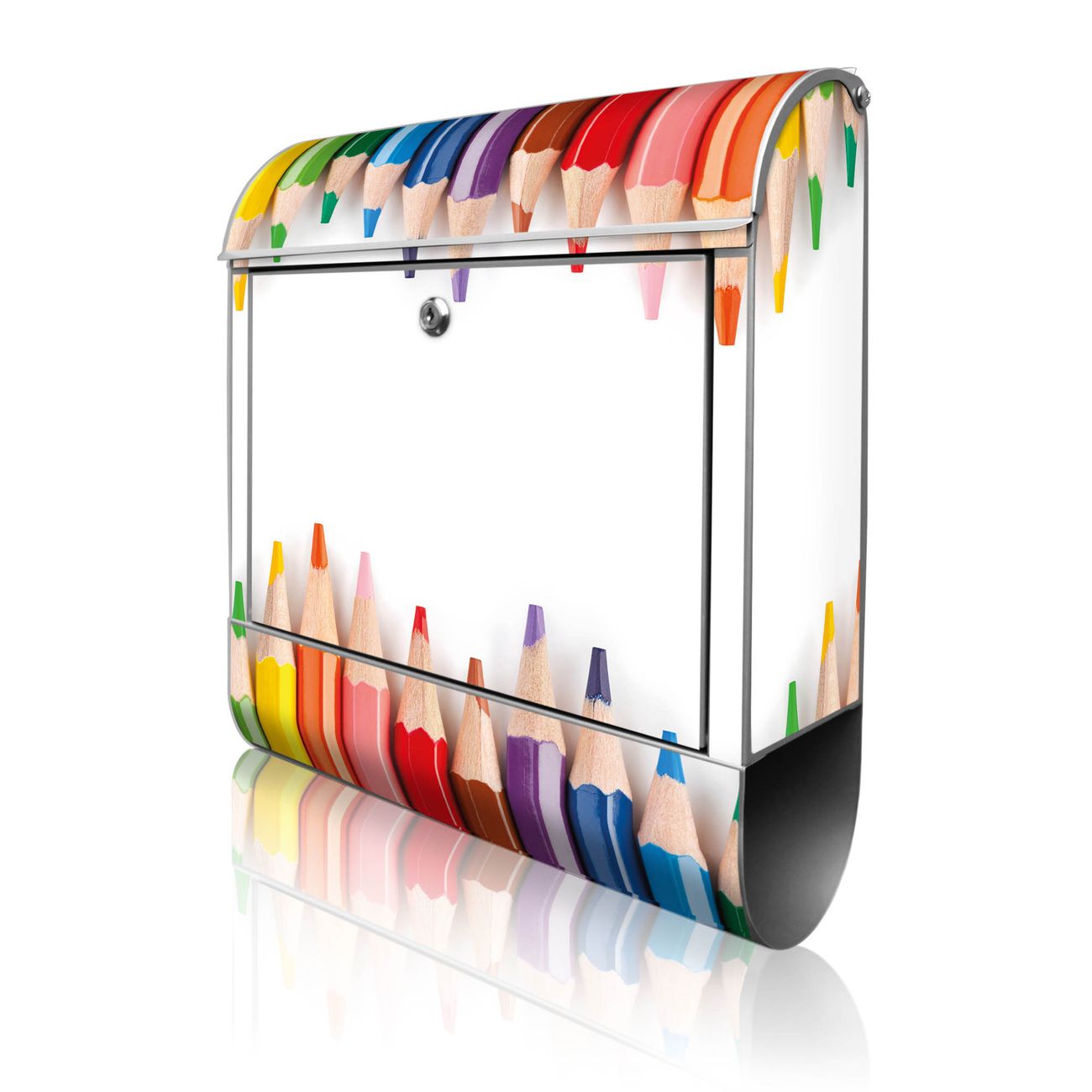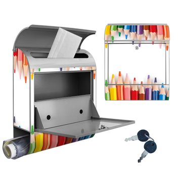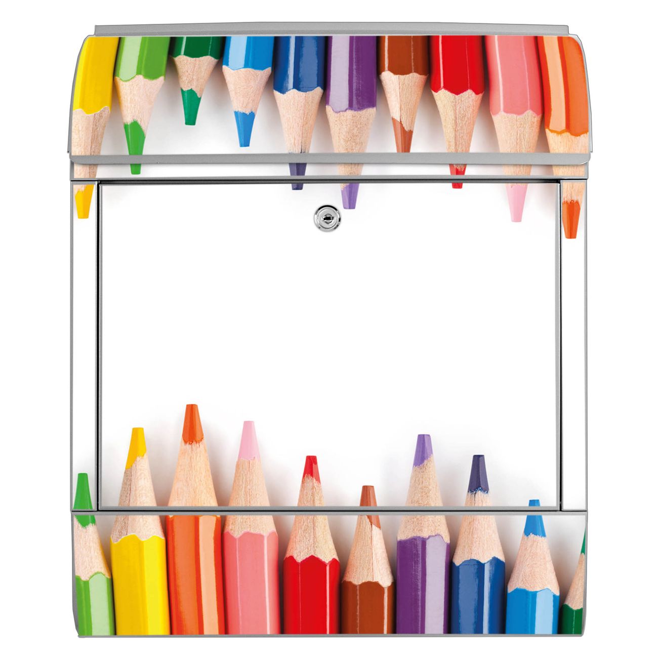 Motiv Buntstifte Nr. 10052 Material silber pulverbeschichtetes Stahlblech Dekorfolie UV-beständig, wetterfest Gesamtgröße 38x47x13cm BxHxT Briefschlitz 33x3,5cm BxH Gewicht ca. 3,5 kg Zubehör Montagezubehör, 2 Schlüssel, Bohrschablone