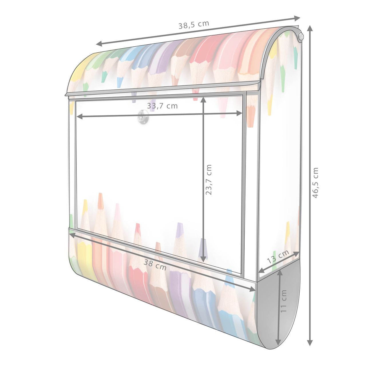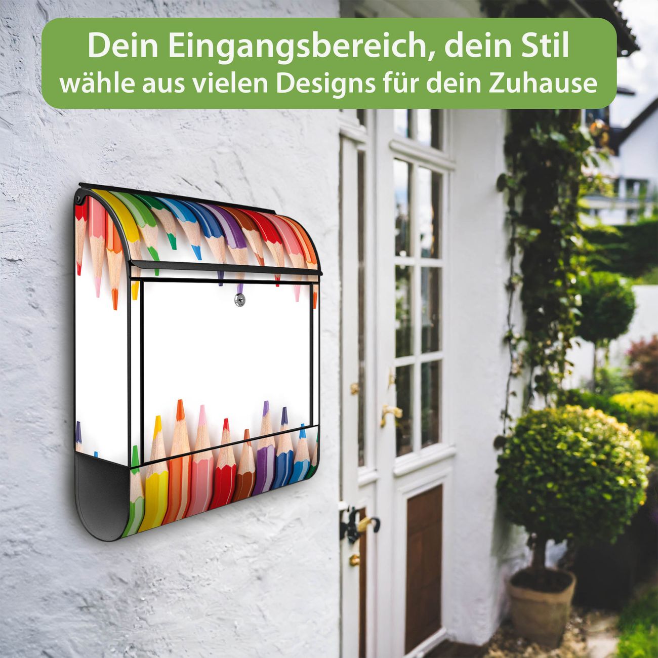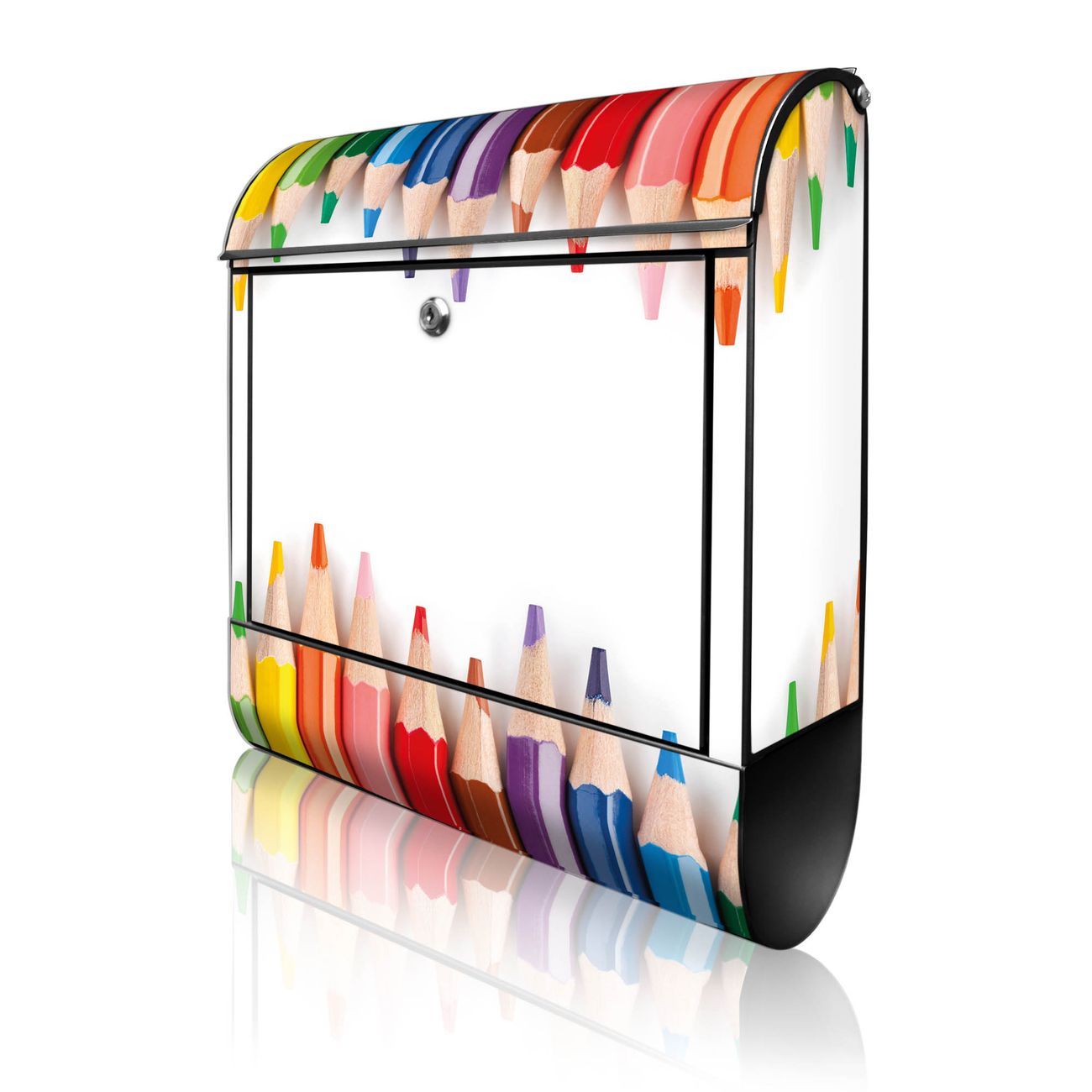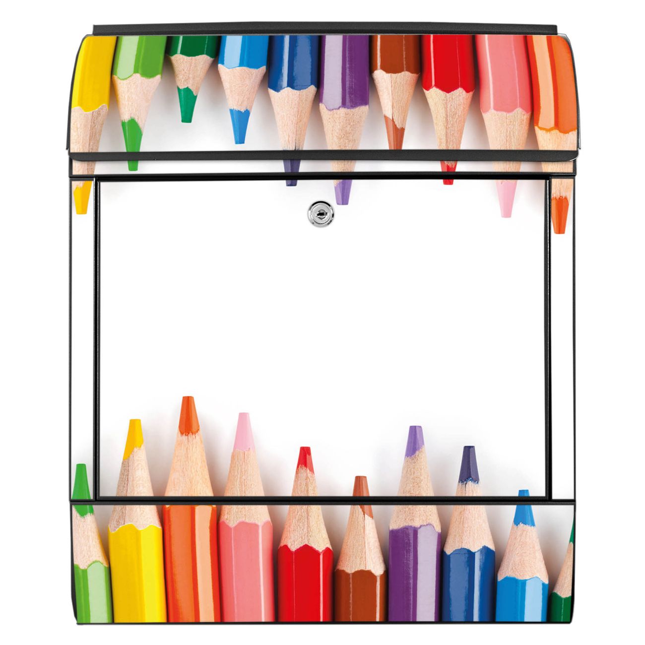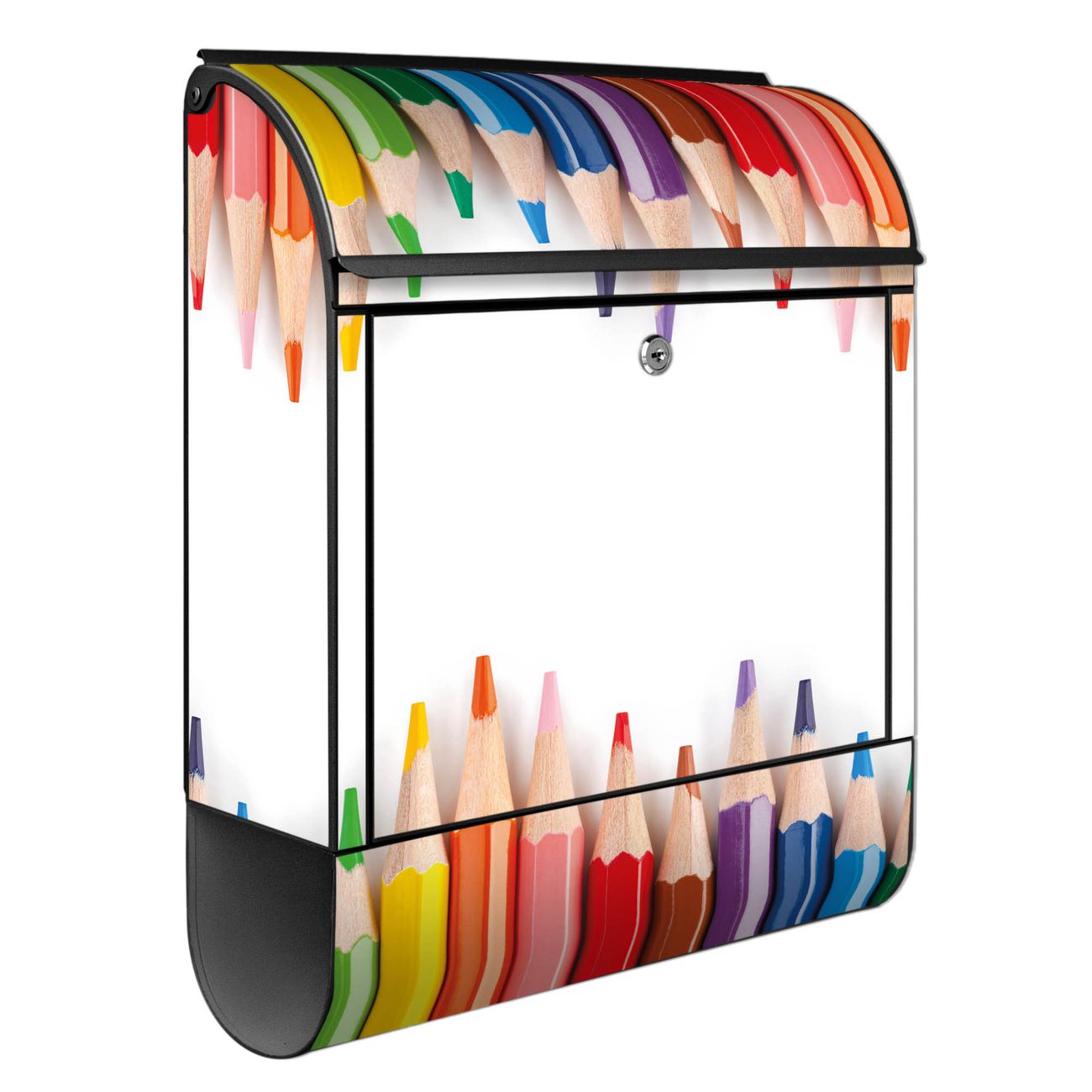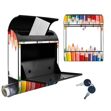 Motiv Buntstifte Nr. 10052 Material schwarz pulverbeschichtetes Stahlblech Dekorfolie UV-beständig, wetterfest Gesamtgröße 38x47x13cm BxHxT Briefschlitz 33x3,5cm BxH Gewicht ca. 3,5 kg Zubehör Montagezubehör, 2 Schlüssel, Bohrschablone