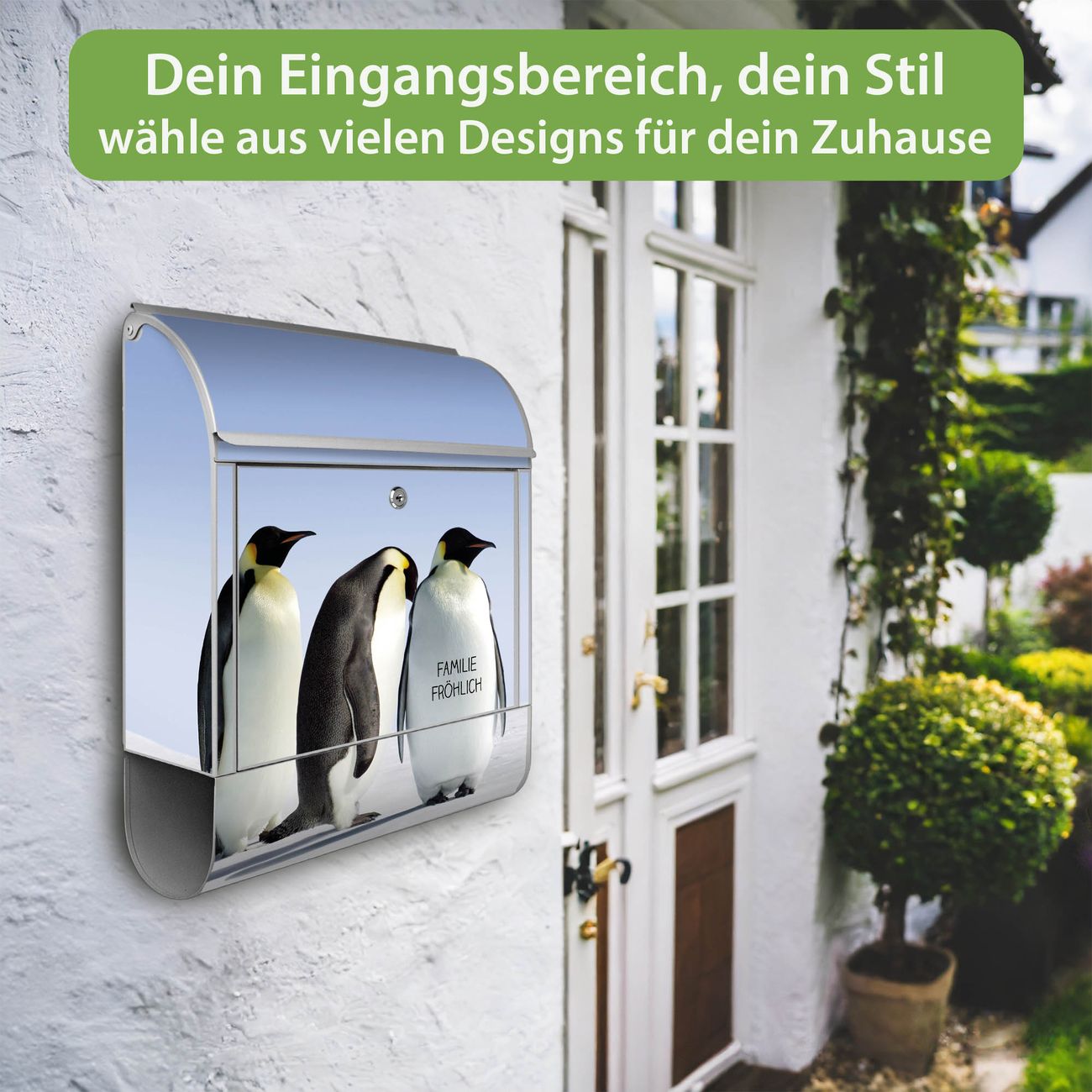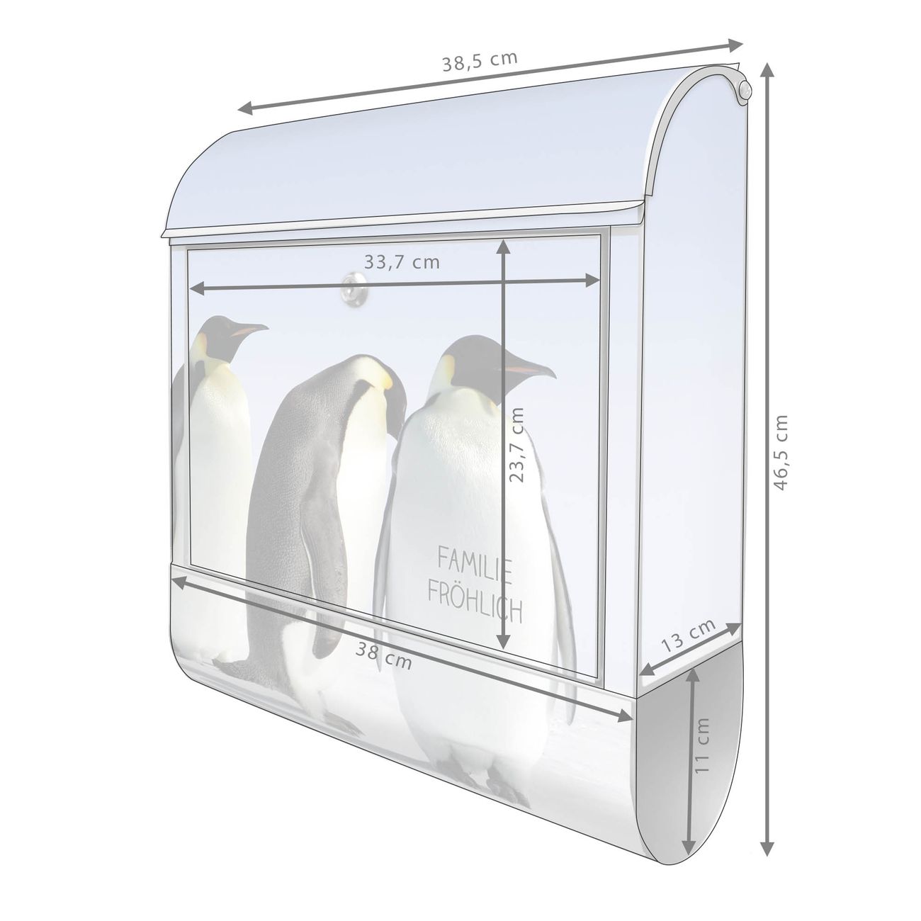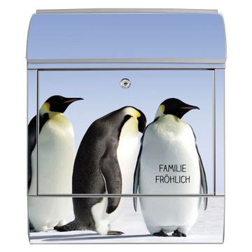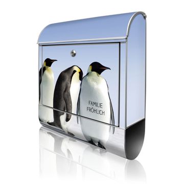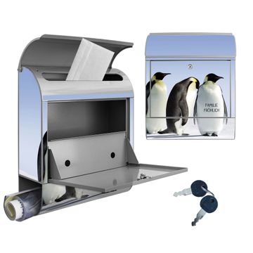 Motiv Catch Up Nr. 10181 Material silber pulverbeschichtetes Stahlblech Dekorfolie UV-beständig, wetterfest Gesamtgröße 38x47x13cm BxHxT Briefschlitz 33x3,5cm BxH Gewicht ca. 3,5 kg Zubehör Montagezubehör, 2 Schlüssel, Bohrschablone