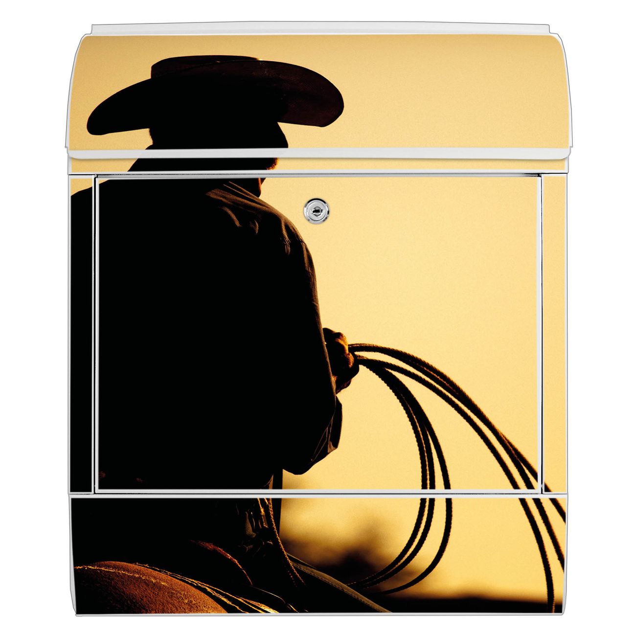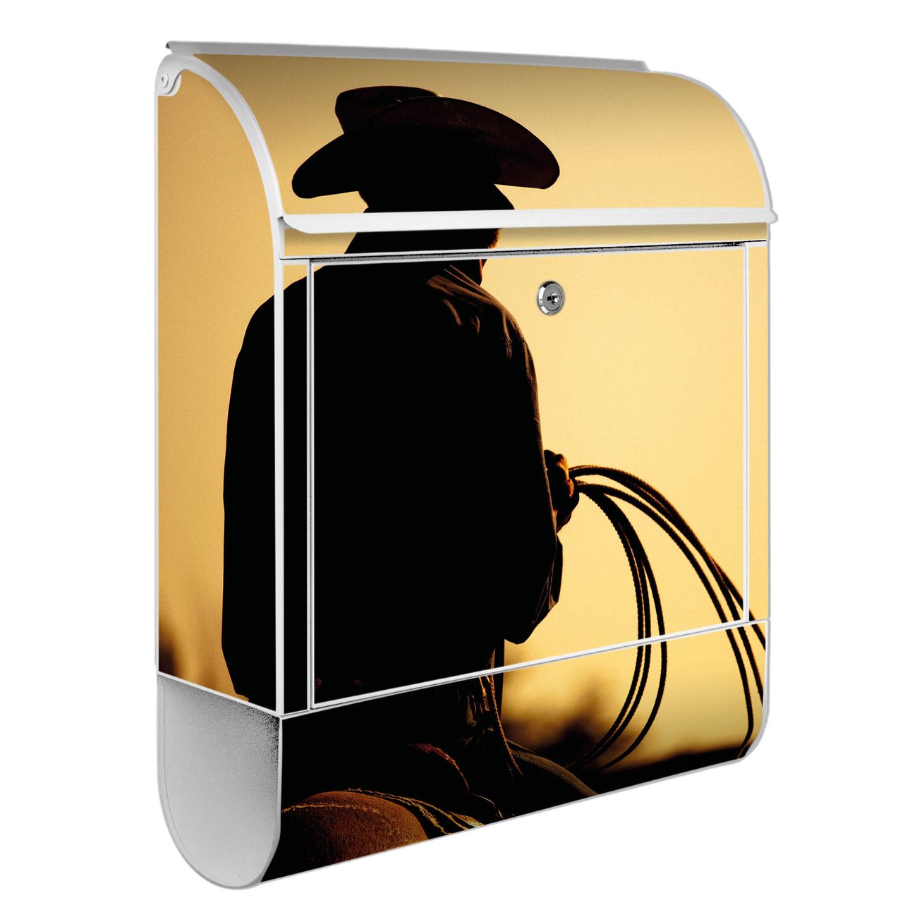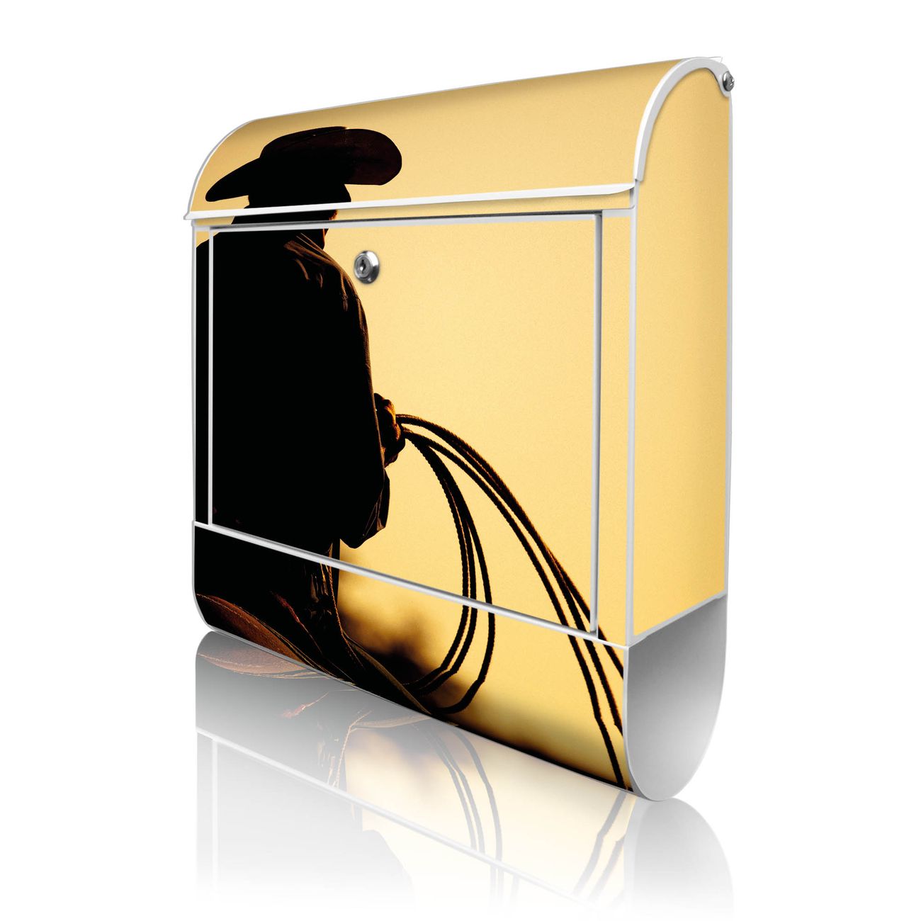 Motiv Cowboy Nr. 10295 Material weiß pulverbeschichtetes Stahlblech Dekorfolie UV-beständig, wetterfest Gesamtgröße 38x47x13cm BxHxT Briefschlitz 33x3,5cm BxH Gewicht ca. 3,5 kg Zubehör Montagezubehör, 2 Schlüssel, Bohrschablone
