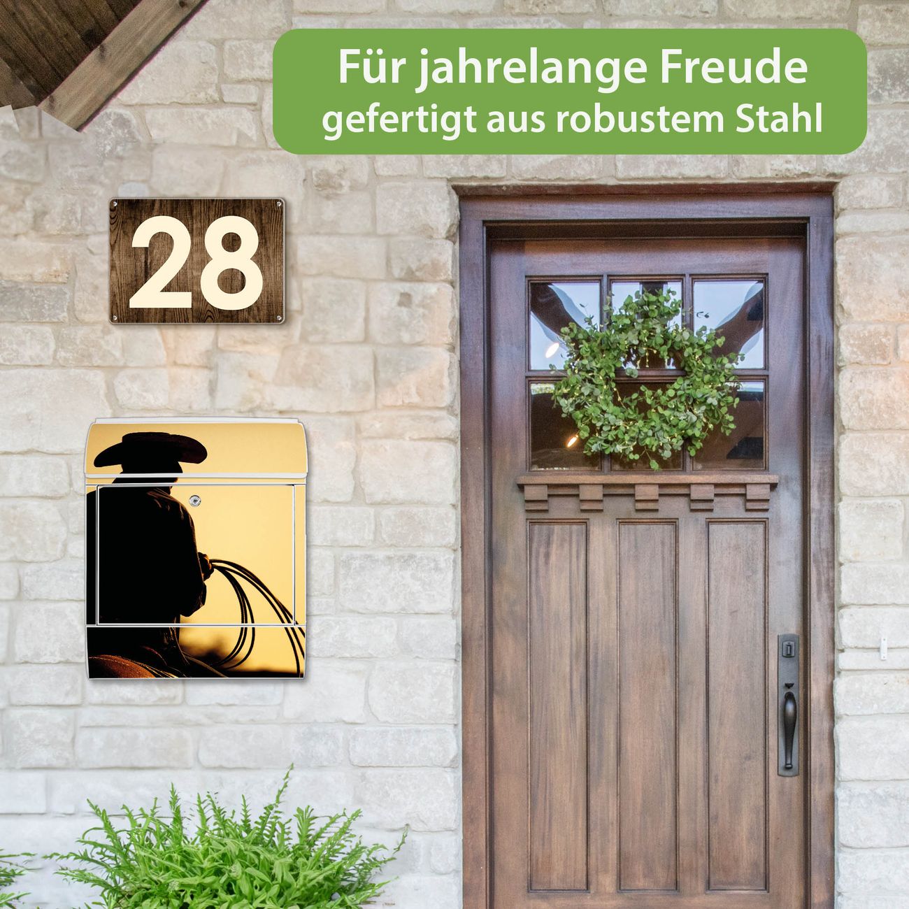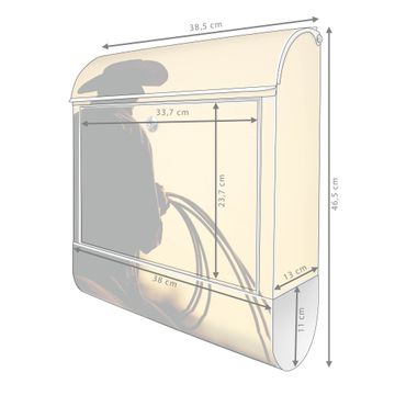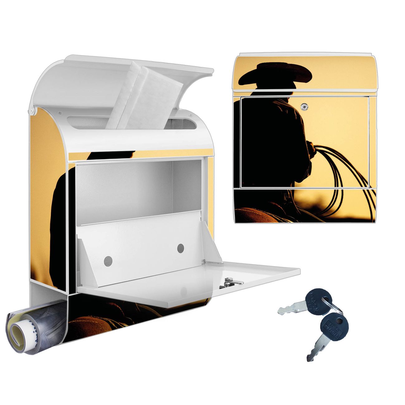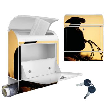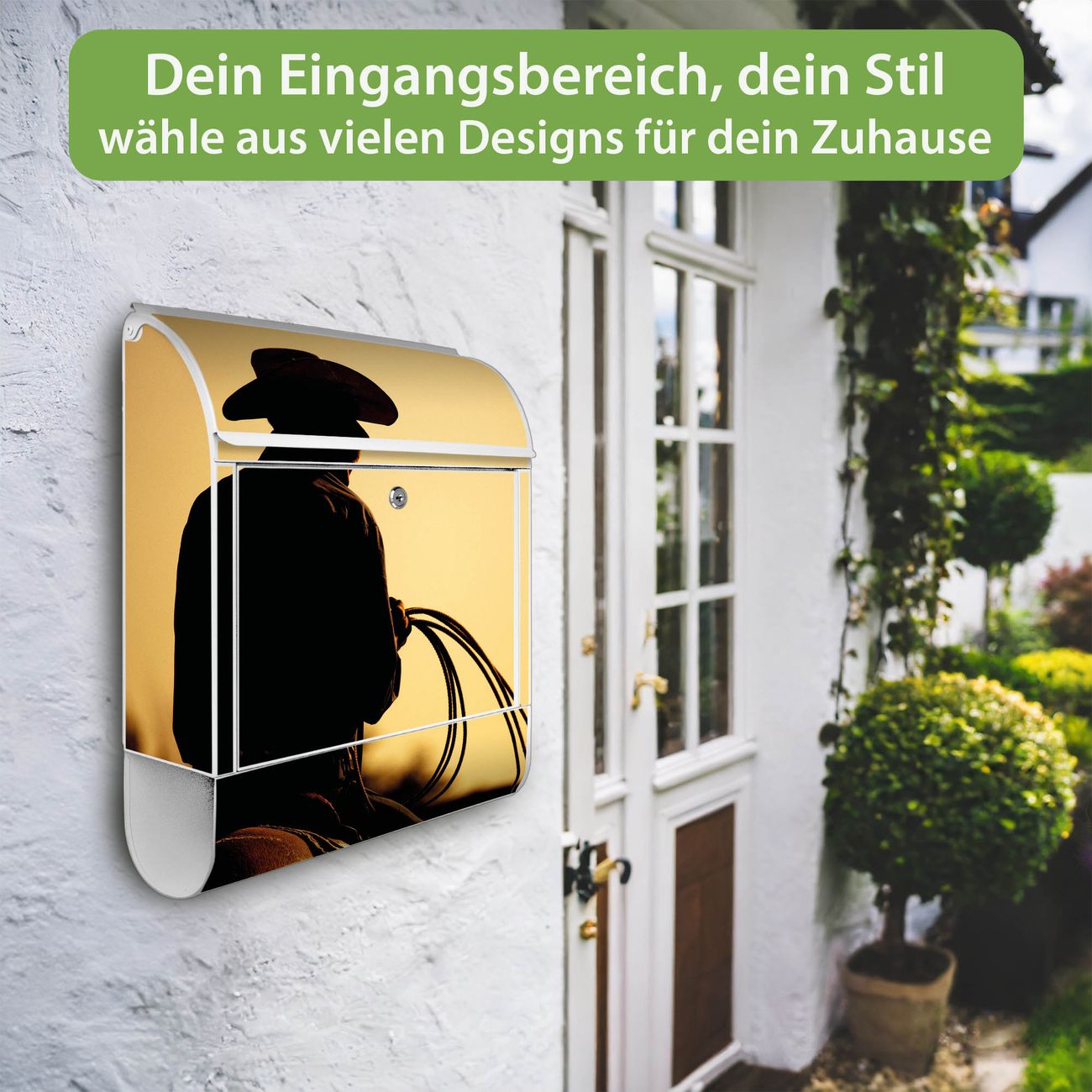 Motiv Cowboy Nr. 10295 Material weiß pulverbeschichtetes Stahlblech Dekorfolie UV-beständig, wetterfest Gesamtgröße 38x47x13cm BxHxT Briefschlitz 33x3,5cm BxH Gewicht ca. 3,5 kg Zubehör Montagezubehör, 2 Schlüssel, Bohrschablone
