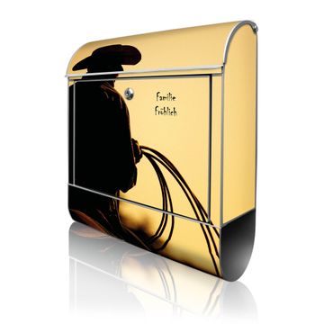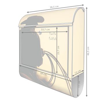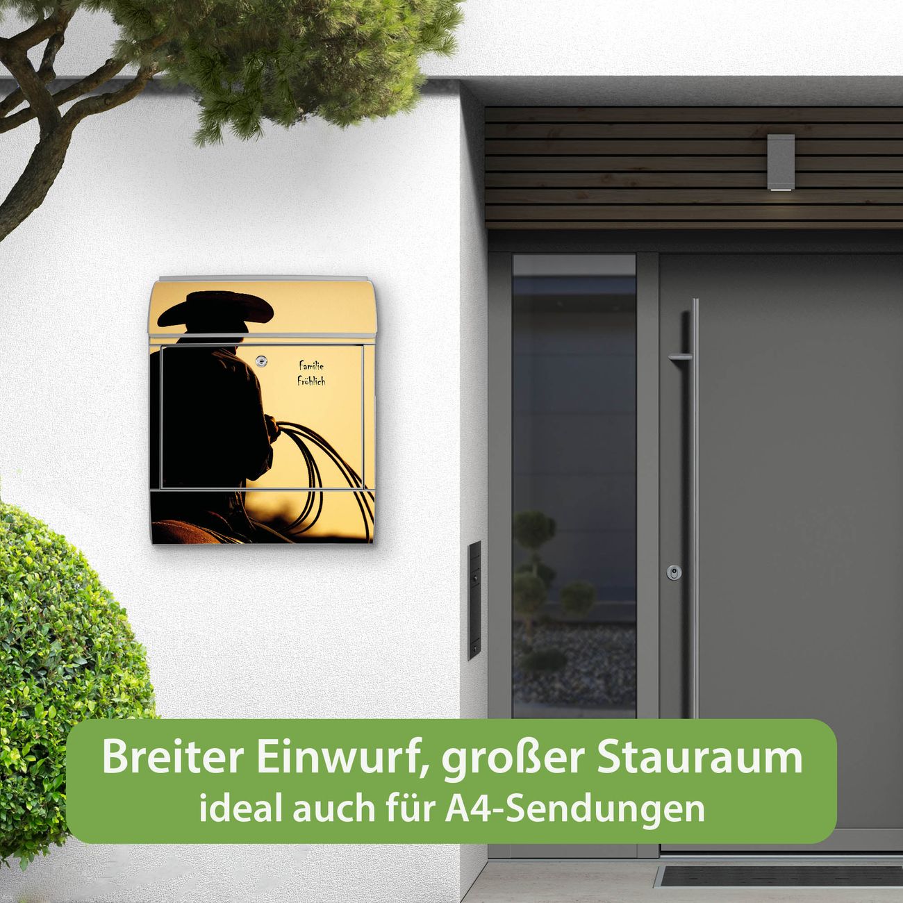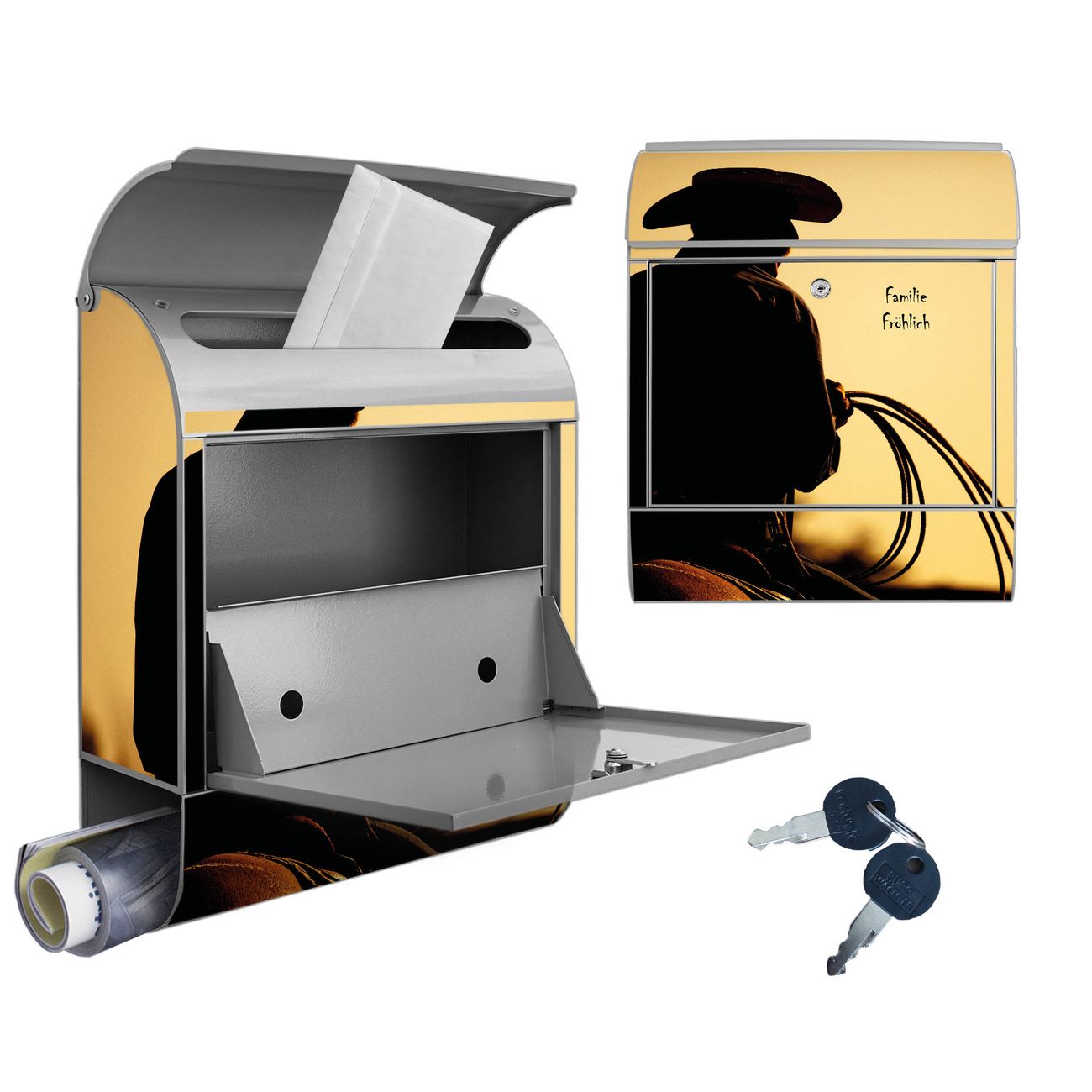 Motiv Cowboy Nr. 10295 Material: silber-grau pulverbeschichtetes Stahlblech Dekorfolie: UV-beständig, wetterfest Gesamtgröße: 38x46x12,5cm BxHxT Briefschlitz: 33x3,5cm BxH Gewicht: ca. 3,4 kg Zubehör: Montagezubehör, 2 Schlüssel, Bohrschablone
