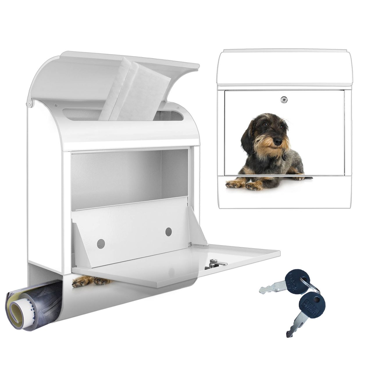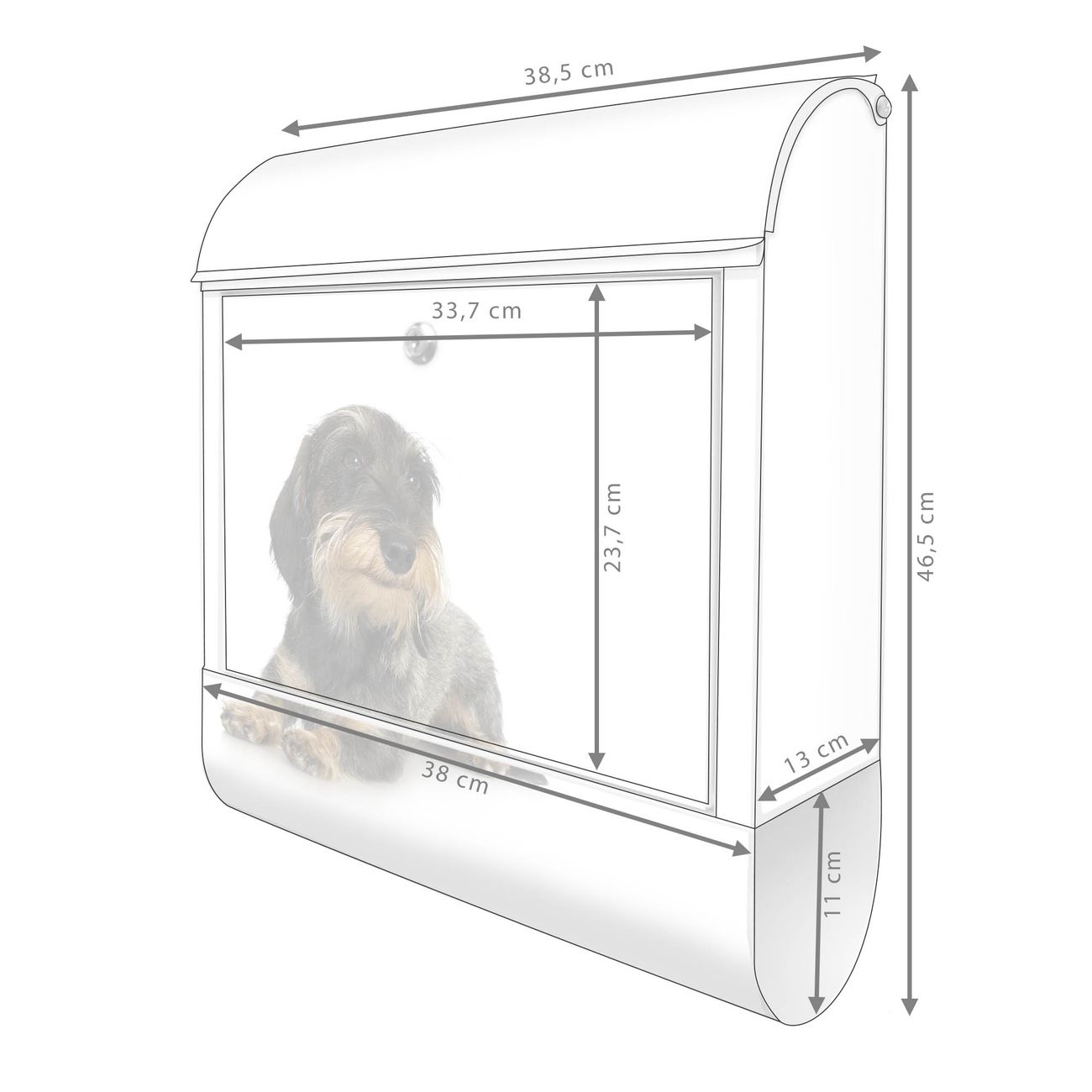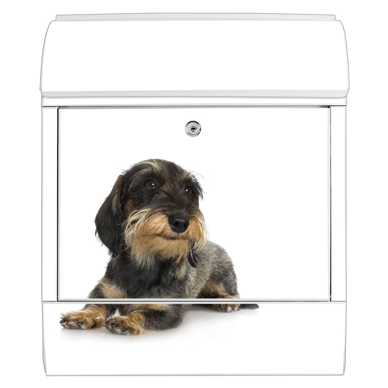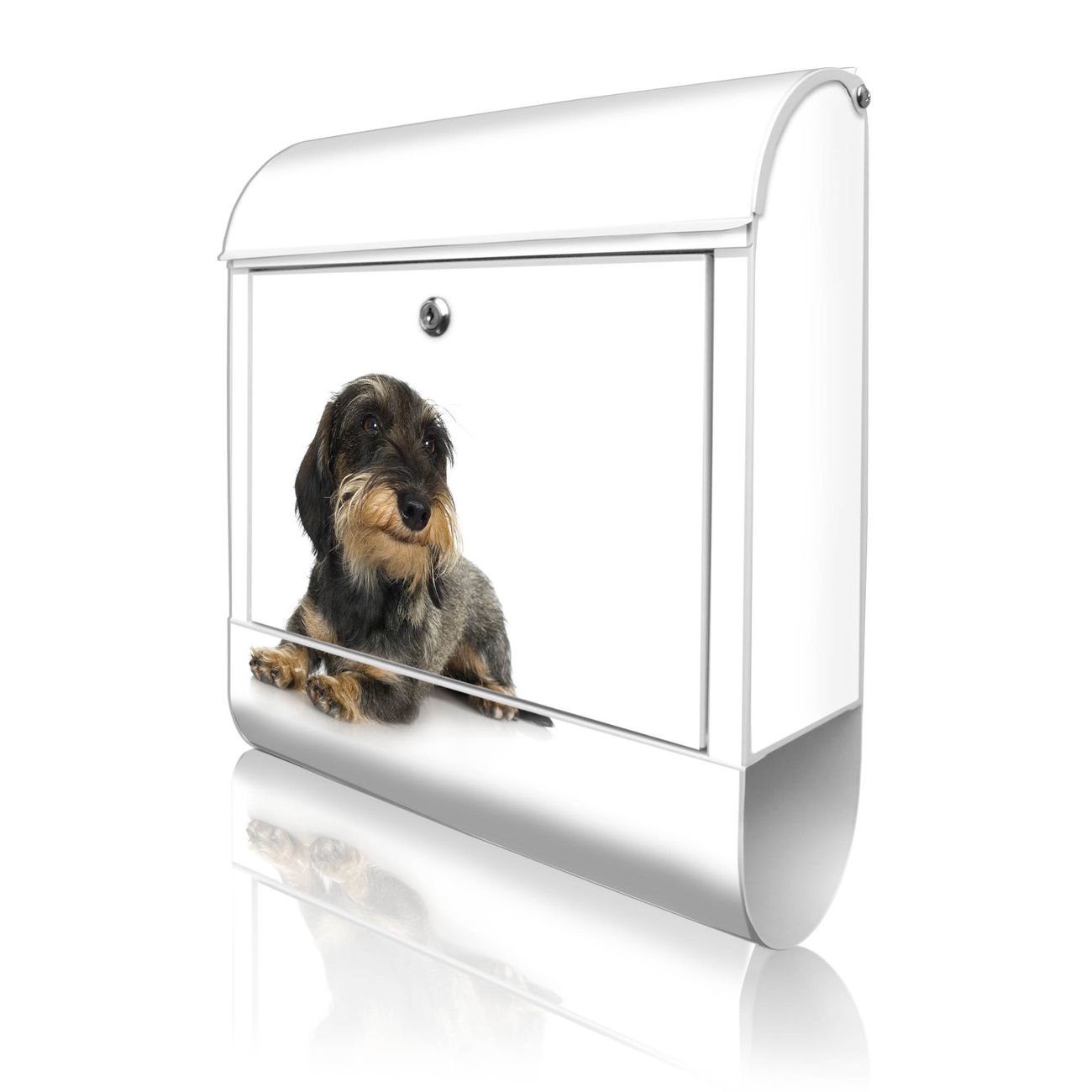Motiv Dackel Nr. 10150 Material weiß pulverbeschichtetes Stahlblech Dekorfolie UV-beständig, wetterfest Gesamtgröße 38x47x13cm BxHxT Briefschlitz 33x3,5cm BxH Gewicht ca. 3,5 kg Zubehör Montagezubehör, 2 Schlüssel, Bohrschablone