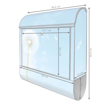 Motiv Dandelion Nr. 10174 Material schwarz pulverbeschichtetes Stahlblech Dekorfolie UV-beständig, wetterfest Gesamtgröße 38x47x13cm BxHxT Briefschlitz 33x3,5cm BxH Gewicht ca. 3,5 kg Zubehör Montagezubehör, 2 Schlüssel, Bohrschablone