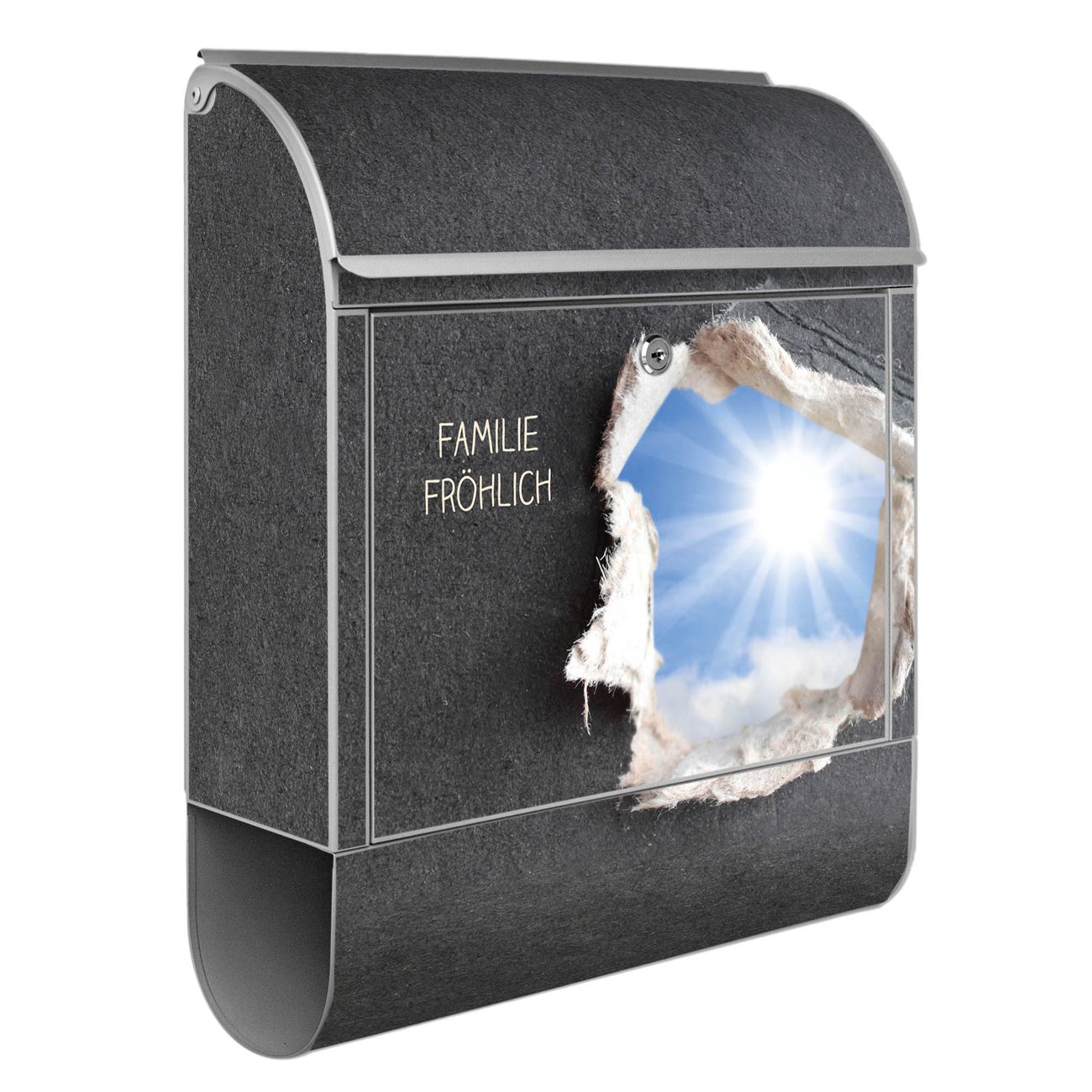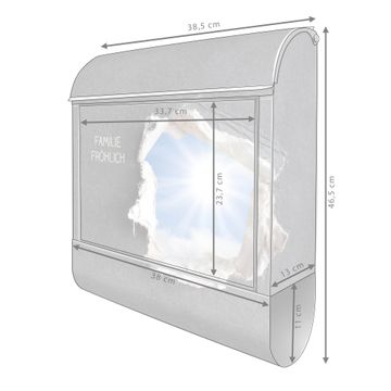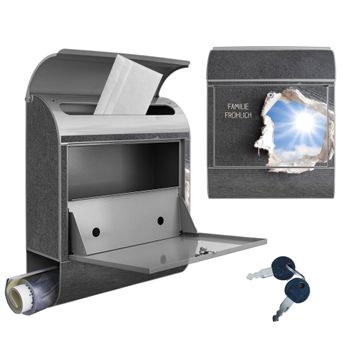 Motiv Durchblick Nr. 10197 Material silber pulverbeschichtetes Stahlblech Dekorfolie UV-beständig, wetterfest Gesamtgröße 38x47x13cm BxHxT Briefschlitz 33x3,5cm BxH Gewicht ca. 3,5 kg Zubehör Montagezubehör, 2 Schlüssel, Bohrschablone