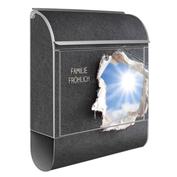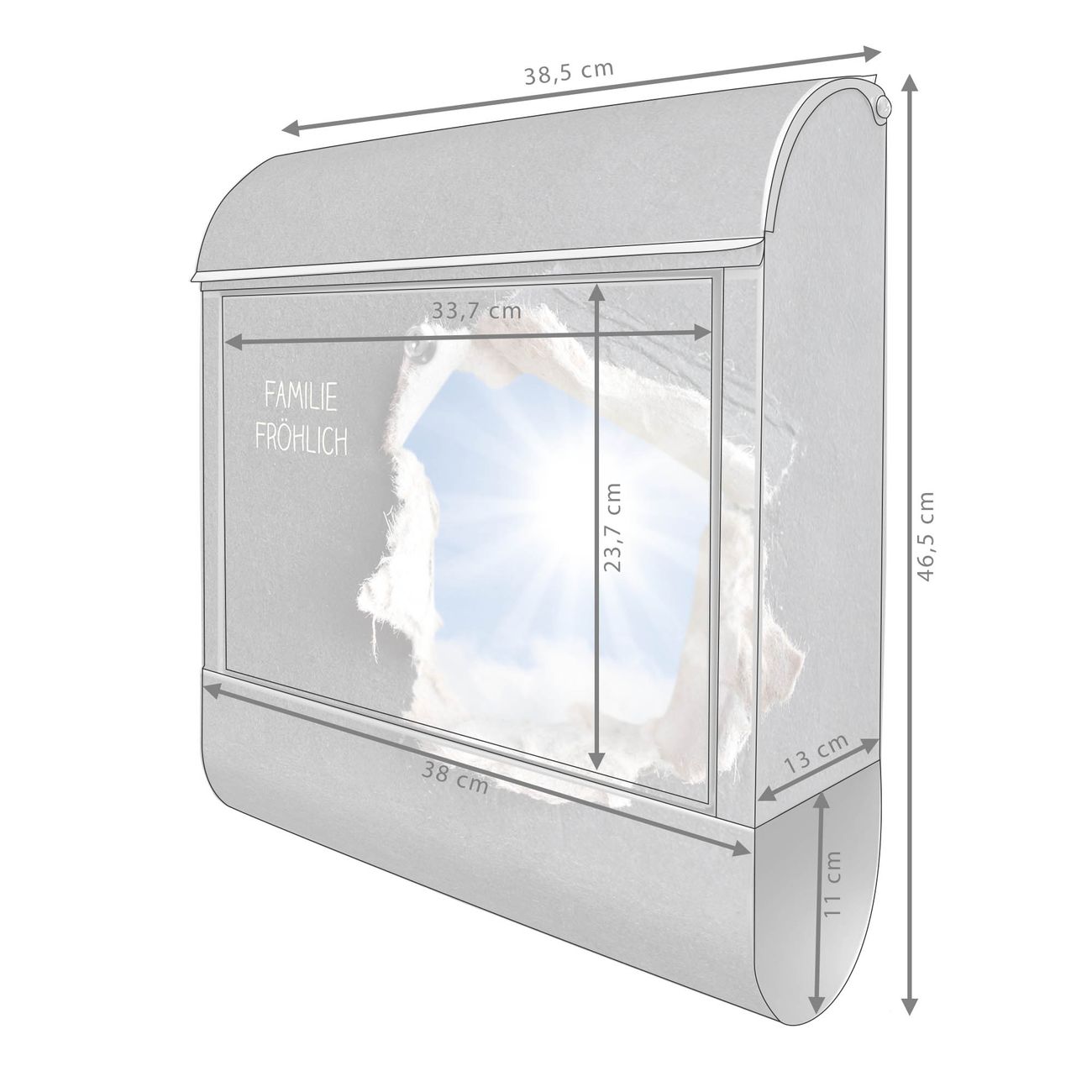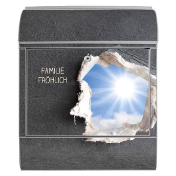 DESIGN: Der Postkasten mit Motiv Durchblick hat ein sehr ansprechendes und ausgefallenes Design, damit entlocken Sie Ihren Nachbarn und dem Postboten ein Lächeln. Heben Sie Sich von der tristen grauen Masse ab, ohne auf Funktionalität zu verzichten. DETAILS: Der Postkasten besteht aus pulverbeschichtetem Stahl. Er ist 38x46x12,5cm groß. Das Motiv besteht aus einer wetter- und UV-resistenten Folie, die mit einem Schutzlaminat überzogen ist, sodass der Briefkasten zusätzlich vor Kratzern geschützt ist. Der Briefkasten wird mit Montagematerial, zusätzlich zwei Schlüssel sowie einer Bohrschablone geliefert. NUTZEN: Sie können diesen Briefkasten sowohl als Wandbriefkasten montieren oder einen passenden Ständer kaufen und als Standbriefkasten einbetonieren. Die Größe bietet genügend Platz für Sendungen aller Art, der Einwurf fasst auch größere A4 Sendungen. BANJADO: Ihr Briefkasten wird in Sachsen in einer kleinen Manufaktur von Hand veredelt. Die Motivfolie ist lösungsmittelfrei und schutzlaminiert für einen langen Halt. Wir legen großen Wert auf die Verbindung von Funktionalität und Design. Sie erhalten Handarbeit aus Sachsen.