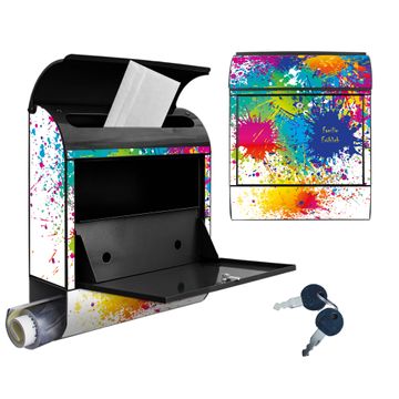 Motiv Farbspritzer Nr. 10308 Material: schwarz pulverbeschichtetes Stahlblech Dekorfolie: UV-beständig, wetterfest Gesamtgröße: 38x46x12,5cm BxHxT Briefschlitz: 33x3,5cm BxH Gewicht: ca. 3,4 kg Zubehör: Montagezubehör, 2 Schlüssel, Bohrschablone