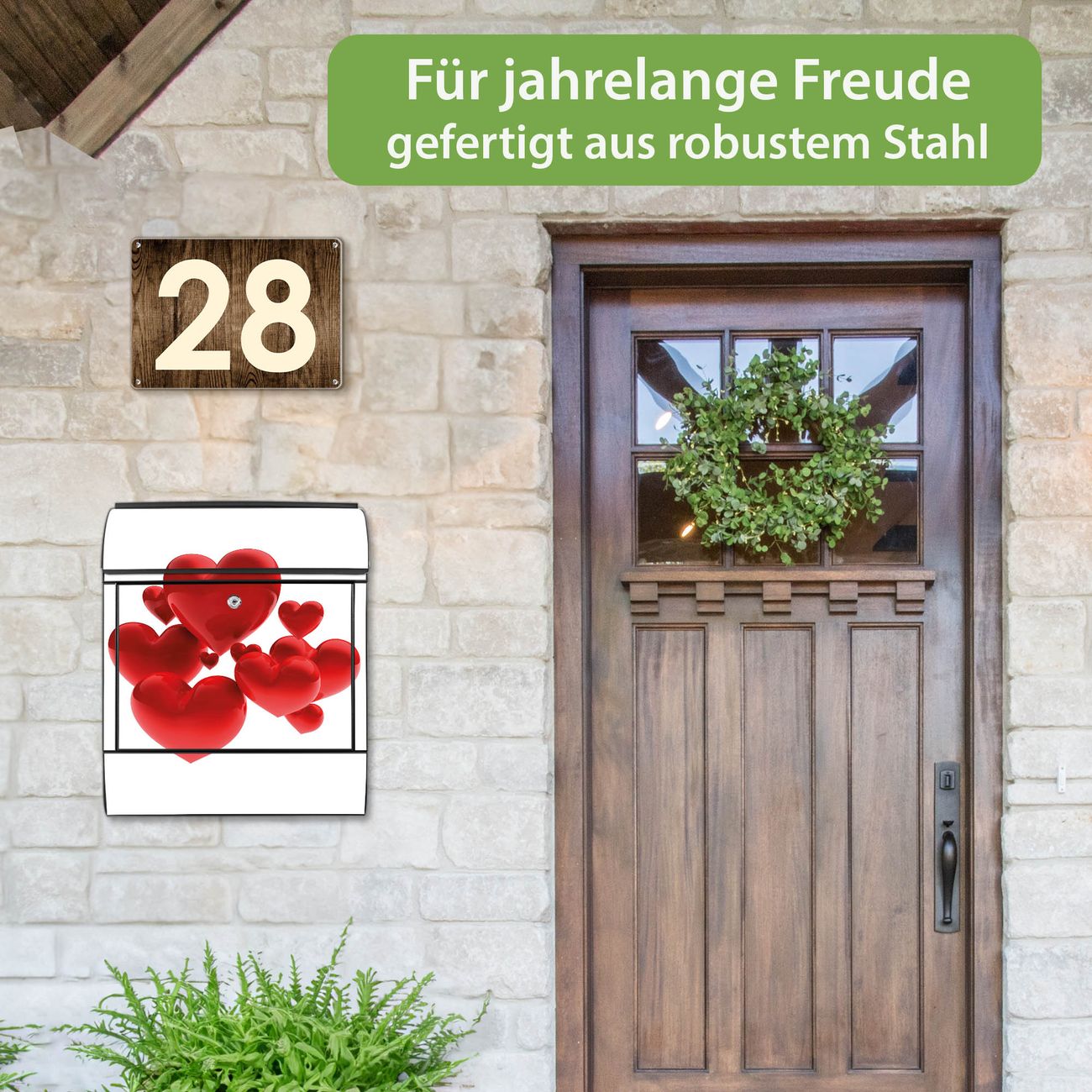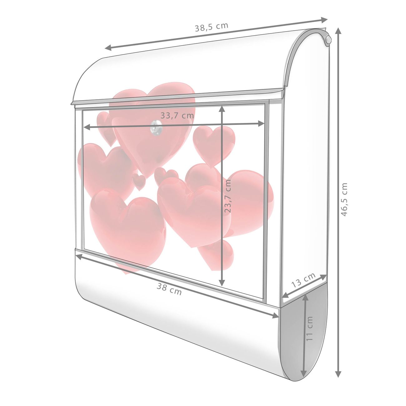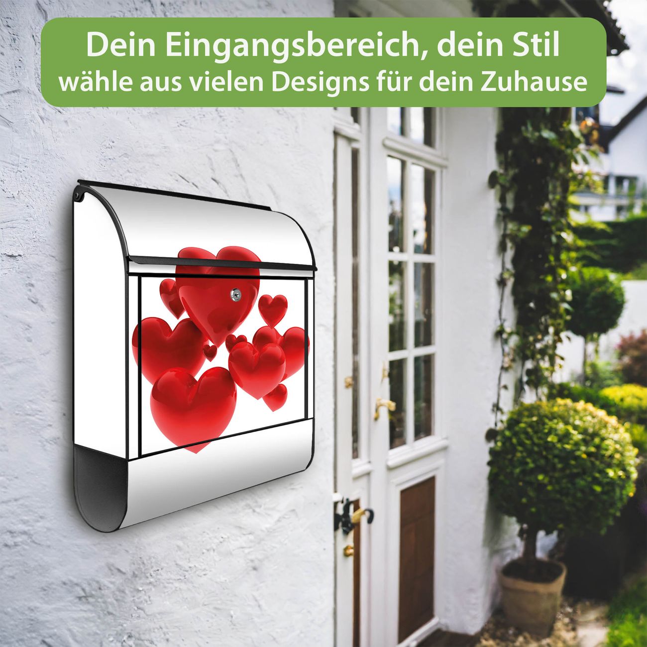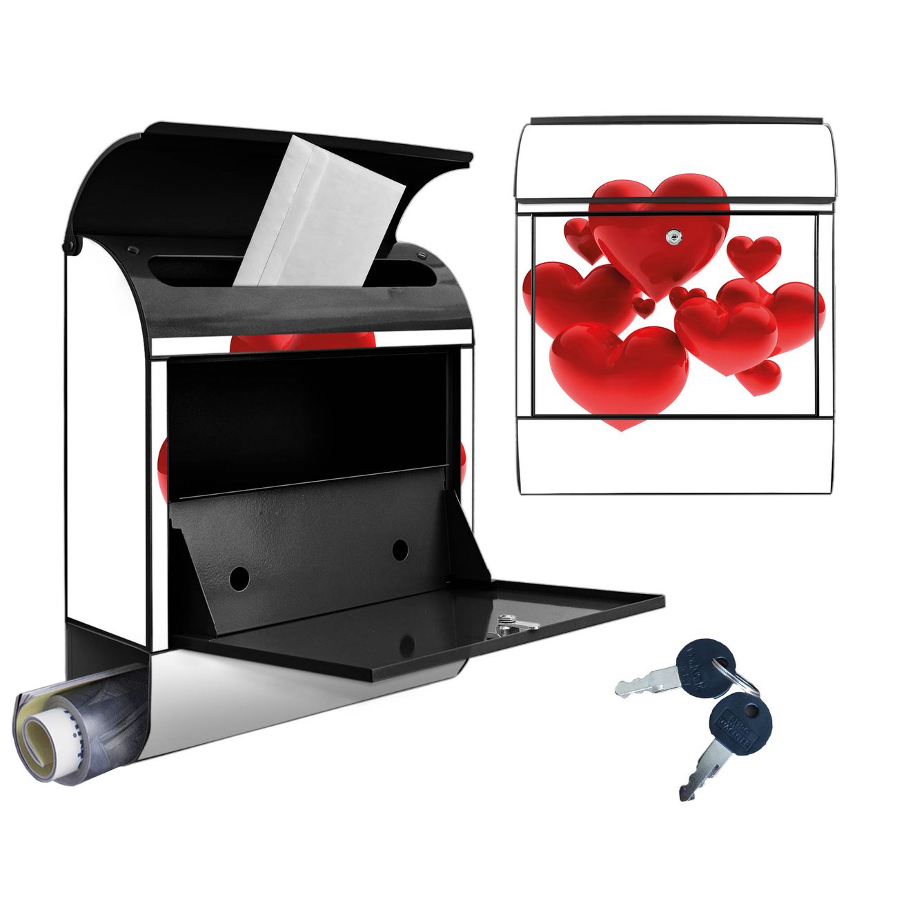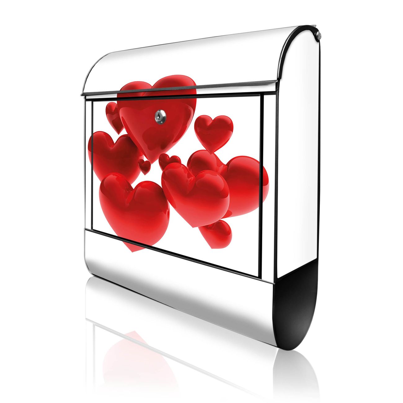 Motiv Fliegende Herzen Nr. 10228 Material schwarz pulverbeschichtetes Stahlblech Dekorfolie UV-beständig, wetterfest Gesamtgröße 38x47x13cm BxHxT Briefschlitz 33x3,5cm BxH Gewicht ca. 3,5 kg Zubehör Montagezubehör, 2 Schlüssel, Bohrschablone