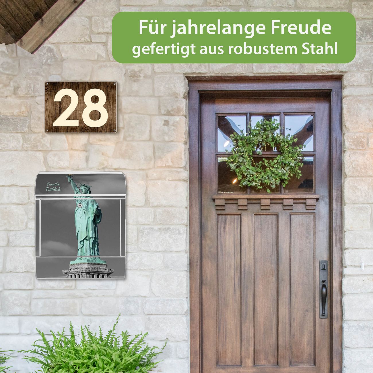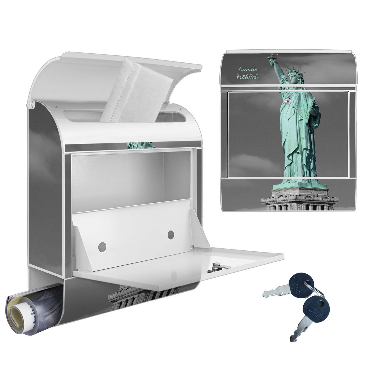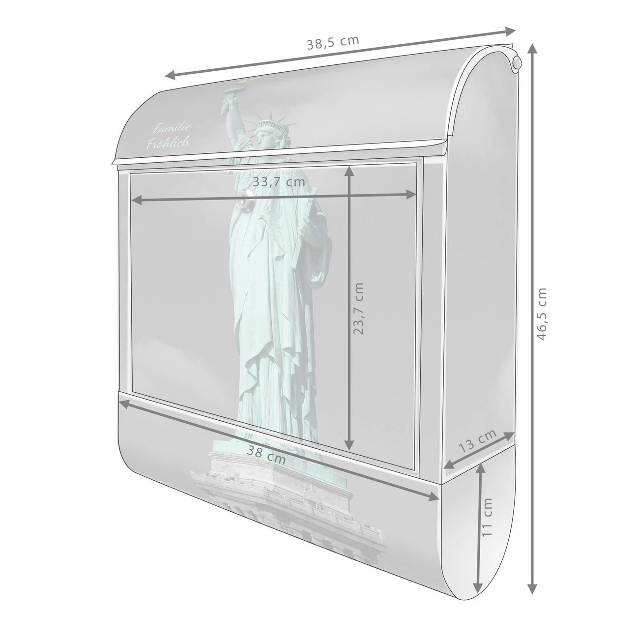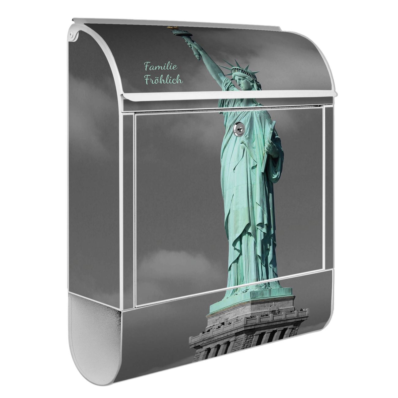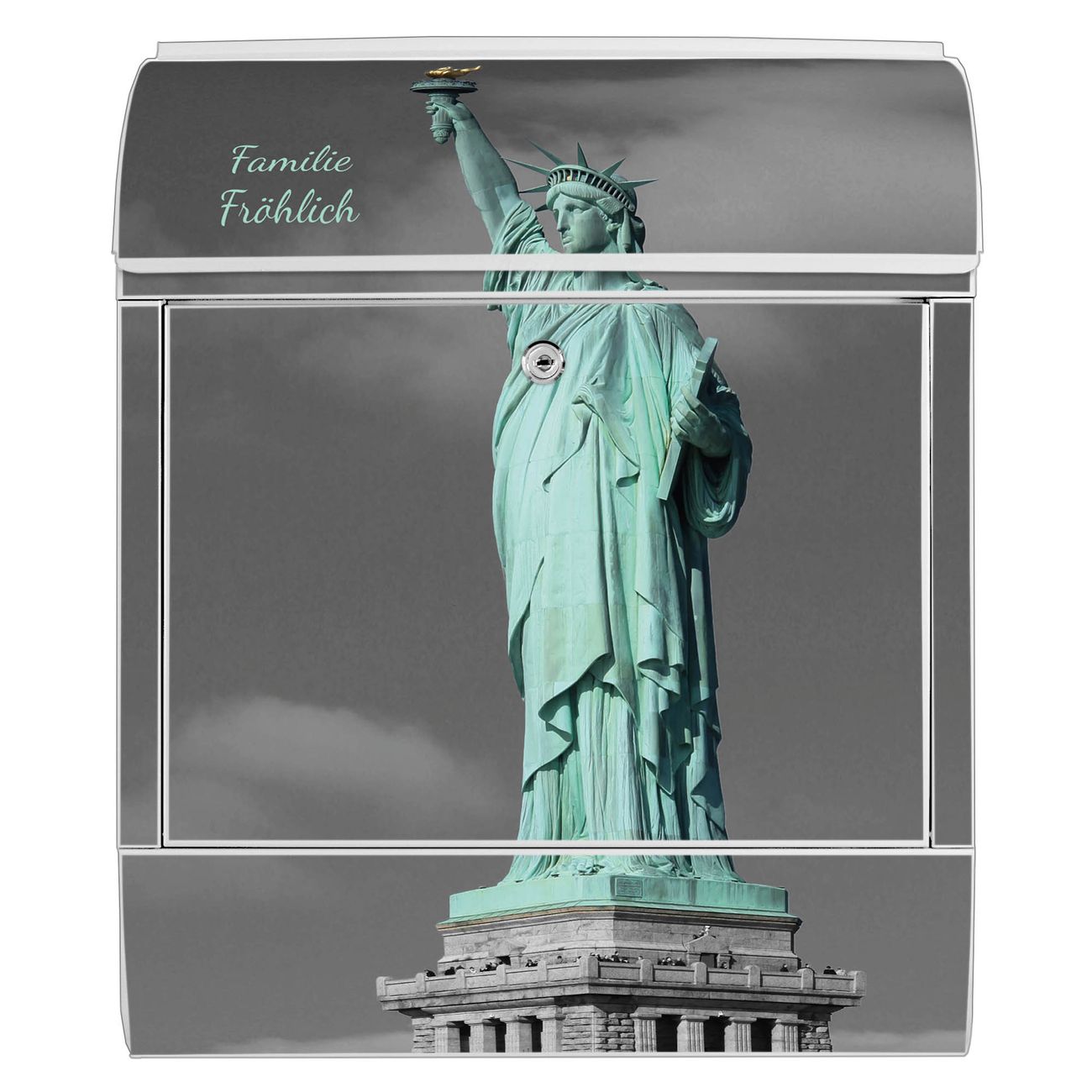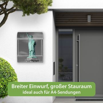 Motiv Freiheitsstatue Nr. 10173 Material weiß pulverbeschichtetes Stahlblech Dekorfolie UV-beständig, wetterfest Gesamtgröße 38x47x13cm BxHxT Briefschlitz 33x3,5cm BxH Gewicht ca. 3,5 kg Zubehör Montagezubehör, 2 Schlüssel, Bohrschablone