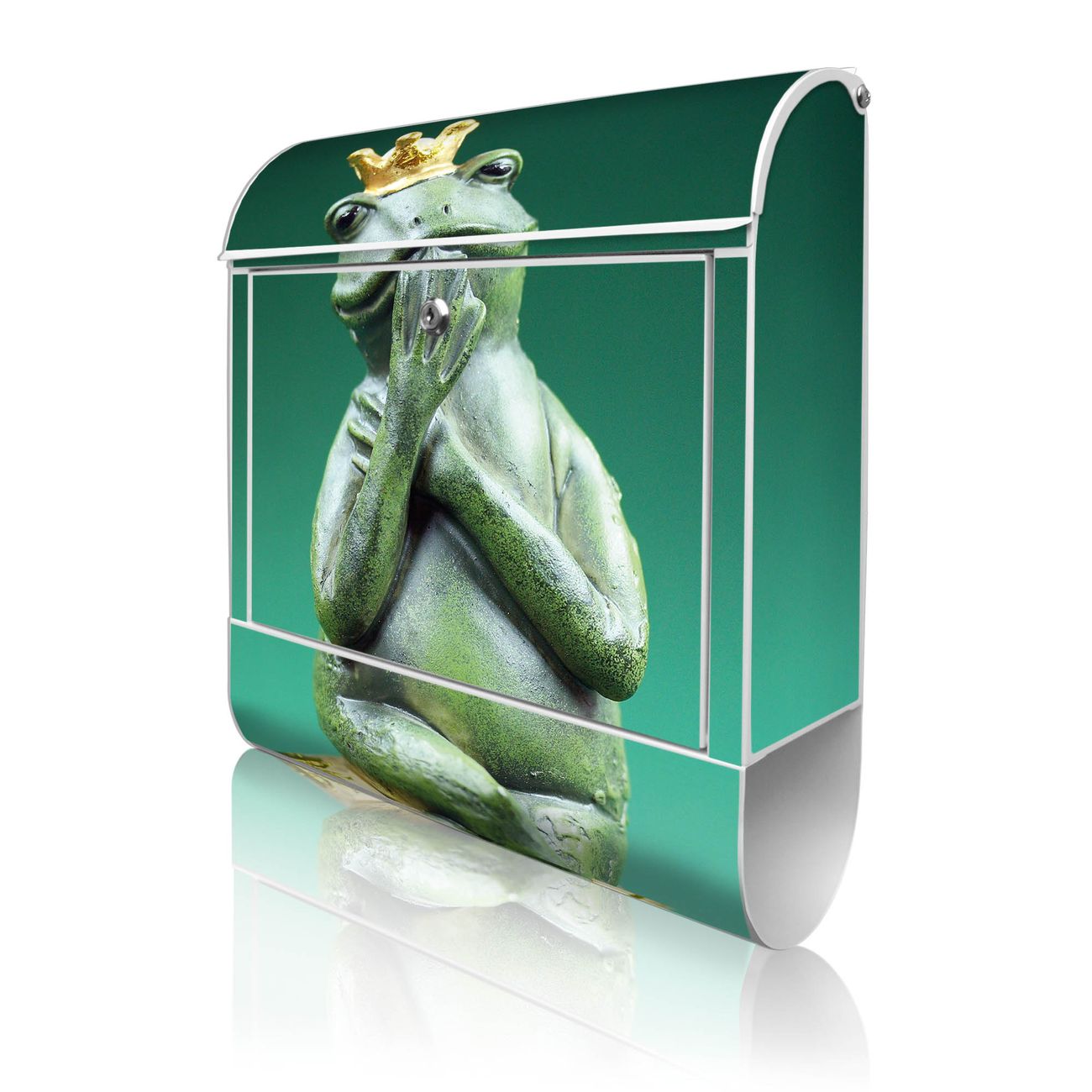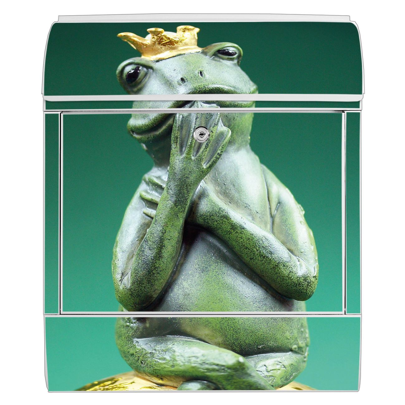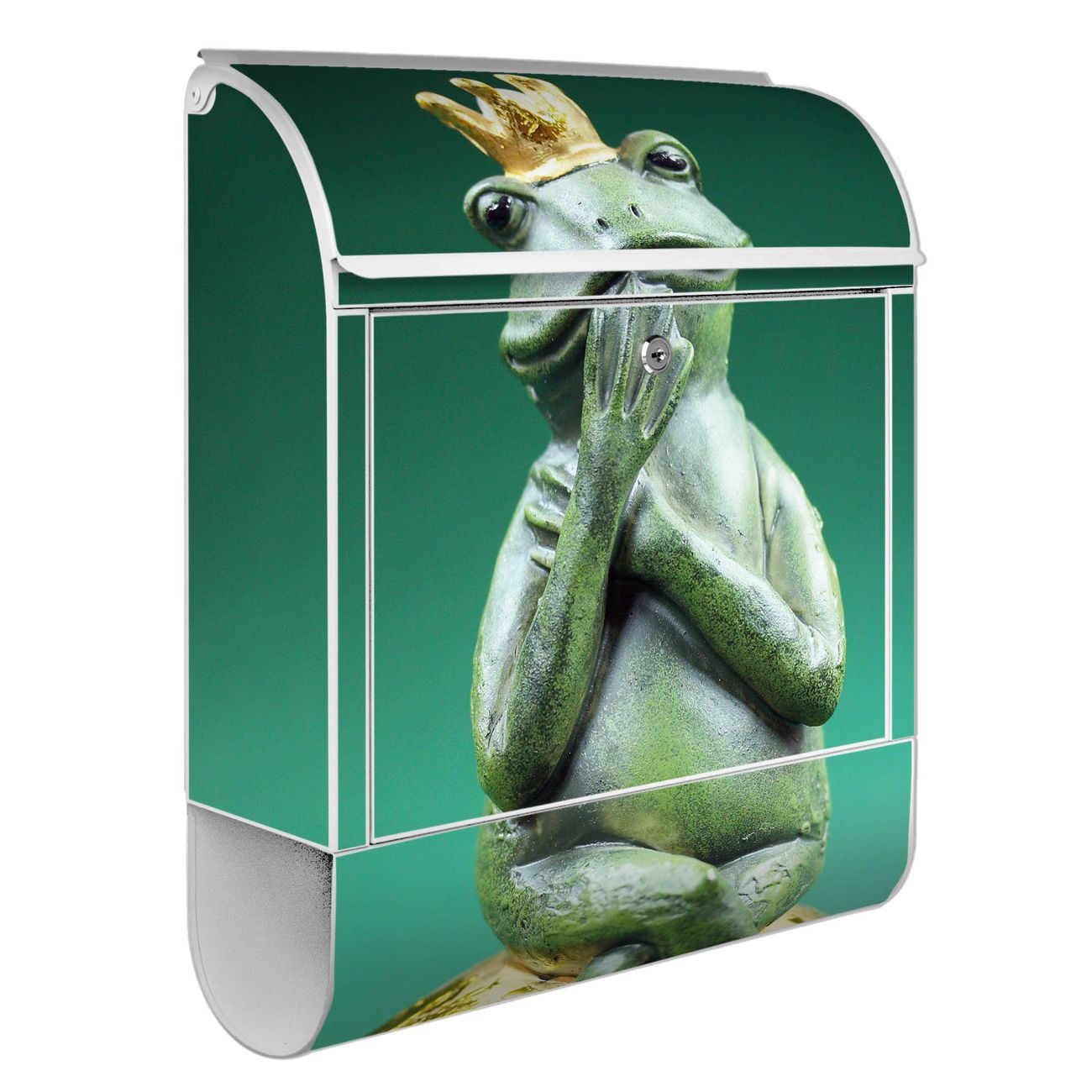 Motiv Froschkönig Nr. 10191 Material weiß pulverbeschichtetes Stahlblech Dekorfolie UV-beständig, wetterfest Gesamtgröße 38x47x13cm BxHxT Briefschlitz 33x3,5cm BxH Gewicht ca. 3,5 kg Zubehör Montagezubehör, 2 Schlüssel, Bohrschablone