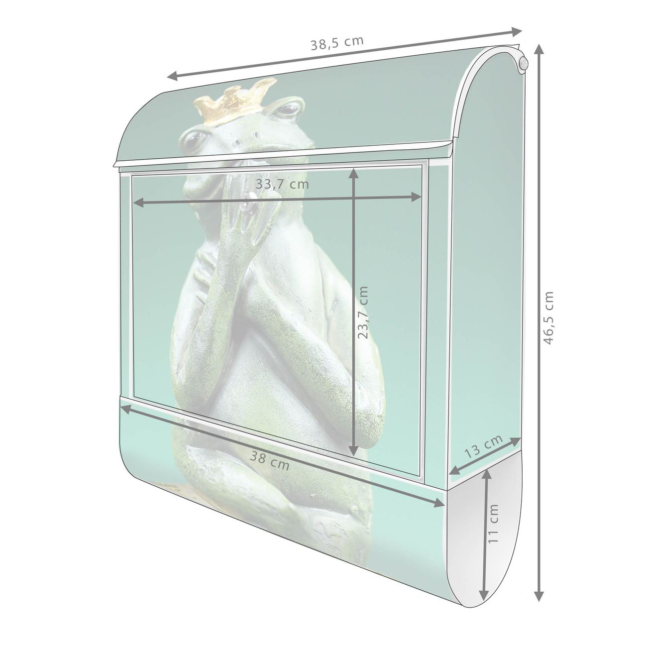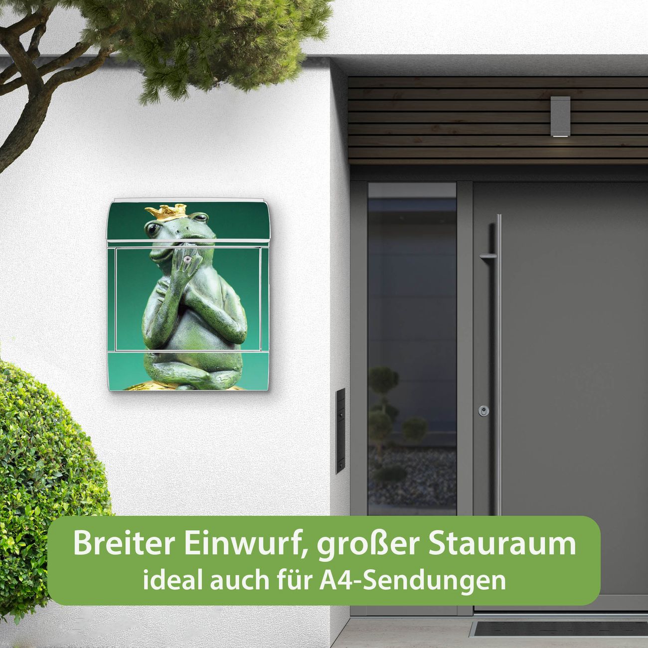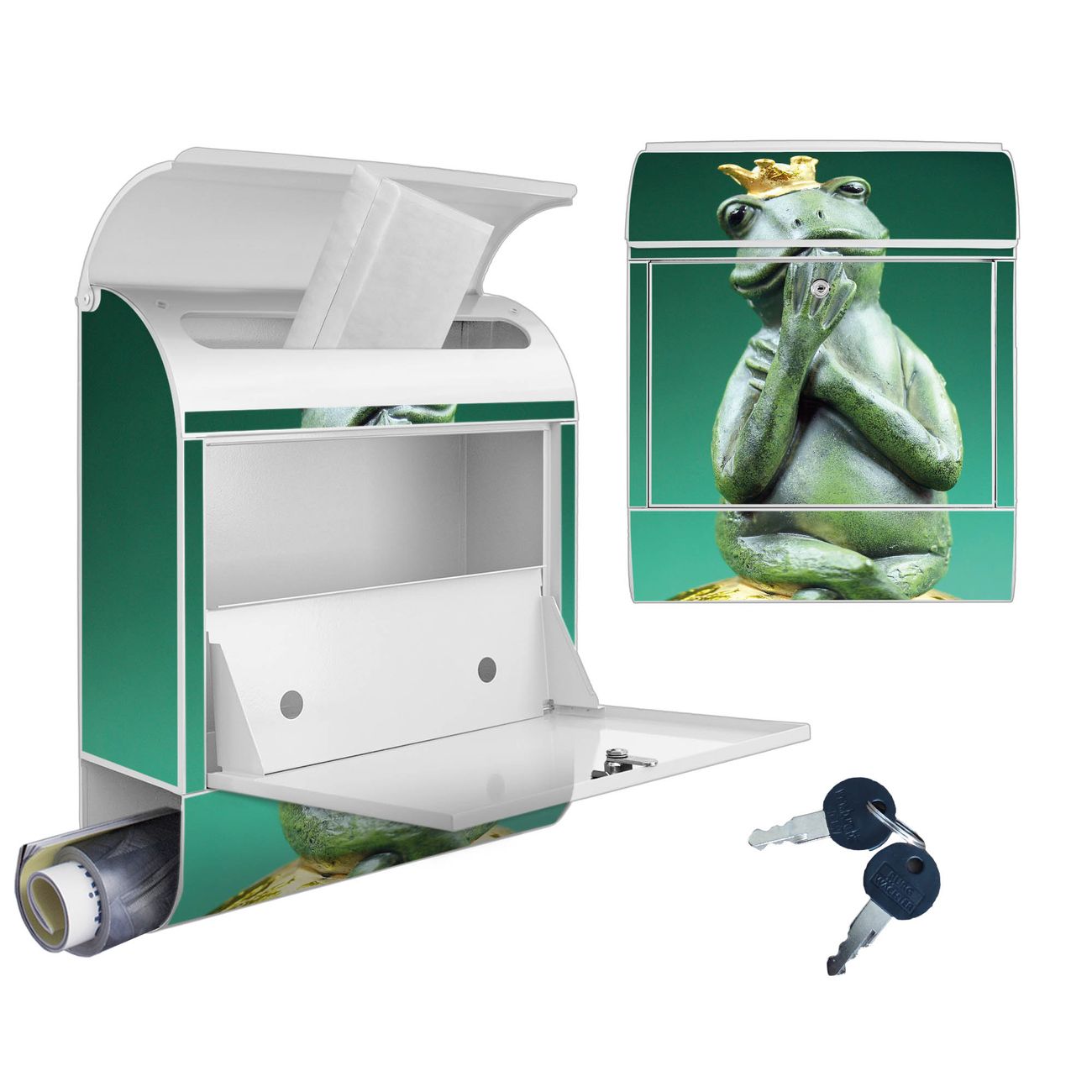 Motiv Froschkönig Nr. 10191 Material weiß pulverbeschichtetes Stahlblech Dekorfolie UV-beständig, wetterfest Gesamtgröße 38x47x13cm BxHxT Briefschlitz 33x3,5cm BxH Gewicht ca. 3,5 kg Zubehör Montagezubehör, 2 Schlüssel, Bohrschablone