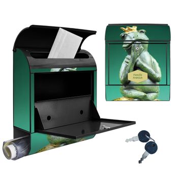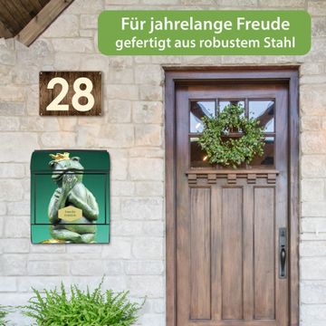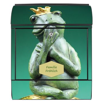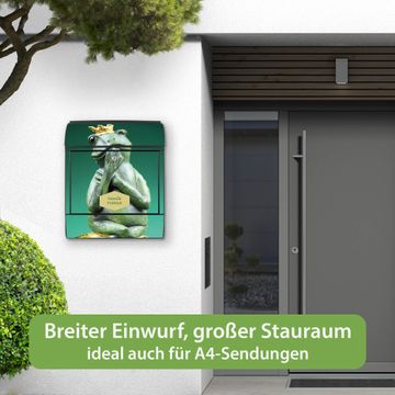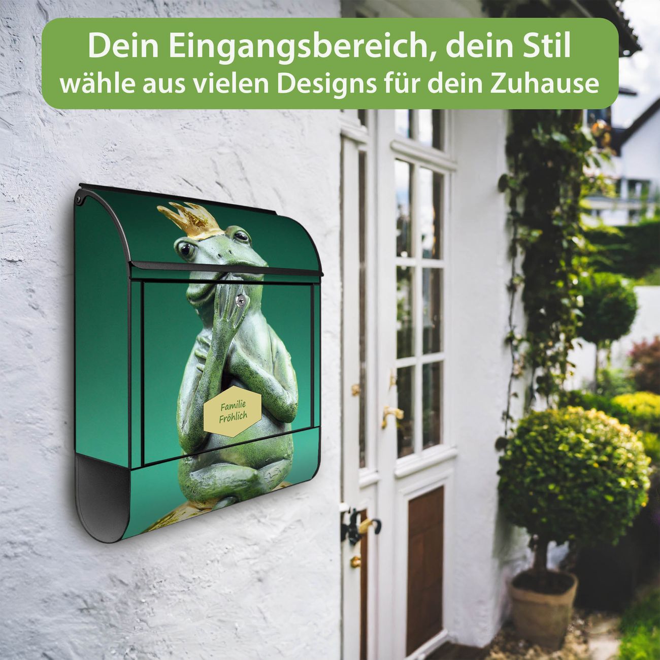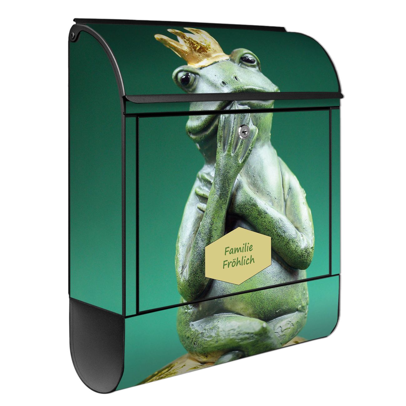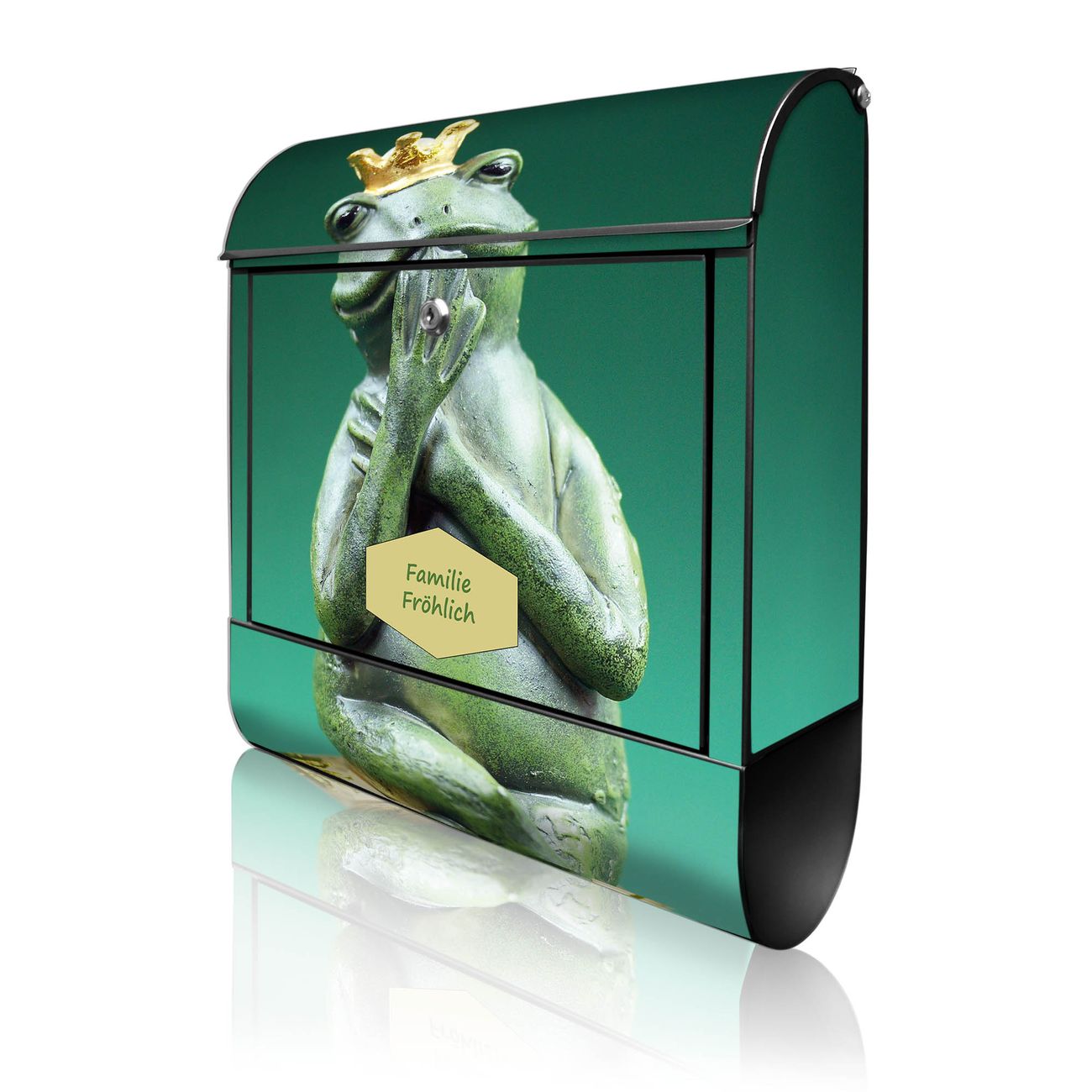 Motiv Froschkönig Nr. 10191 Material schwarz pulverbeschichtetes Stahlblech Dekorfolie UV-beständig, wetterfest Gesamtgröße 38x47x13cm BxHxT Briefschlitz 33x3,5cm BxH Gewicht ca. 3,5 kg Zubehör Montagezubehör, 2 Schlüssel, Bohrschablone