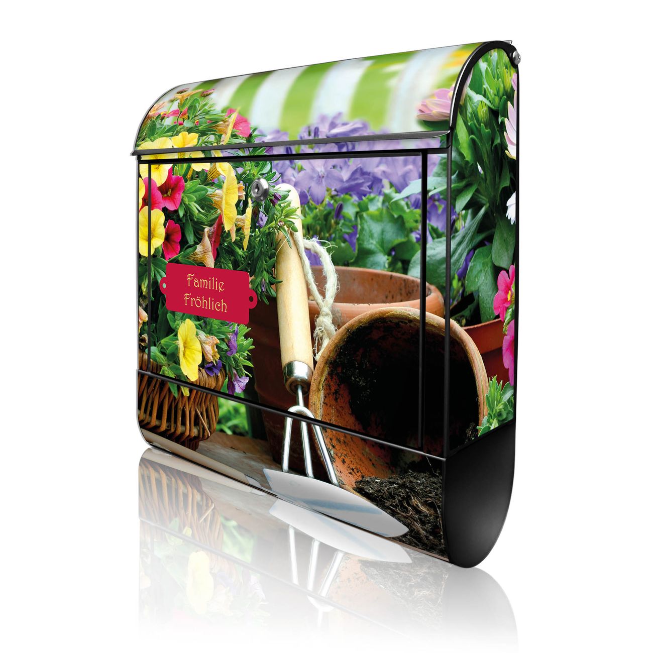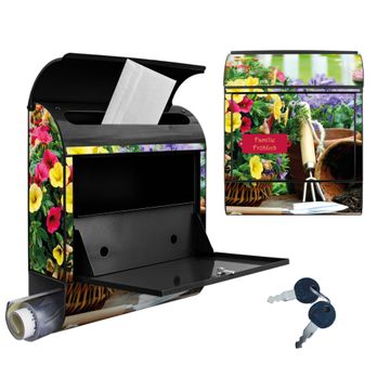 Motiv Gartenfreude Nr. 10226 Material schwarz pulverbeschichtetes Stahlblech Dekorfolie UV-beständig, wetterfest Gesamtgröße 38x47x13cm BxHxT Briefschlitz 33x3,5cm BxH Gewicht ca. 3,5 kg Zubehör Montagezubehör, 2 Schlüssel, Bohrschablone