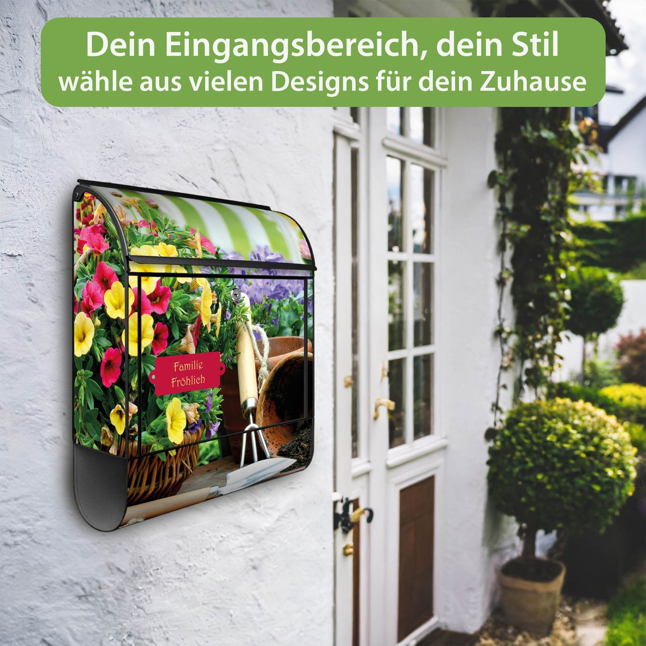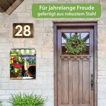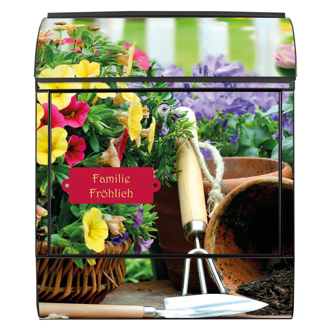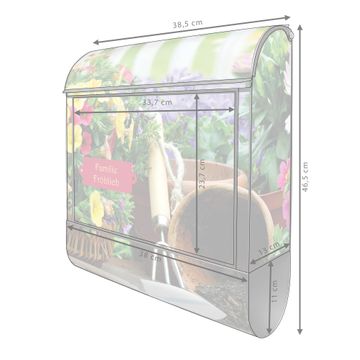 DESIGN: Der Postkasten mit Motiv Gartenfreude hat ein sehr ansprechendes und ausgefallenes Design, damit entlocken Sie Ihren Nachbarn und dem Postboten ein Lächeln. Heben Sie Sich von der tristen grauen Masse ab, ohne auf Funktionalität zu verzichten. DETAILS: Der Postkasten besteht aus pulverbeschichtetem Stahl. Er ist 38x46x12,5cm groß. Das Motiv besteht aus einer wetter- und UV-resistenten Folie, die mit einem Schutzlaminat überzogen ist, sodass der Briefkasten zusätzlich vor Kratzern geschützt ist. Der Briefkasten wird mit Montagematerial, zusätzlich zwei Schlüssel sowie einer Bohrschablone geliefert. NUTZEN: Sie können diesen Briefkasten sowohl als Wandbriefkasten montieren oder einen passenden Ständer kaufen und als Standbriefkasten einbetonieren. Die Größe bietet genügend Platz für Sendungen aller Art, der Einwurf fasst auch größere A4 Sendungen. BANJADO: Ihr Briefkasten wird in Sachsen in einer kleinen Manufaktur von Hand veredelt. Die Motivfolie ist lösungsmittelfrei und schutzlaminiert für einen langen Halt. Wir legen großen Wert auf die Verbindung von Funktionalität und Design. Sie erhalten Handarbeit aus Sachsen.