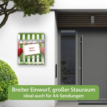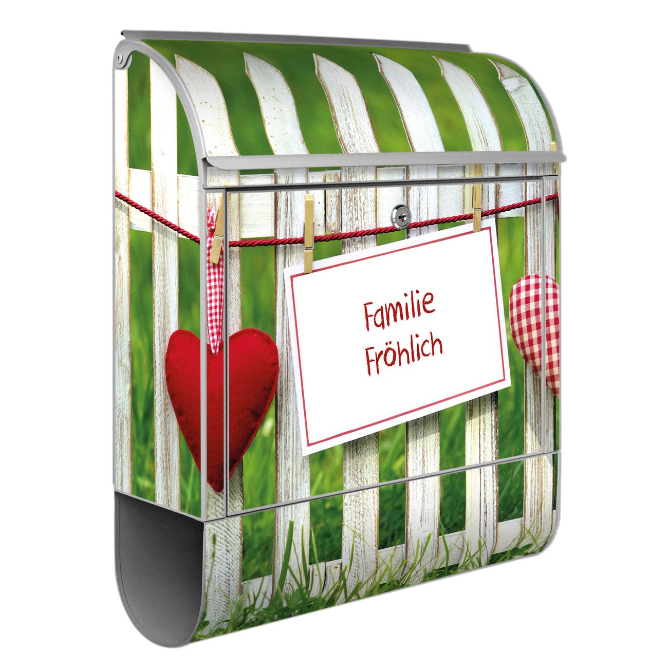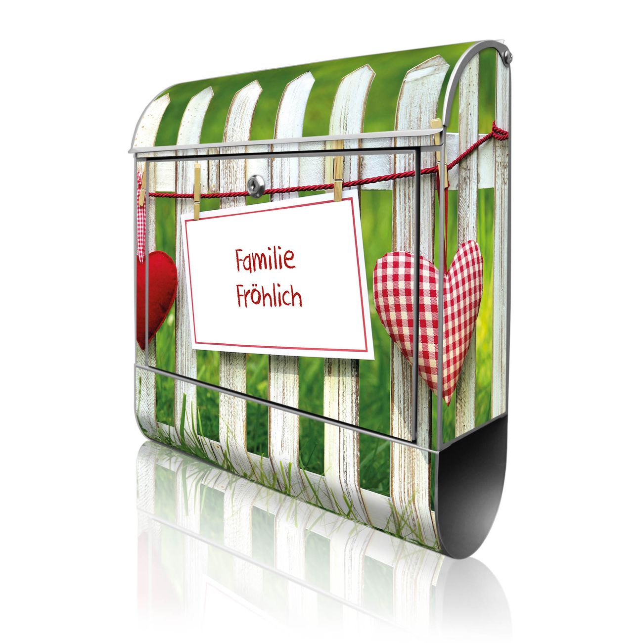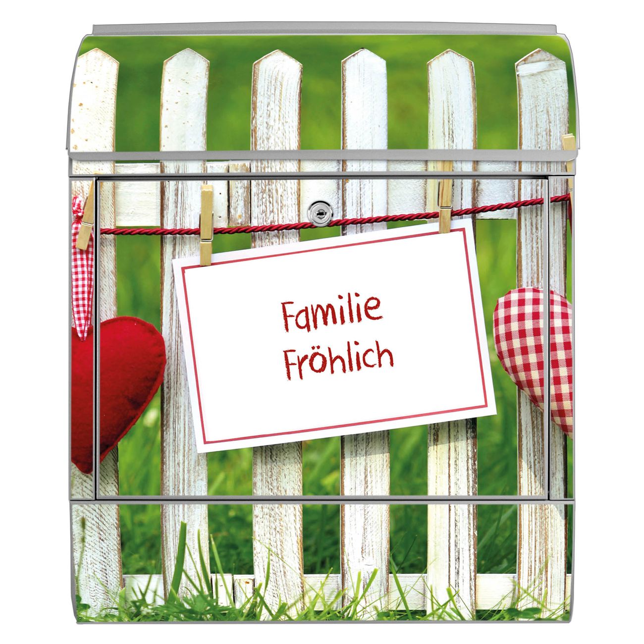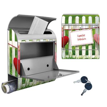 Motiv Gartenzaun Nr. 10375 Material silber pulverbeschichtetes Stahlblech Dekorfolie UV-beständig, wetterfest Gesamtgröße 38x47x13cm BxHxT Briefschlitz 33x3,5cm BxH Gewicht ca. 3,5 kg Zubehör Montagezubehör, 2 Schlüssel, Bohrschablone