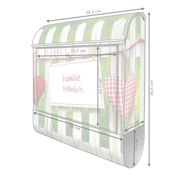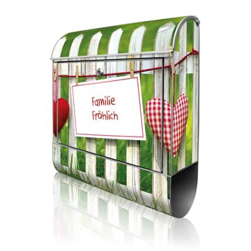 DESIGN: Der Postkasten mit Motiv Gartenzaun hat ein sehr ansprechendes und ausgefallenes Design, damit entlocken Sie Ihren Nachbarn und dem Postboten ein Lächeln. Heben Sie Sich von der tristen grauen Masse ab, ohne auf Funktionalität zu verzichten. DETAILS: Der Postkasten besteht aus pulverbeschichtetem Stahl. Er ist 38x46x12,5cm groß. Das Motiv besteht aus einer wetter- und UV-resistenten Folie, die mit einem Schutzlaminat überzogen ist, sodass der Briefkasten zusätzlich vor Kratzern geschützt ist. Der Briefkasten wird mit Montagematerial, zusätzlich zwei Schlüssel sowie einer Bohrschablone geliefert. NUTZEN: Sie können diesen Briefkasten sowohl als Wandbriefkasten montieren oder einen passenden Ständer kaufen und als Standbriefkasten einbetonieren. Die Größe bietet genügend Platz für Sendungen aller Art, der Einwurf fasst auch größere A4 Sendungen. BANJADO: Ihr Briefkasten wird in Sachsen in einer kleinen Manufaktur von Hand veredelt. Die Motivfolie ist lösungsmittelfrei und schutzlaminiert für einen langen Halt. Wir legen großen Wert auf die Verbindung von Funktionalität und Design. Sie erhalten Handarbeit aus Sachsen.