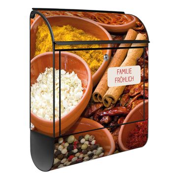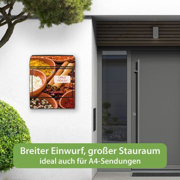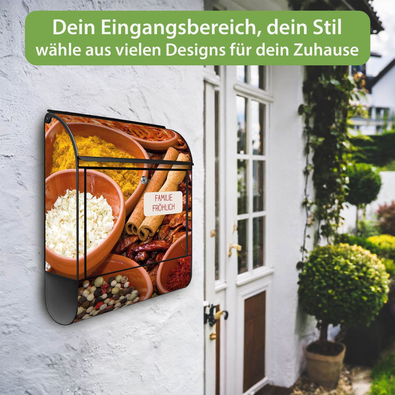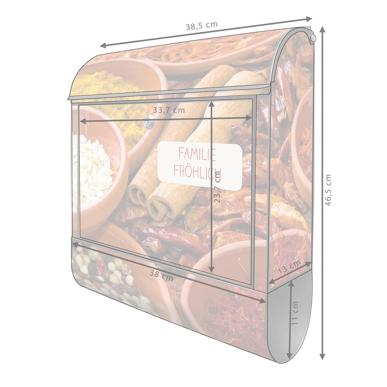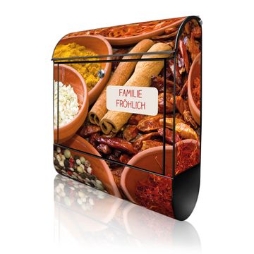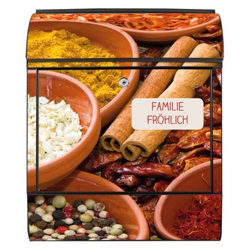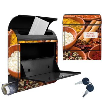 DESIGN: Der Postkasten mit Motiv Motiv Gewürze hat ein sehr ansprechendes und ausgefallenes Design, damit entlocken Sie Ihren Nachbarn und dem Postboten ein Lächeln. Heben Sie Sich von der tristen grauen Masse ab, ohne auf Funktionalität zu verzichten. DETAILS: Der Postkasten besteht aus pulverbeschichtetem Stahl. Er ist 38x46x12,5cm groß. Das Motiv besteht aus einer wetter- und UV-resistenten Folie, die mit einem Schutzlaminat überzogen ist, sodass der Briefkasten zusätzlich vor Kratzern geschützt ist. Der Briefkasten wird mit Montagematerial, zusätzlich zwei Schlüssel sowie einer Bohrschablone geliefert. NUTZEN: Sie können diesen Briefkasten sowohl als Wandbriefkasten montieren oder einen passenden Ständer kaufen und als Standbriefkasten einbetonieren. Die Größe bietet genügend Platz für Sendungen aller Art, der Einwurf fasst auch größere A4 Sendungen. BANJADO: Ihr Briefkasten wird in Sachsen in einer kleinen Manufaktur von Hand veredelt. Die Motivfolie ist lösungsmittelfrei und schutzlaminiert für einen langen Halt. Wir legen großen Wert auf die Verbindung von Funktionalität und Design. Sie erhalten Handarbeit aus Sachsen.