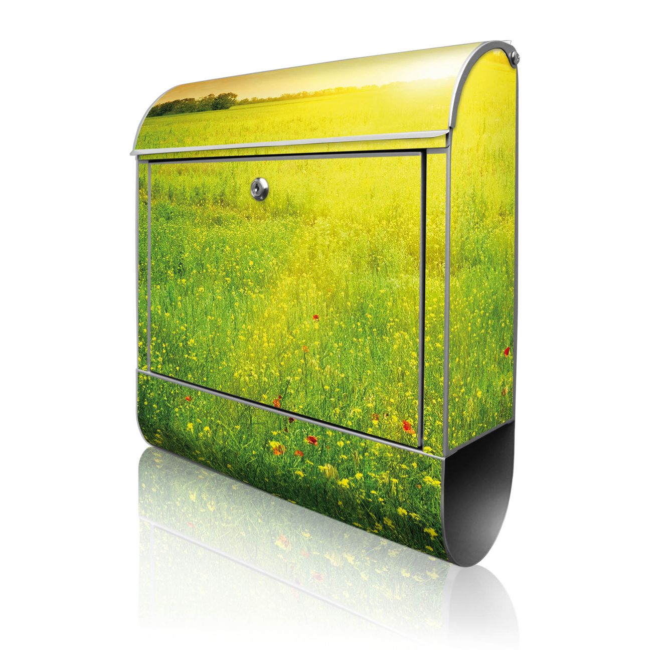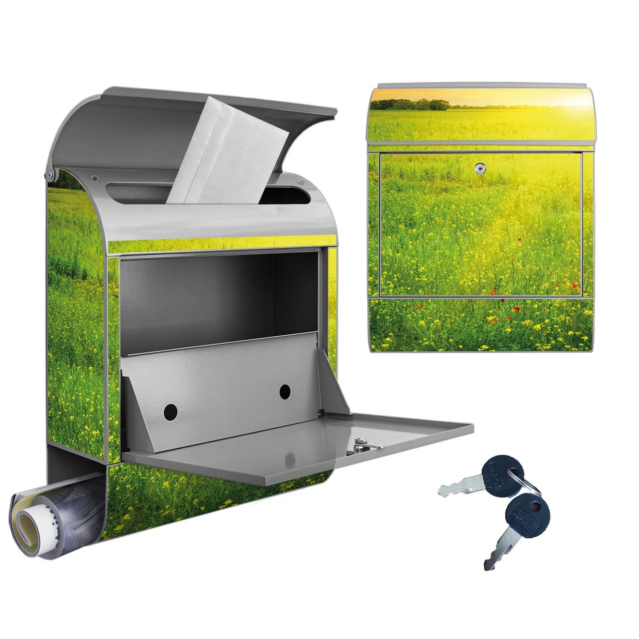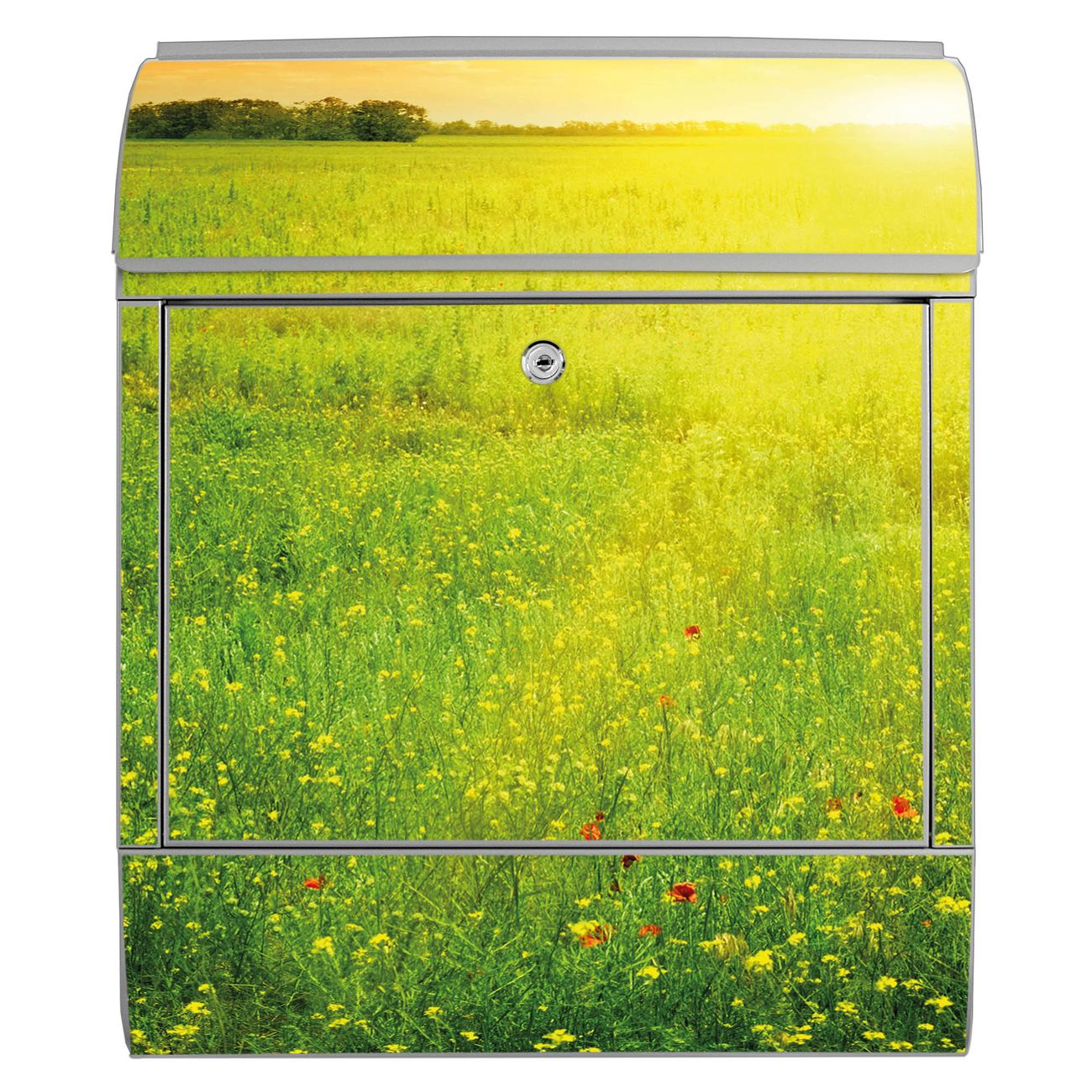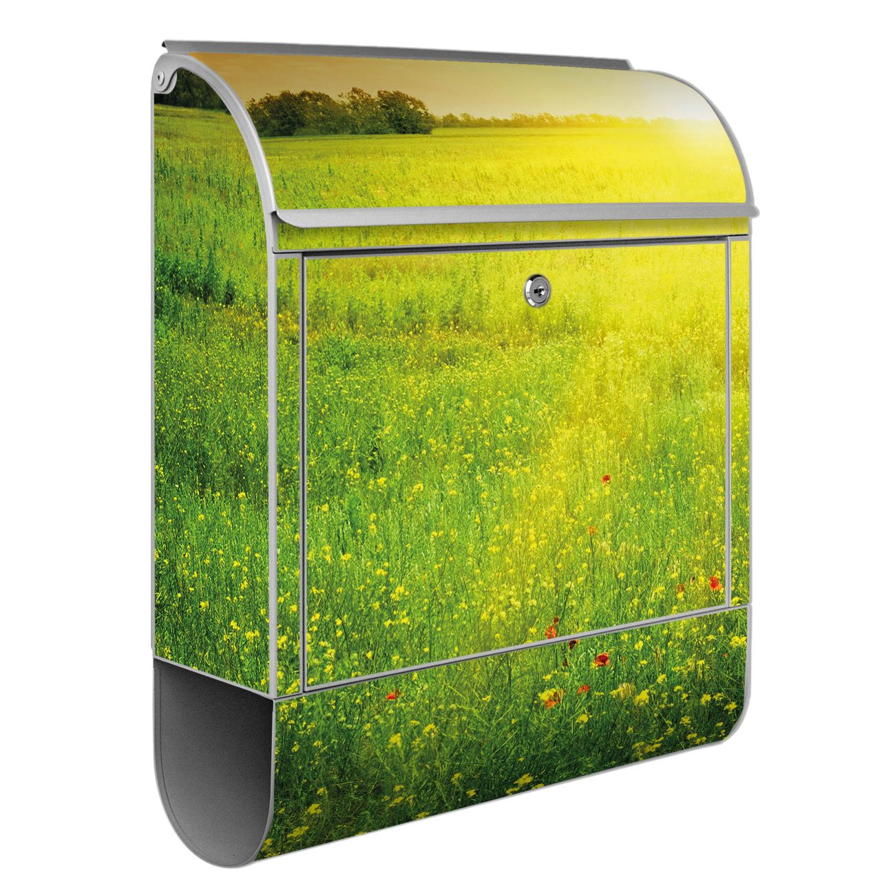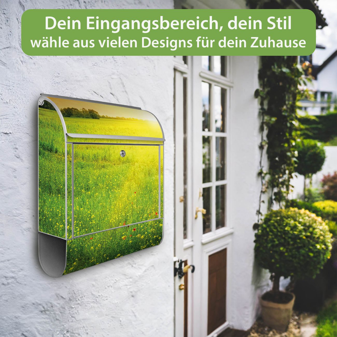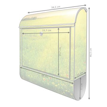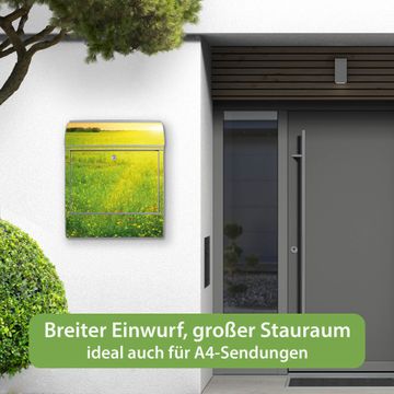 Motiv Guten Morgen 2 Nr. 10305 Material: silber-grau pulverbeschichtetes Stahlblech Dekorfolie: UV-beständig, wetterfest Gesamtgröße: 38x46x12,5cm BxHxT Briefschlitz: 33x3,5cm BxH Gewicht: ca. 3,4 kg Zubehör: Montagezubehör, 2 Schlüssel, Bohrschablone