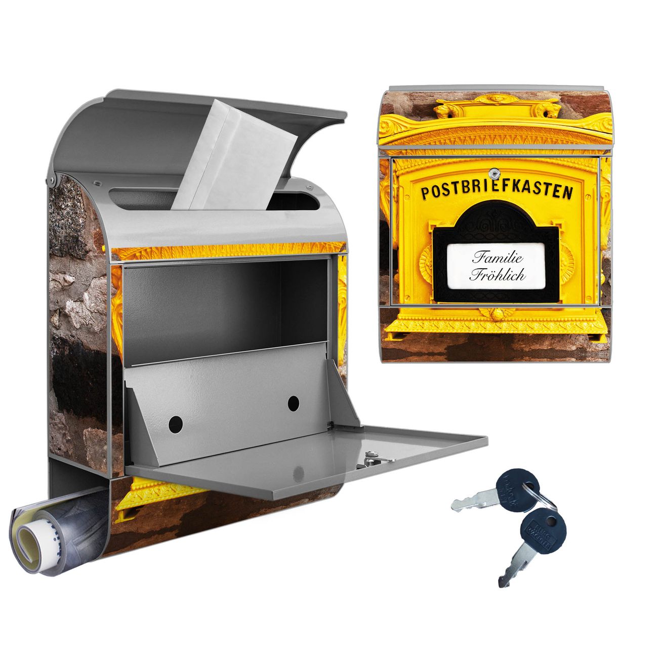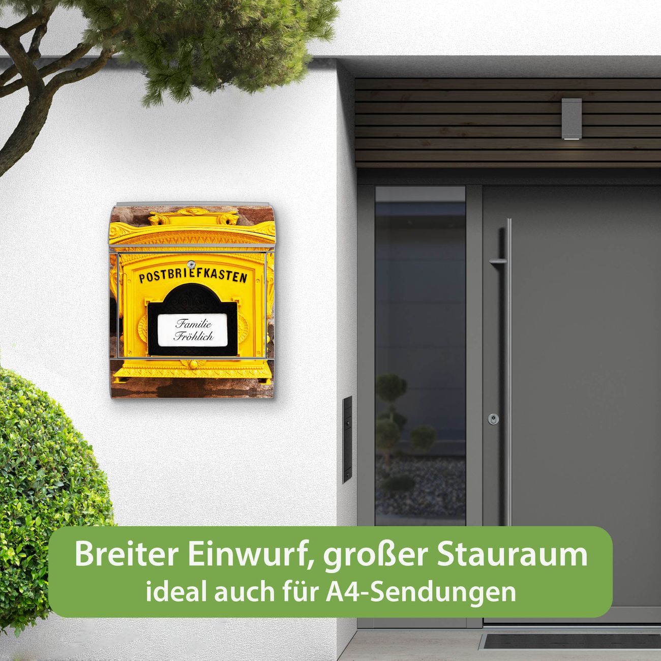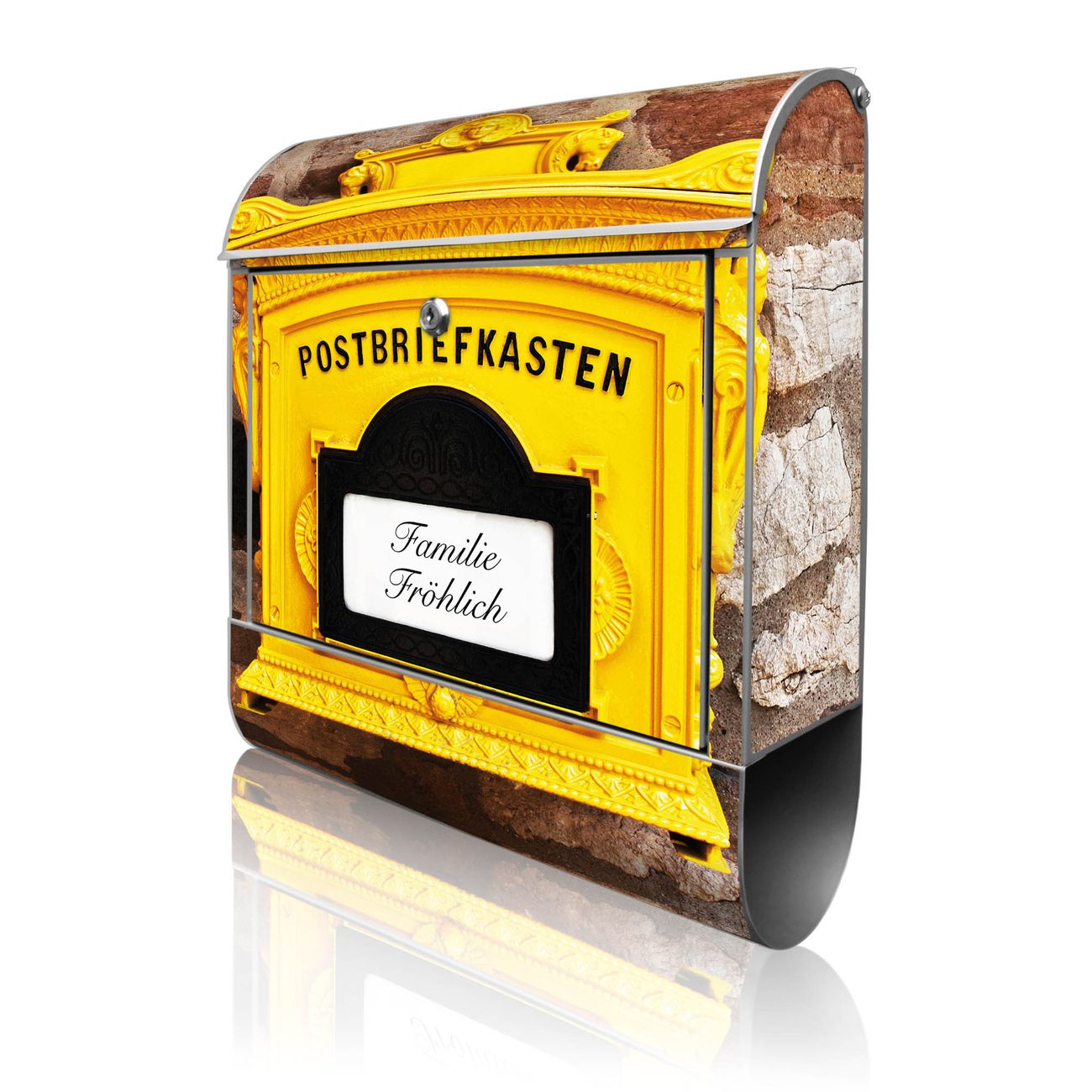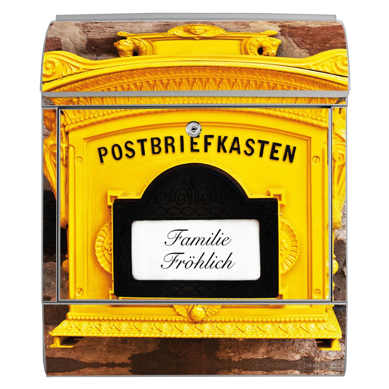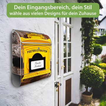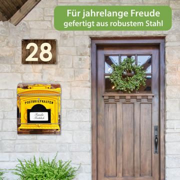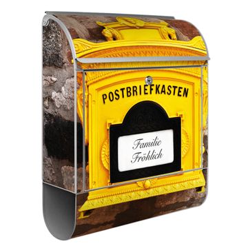 DESIGN: Der Postkasten mit Motiv Historischer Postkasten hat ein sehr ansprechendes und ausgefallenes Design, damit entlocken Sie Ihren Nachbarn und dem Postboten ein Lächeln. Heben Sie Sich von der tristen grauen Masse ab, ohne auf Funktionalität zu verzichten. DETAILS: Der Postkasten besteht aus pulverbeschichtetem Stahl. Er ist 38x46x12,5cm groß. Das Motiv besteht aus einer wetter- und UV-resistenten Folie, die mit einem Schutzlaminat überzogen ist, sodass der Briefkasten zusätzlich vor Kratzern geschützt ist. Der Briefkasten wird mit Montagematerial, zusätzlich zwei Schlüssel sowie einer Bohrschablone geliefert. NUTZEN: Sie können diesen Briefkasten sowohl als Wandbriefkasten montieren oder einen passenden Ständer kaufen und als Standbriefkasten einbetonieren. Die Größe bietet genügend Platz für Sendungen aller Art, der Einwurf fasst auch größere A4 Sendungen. BANJADO: Ihr Briefkasten wird in Sachsen in einer kleinen Manufaktur von Hand veredelt. Die Motivfolie ist lösungsmittelfrei und schutzlaminiert für einen langen Halt. Wir legen großen Wert auf die Verbindung von Funktionalität und Design. Sie erhalten Handarbeit aus Sachsen.