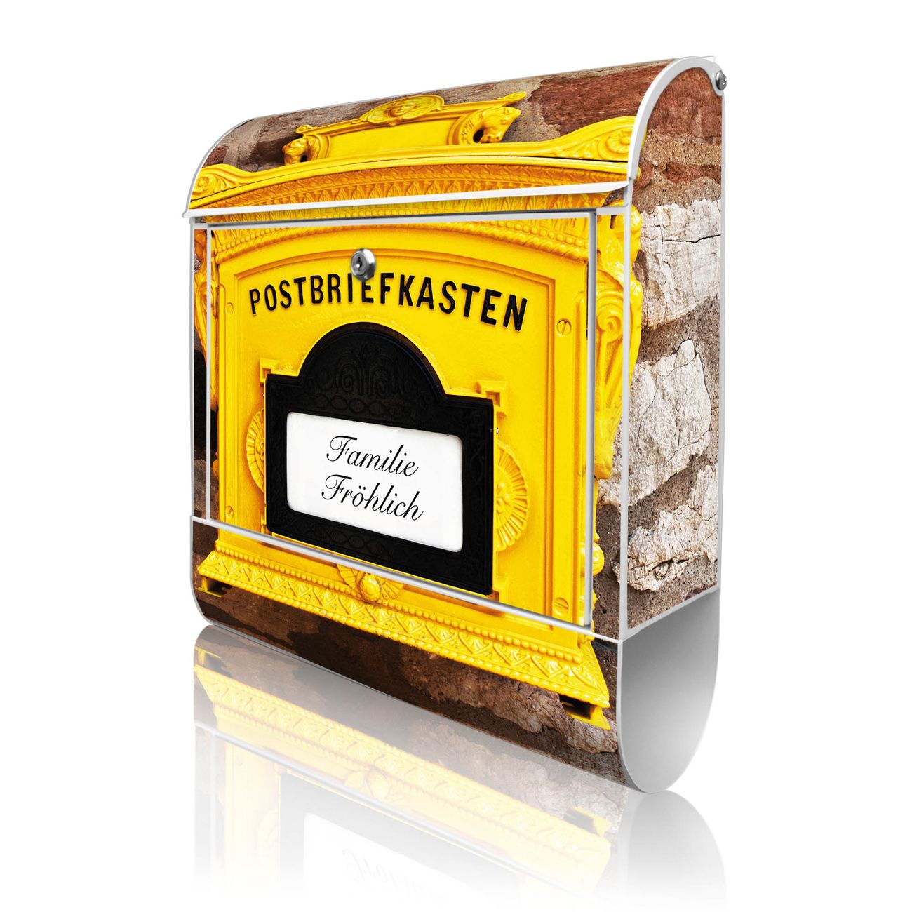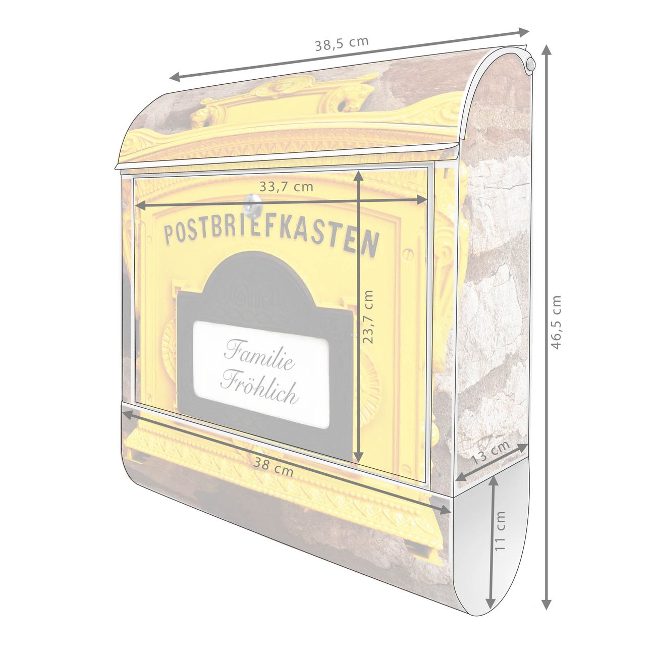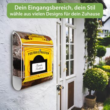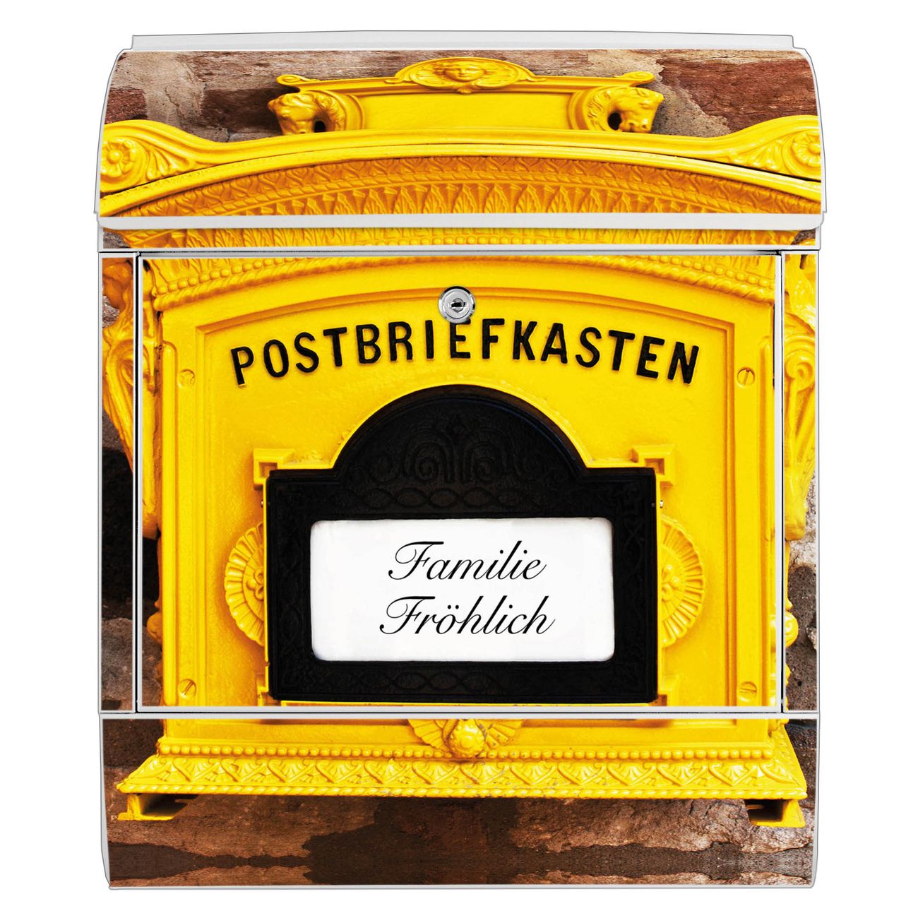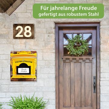 DESIGN: Der Postkasten mit Motiv Historischer Postkasten hat ein sehr ansprechendes und ausgefallenes Design, damit entlocken Sie Ihren Nachbarn und dem Postboten ein Lächeln. Heben Sie Sich von der tristen grauen Masse ab, ohne auf Funktionalität zu verzichten. DETAILS: Der Postkasten besteht aus pulverbeschichtetem Stahl. Er ist 38x46x12,5cm groß. Das Motiv besteht aus einer wetter- und UV-resistenten Folie, die mit einem Schutzlaminat überzogen ist, sodass der Briefkasten zusätzlich vor Kratzern geschützt ist. Der Briefkasten wird mit Montagematerial, zusätzlich zwei Schlüssel sowie einer Bohrschablone geliefert. NUTZEN: Sie können diesen Briefkasten sowohl als Wandbriefkasten montieren oder einen passenden Ständer kaufen und als Standbriefkasten einbetonieren. Die Größe bietet genügend Platz für Sendungen aller Art, der Einwurf fasst auch größere A4 Sendungen. BANJADO: Ihr Briefkasten wird in Sachsen in einer kleinen Manufaktur von Hand veredelt. Die Motivfolie ist lösungsmittelfrei und schutzlaminiert für einen langen Halt. Wir legen großen Wert auf die Verbindung von Funktionalität und Design. Sie erhalten Handarbeit aus Sachsen.