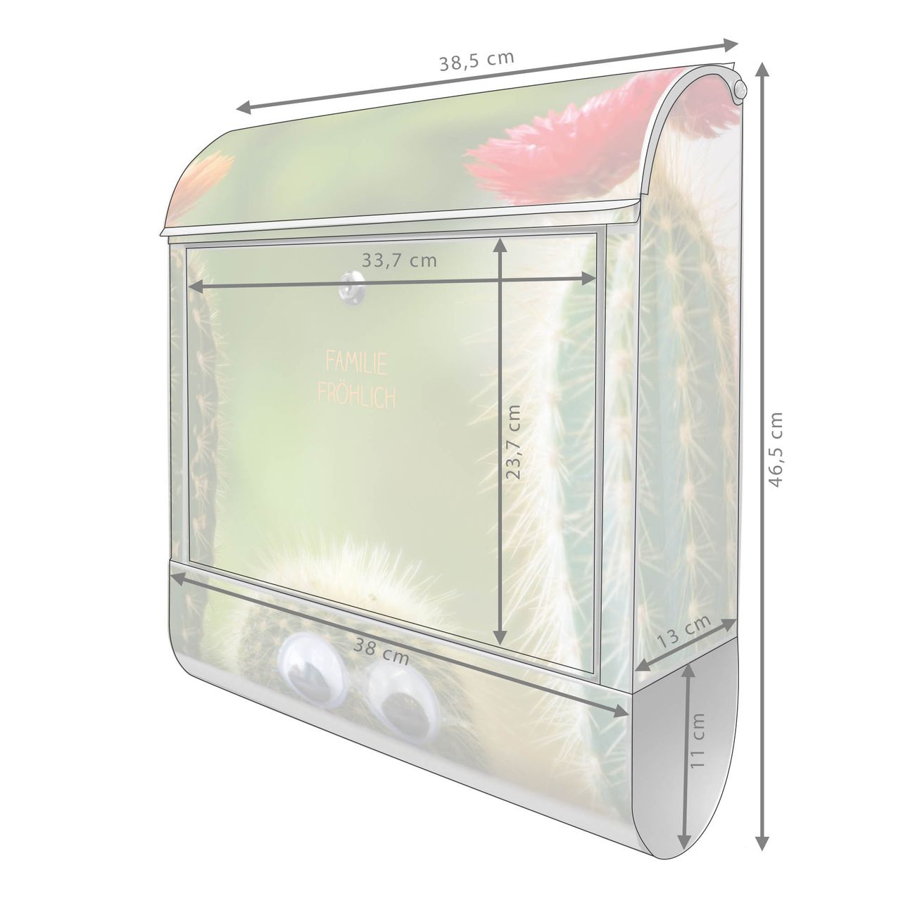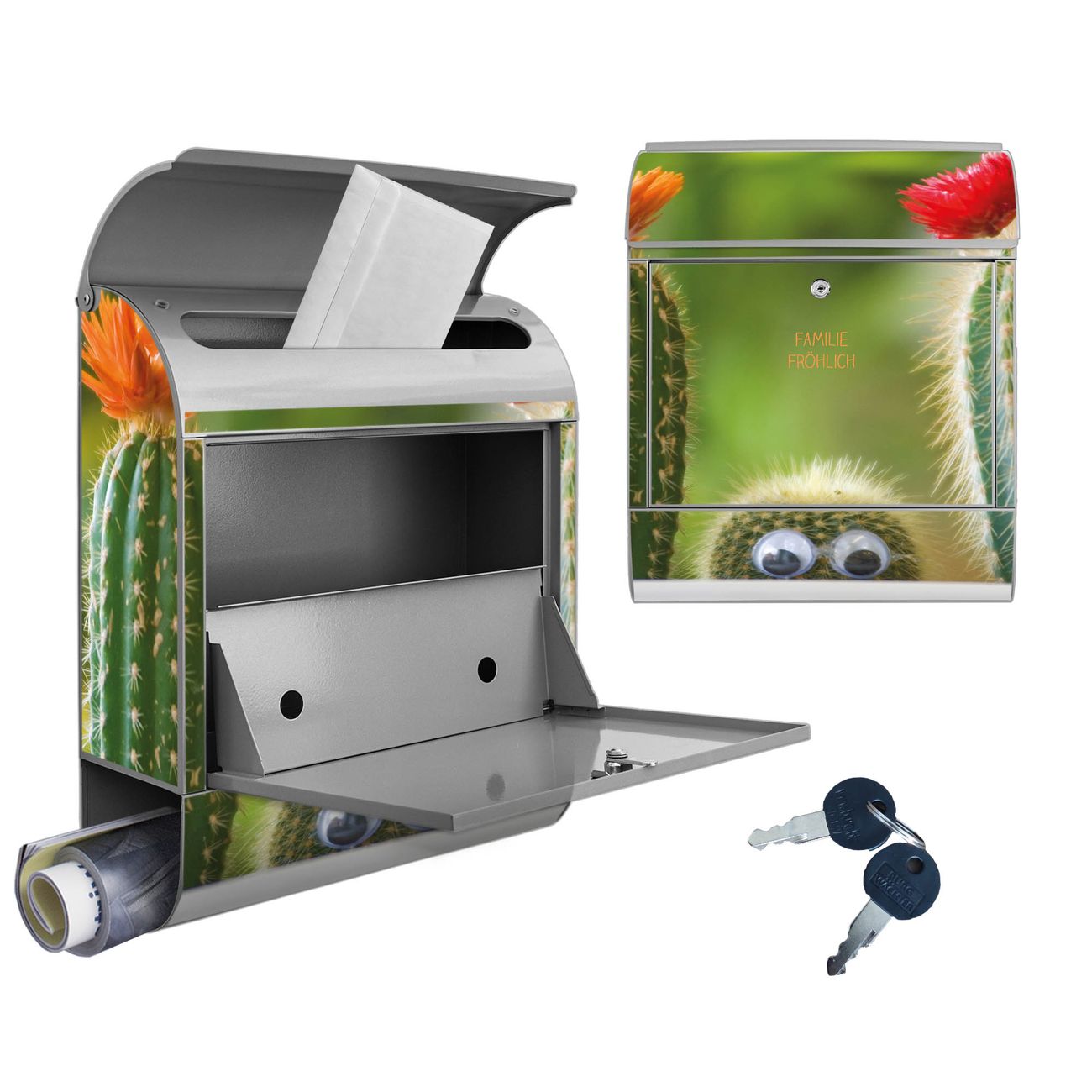 Motiv Kakteen Nr. 10229 Material: silber-grau pulverbeschichtetes Stahlblech Dekorfolie: UV-beständig, wetterfest Gesamtgröße: 38x46x12,5cm BxHxT Briefschlitz: 33x3,5cm BxH Gewicht: ca. 3,4 kg Zubehör: Montagezubehör, 2 Schlüssel, Bohrschablone