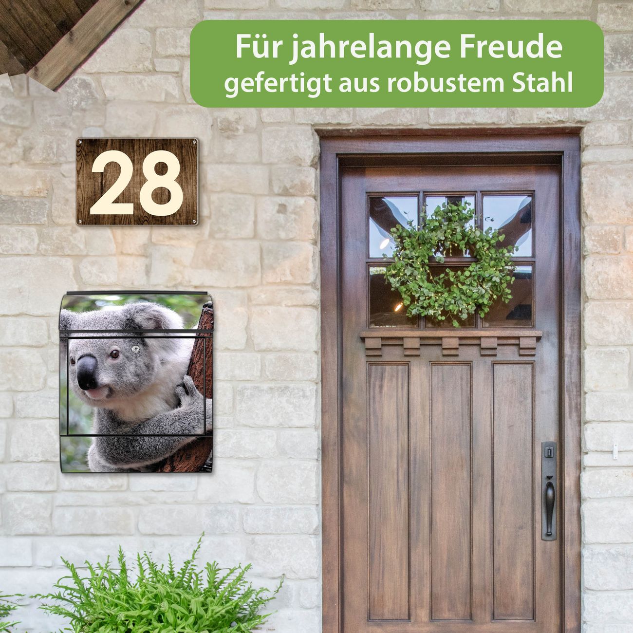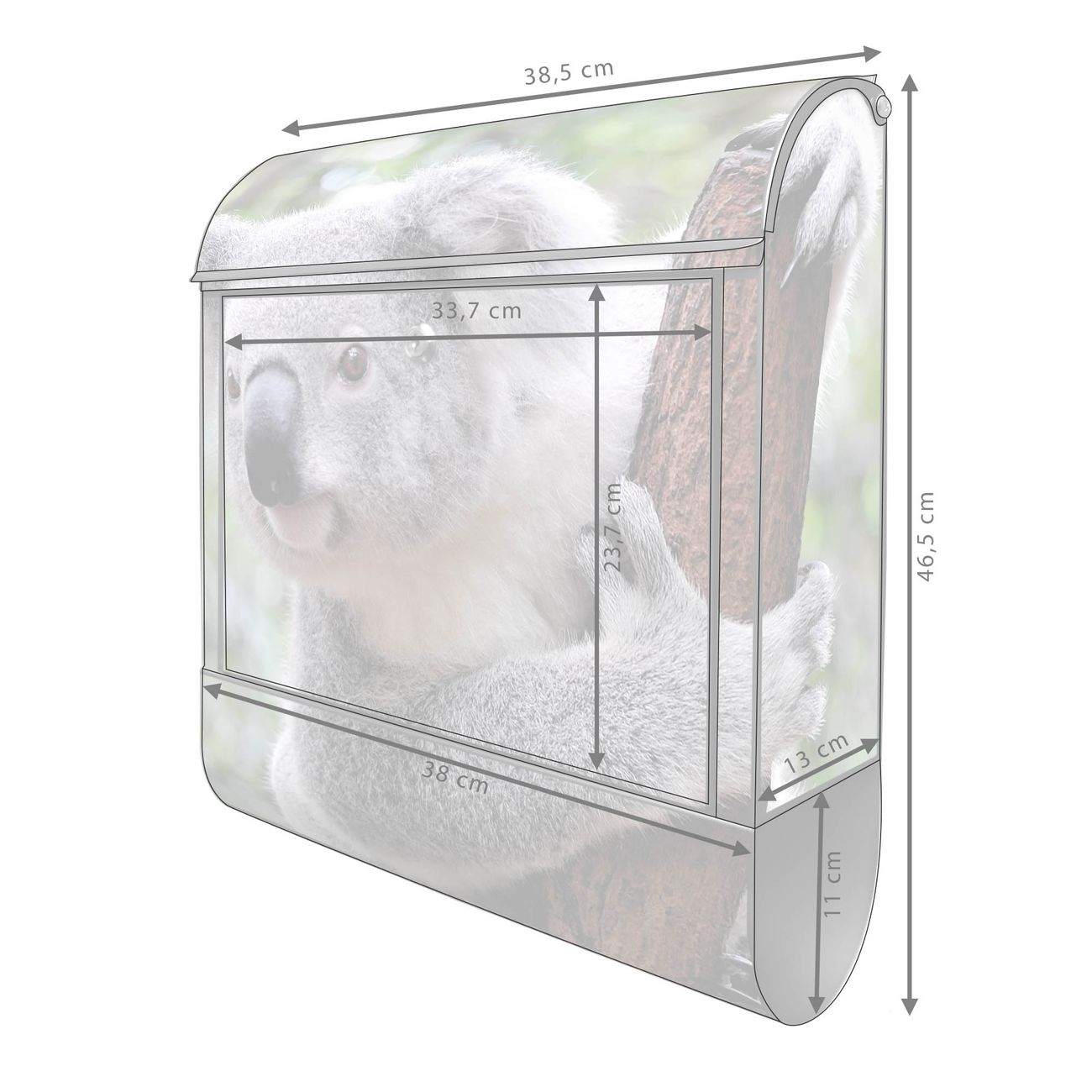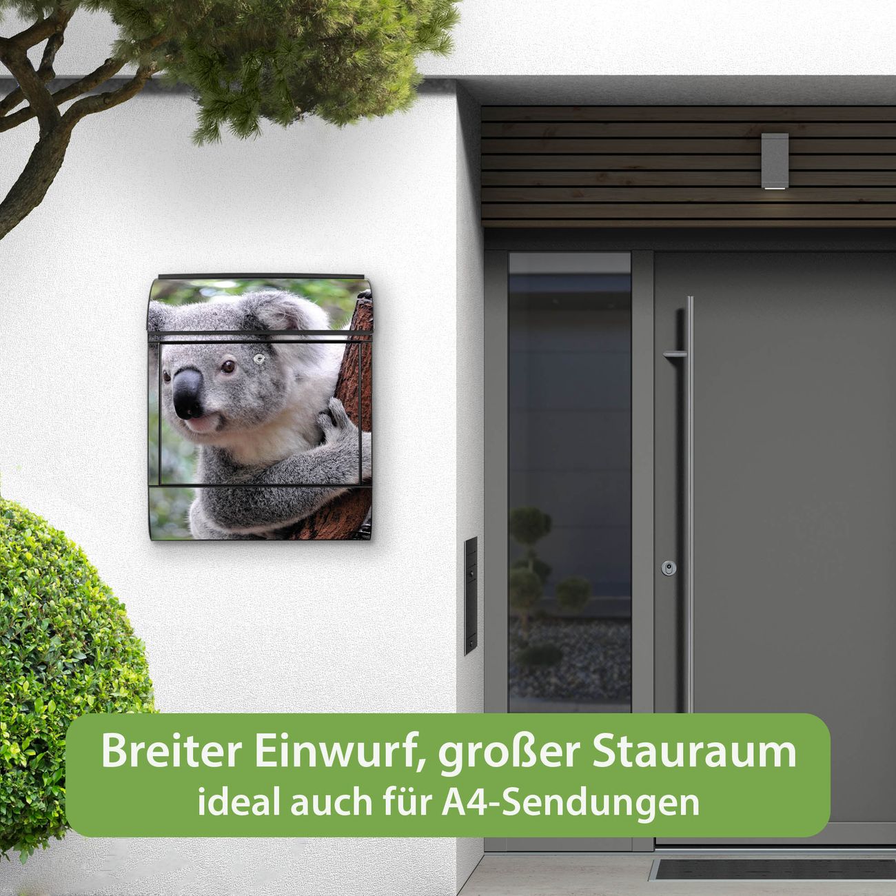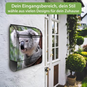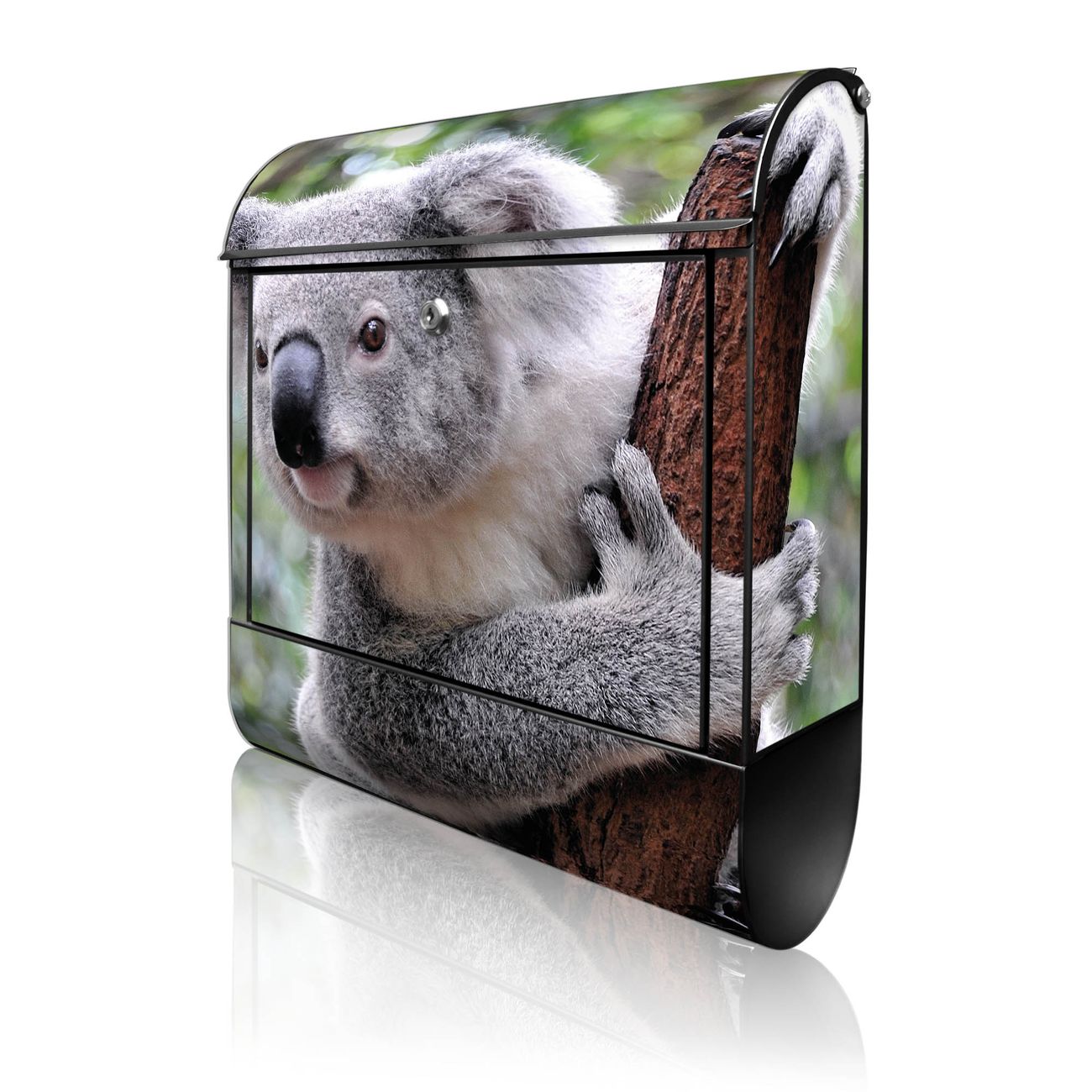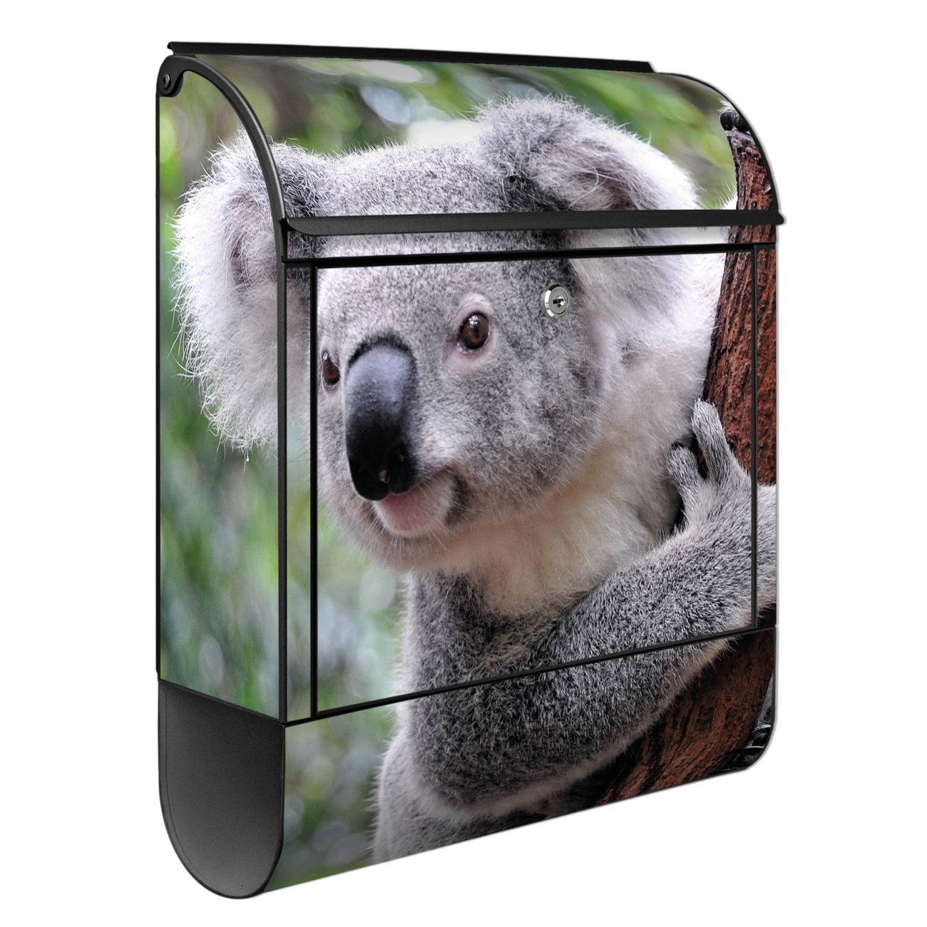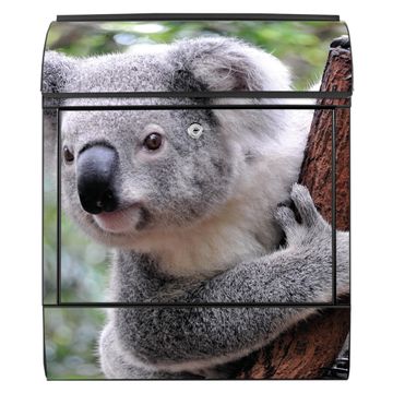 Motiv Koala Nr. 10224 Material schwarz pulverbeschichtetes Stahlblech Dekorfolie UV-beständig, wetterfest Gesamtgröße 38x47x13cm BxHxT Briefschlitz 33x3,5cm BxH Gewicht ca. 3,5 kg Zubehör Montagezubehör, 2 Schlüssel, Bohrschablone