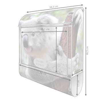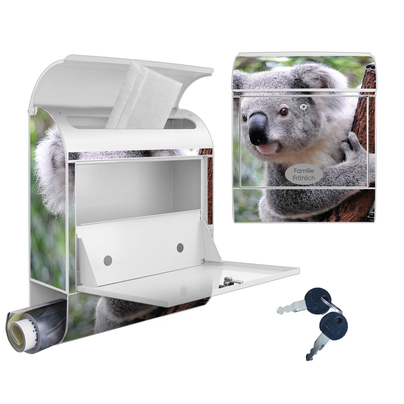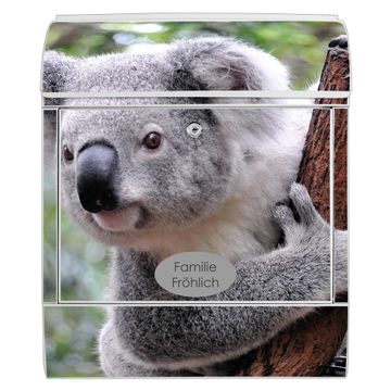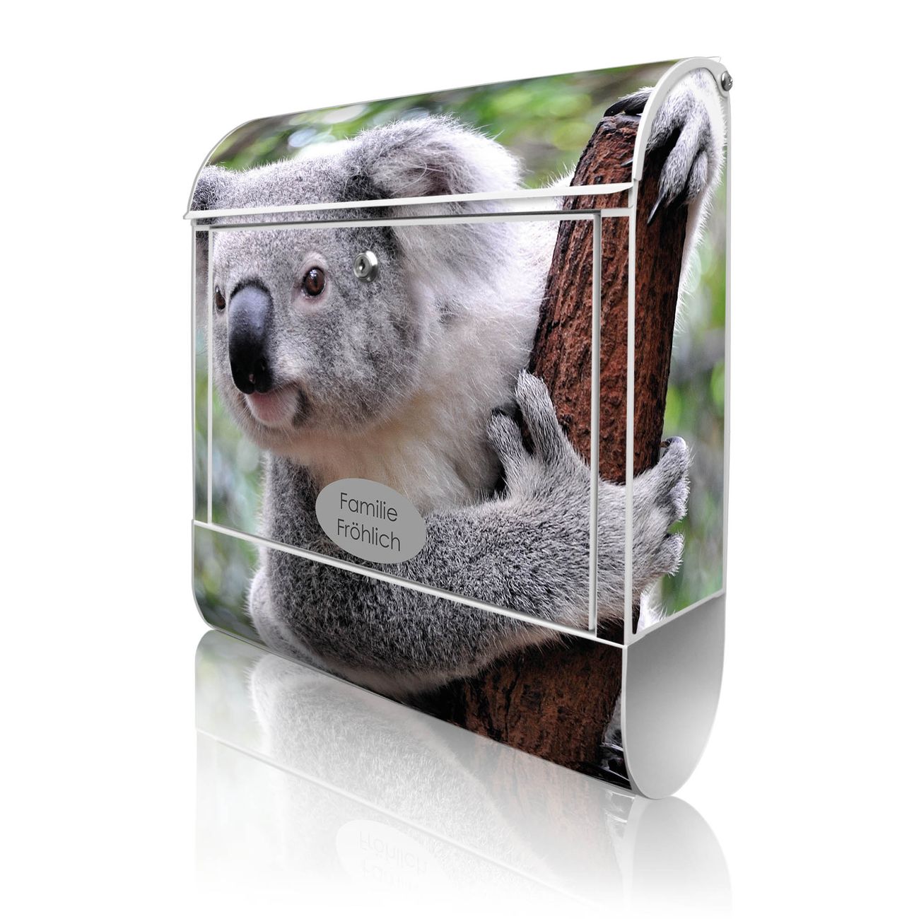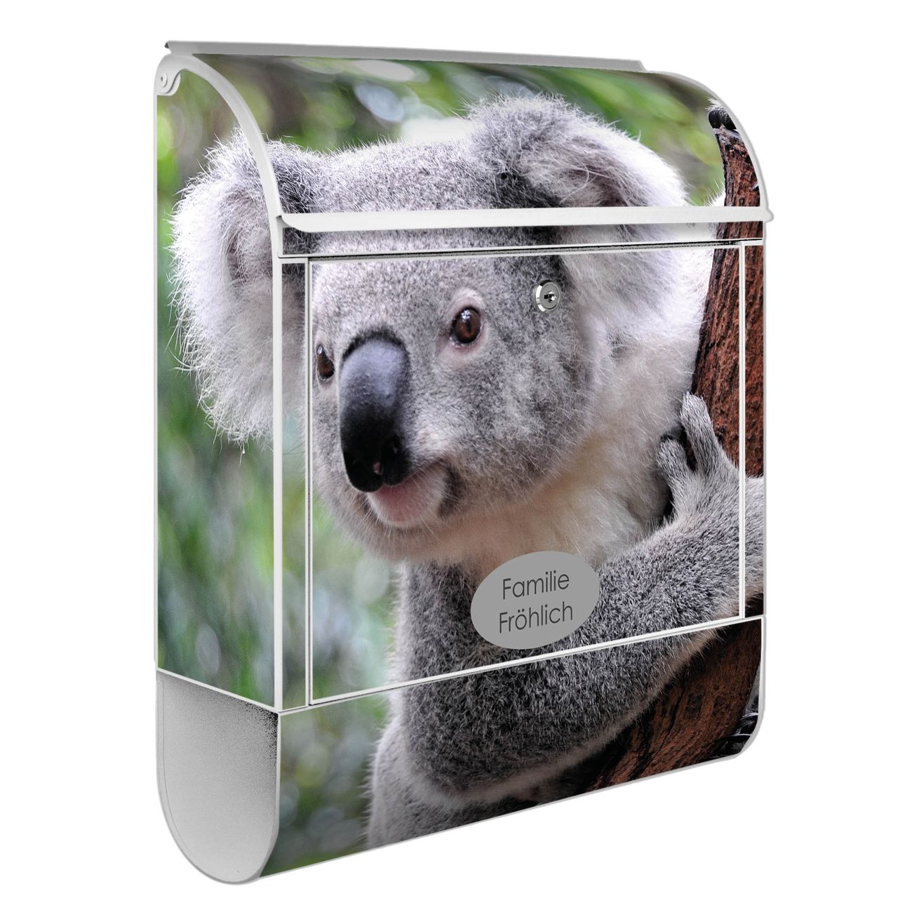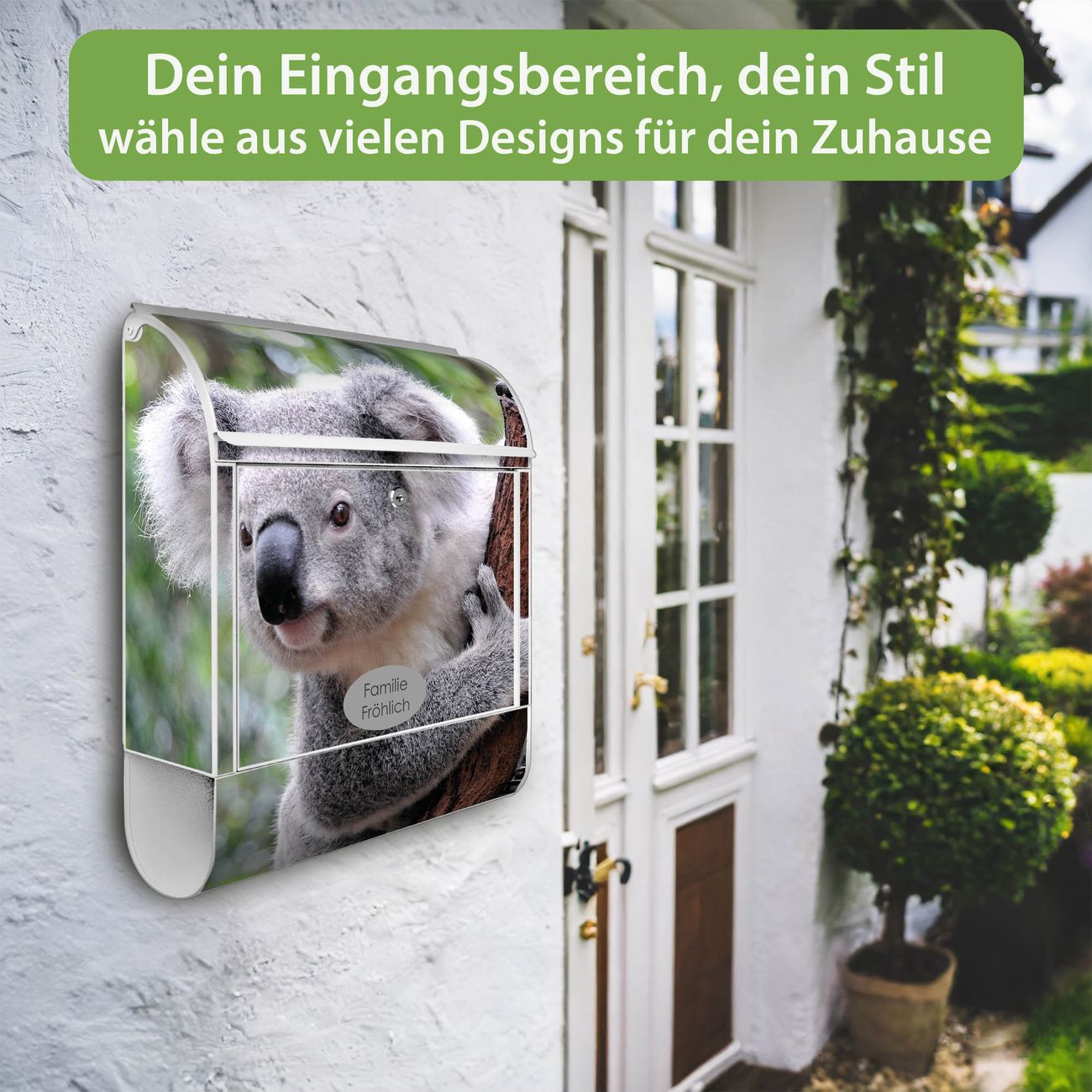 Motiv Koala Nr. 10224 Material weiß pulverbeschichtetes Stahlblech Dekorfolie UV-beständig, wetterfest Gesamtgröße 38x47x13cm BxHxT Briefschlitz 33x3,5cm BxH Gewicht ca. 3,5 kg Zubehör Montagezubehör, 2 Schlüssel, Bohrschablone