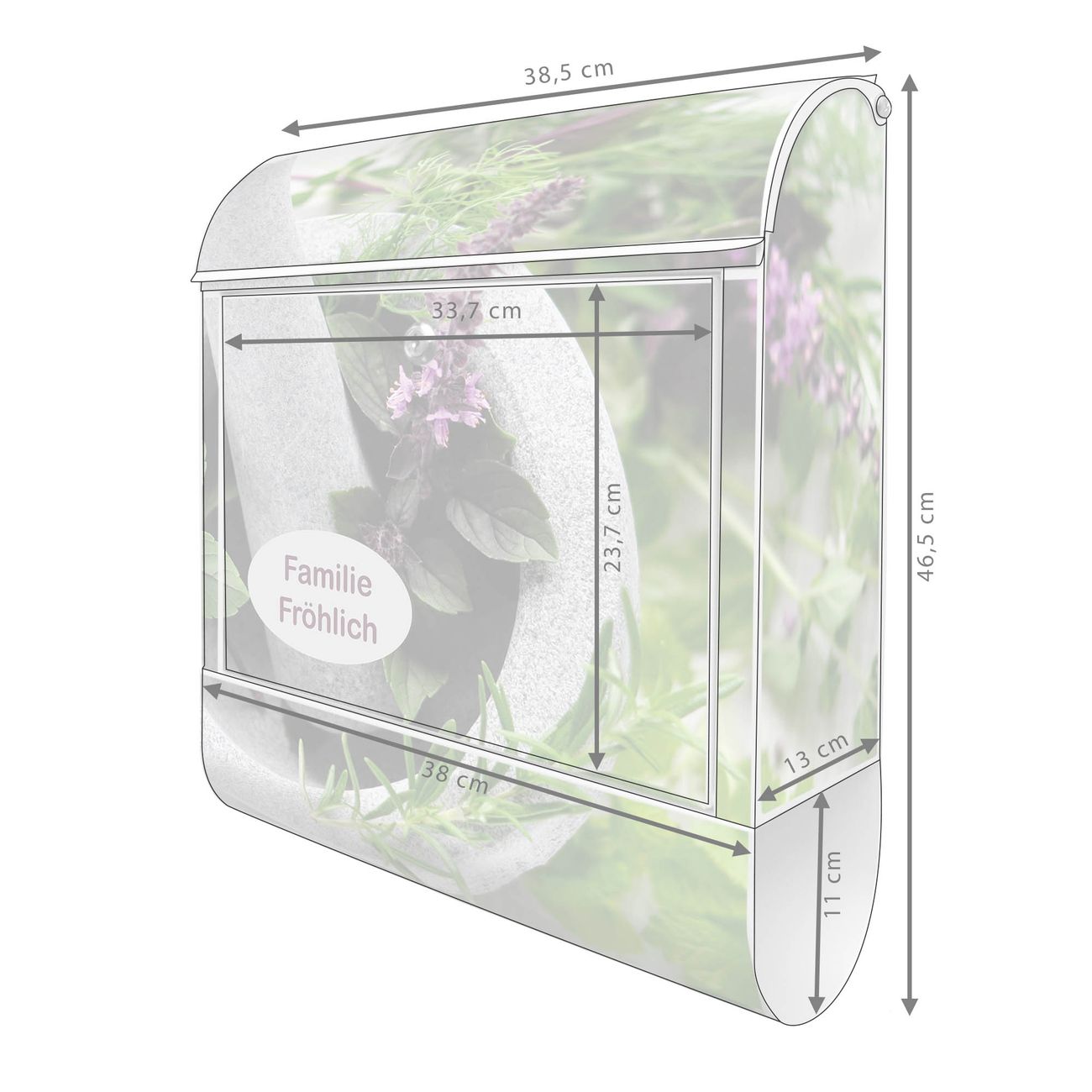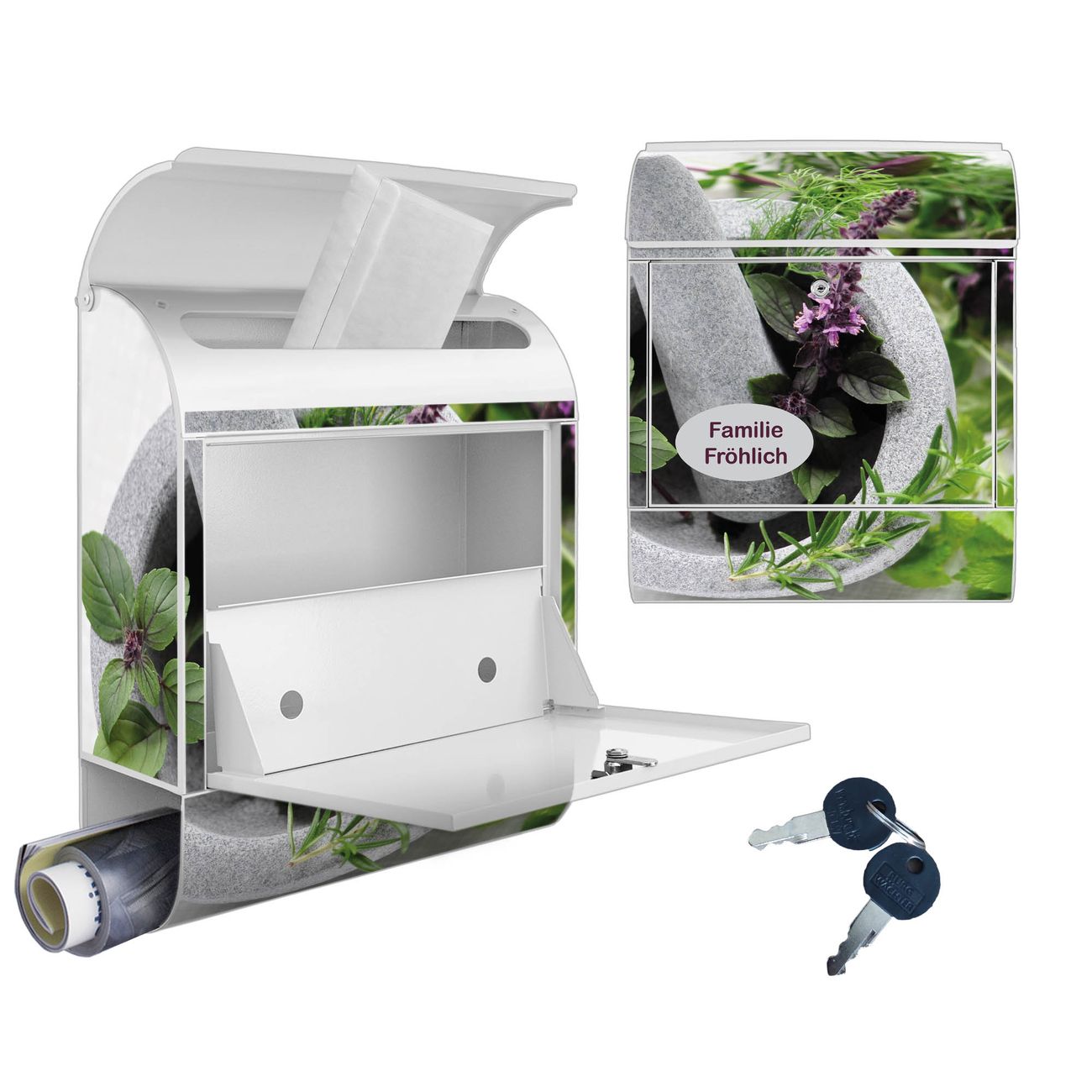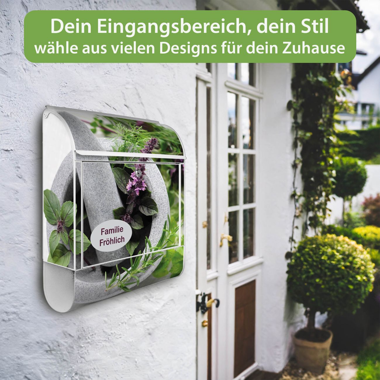 Motiv Kräuter Nr. 10151 Material weiß pulverbeschichtetes Stahlblech Dekorfolie UV-beständig, wetterfest Gesamtgröße 38x47x13cm BxHxT Briefschlitz 33x3,5cm BxH Gewicht ca. 3,5 kg Zubehör Montagezubehör, 2 Schlüssel, Bohrschablone