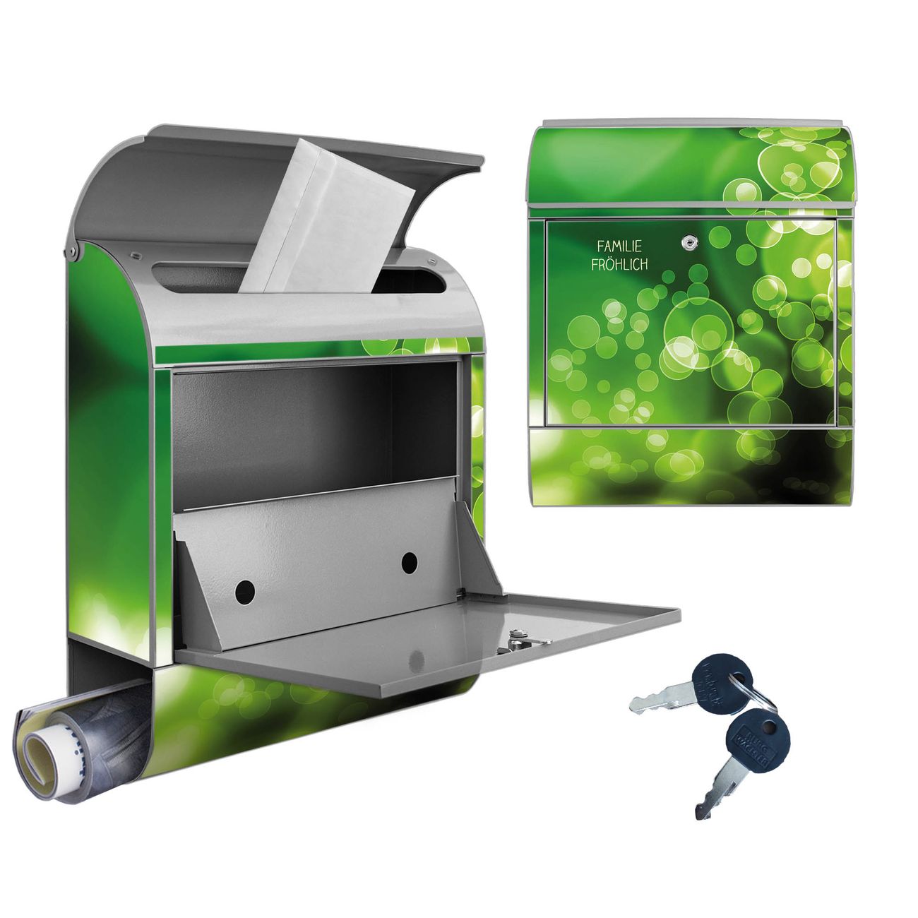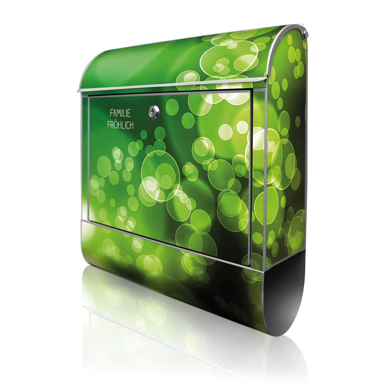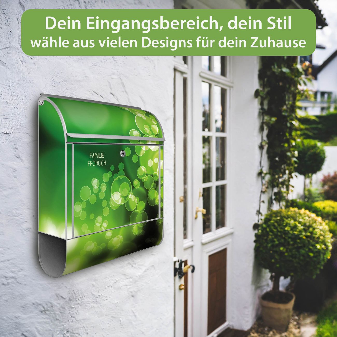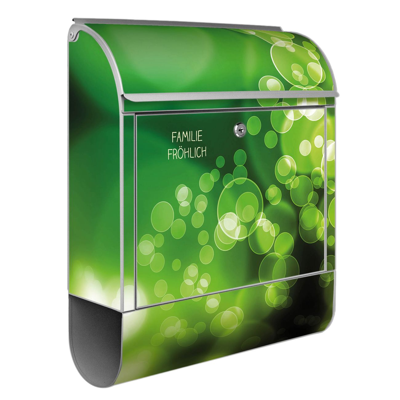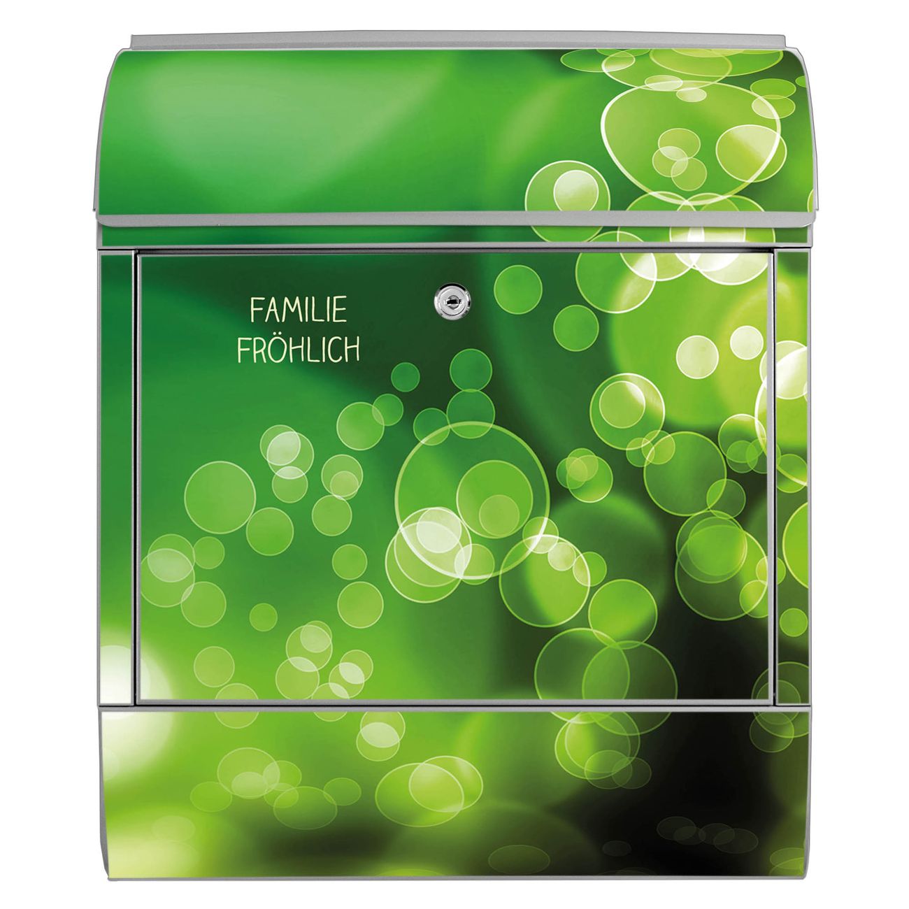 Motiv Lichtspiel Nr. 10283 Material silber pulverbeschichtetes Stahlblech Dekorfolie UV-beständig, wetterfest Gesamtgröße 38x47x13cm BxHxT Briefschlitz 33x3,5cm BxH Gewicht ca. 3,5 kg Zubehör Montagezubehör, 2 Schlüssel, Bohrschablone