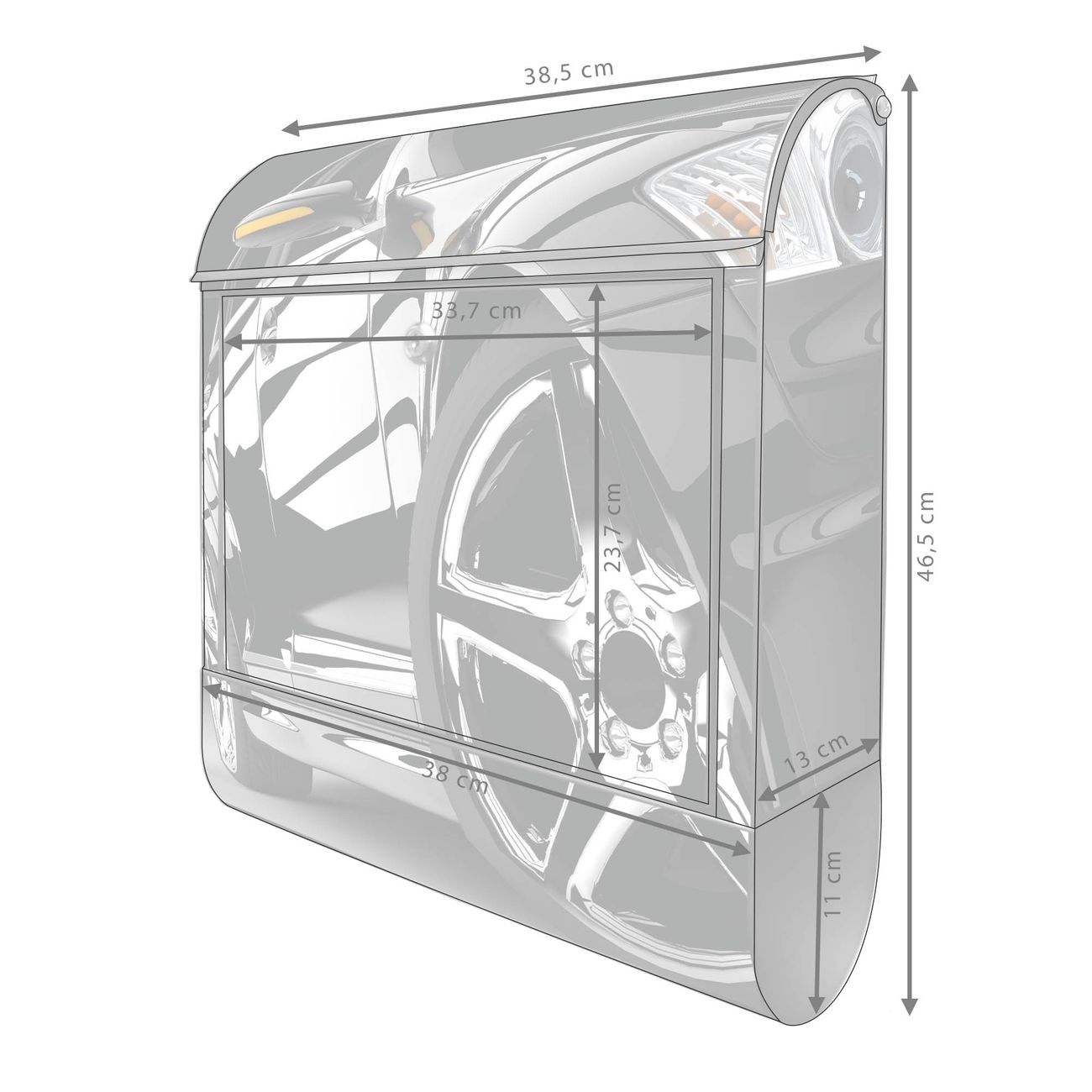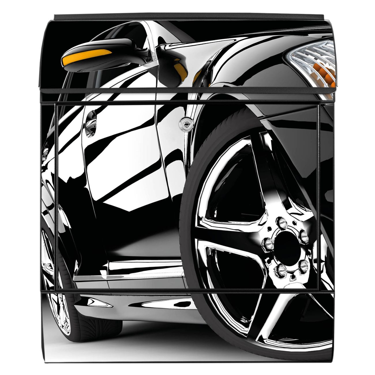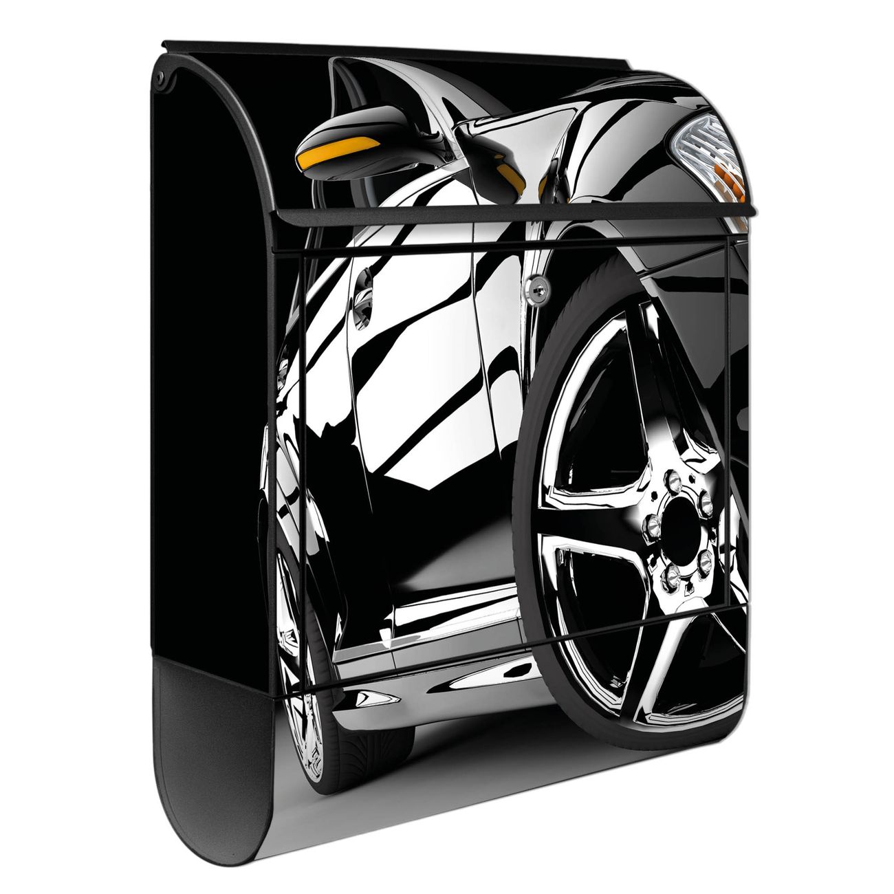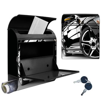 Motiv Luxus Car Nr. 10177 Material: schwarz pulverbeschichtetes Stahlblech Dekorfolie: UV-beständig, wetterfest Gesamtgröße: 38x46x12,5cm BxHxT Briefschlitz: 33x3,5cm BxH Gewicht: ca. 3,4 kg Zubehör: Montagezubehör, 2 Schlüssel, Bohrschablone