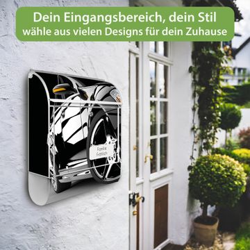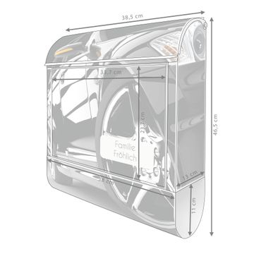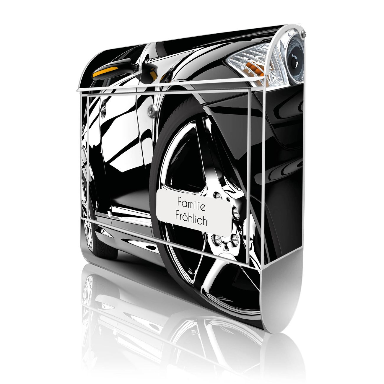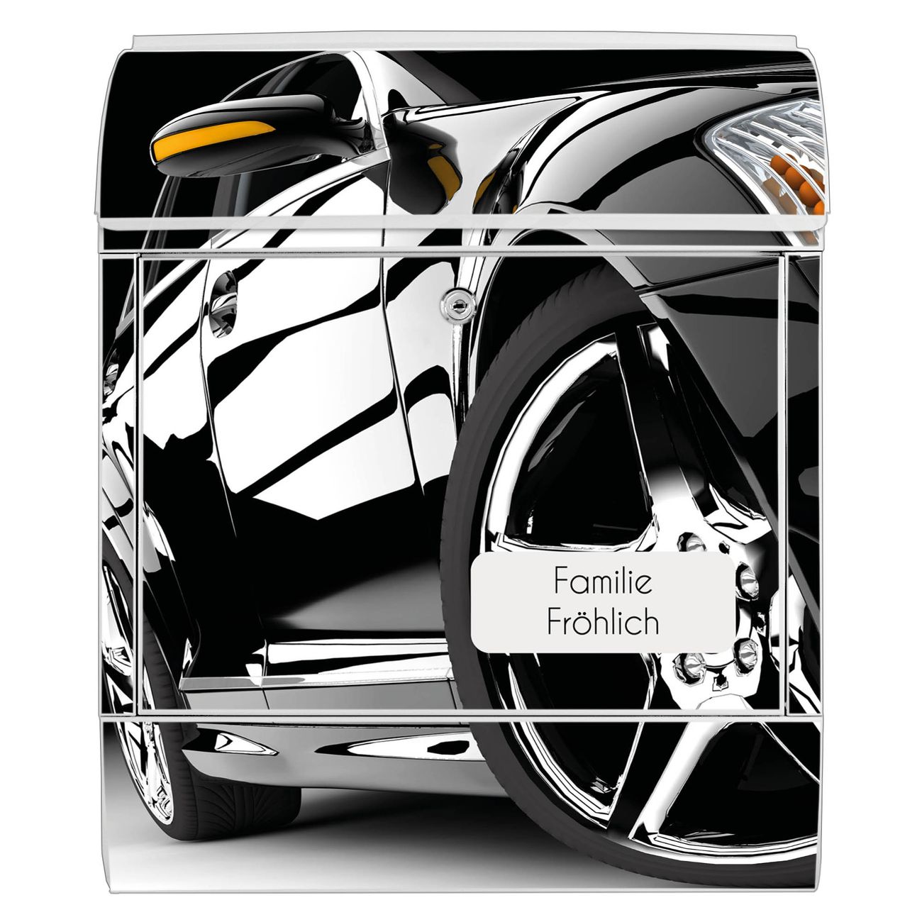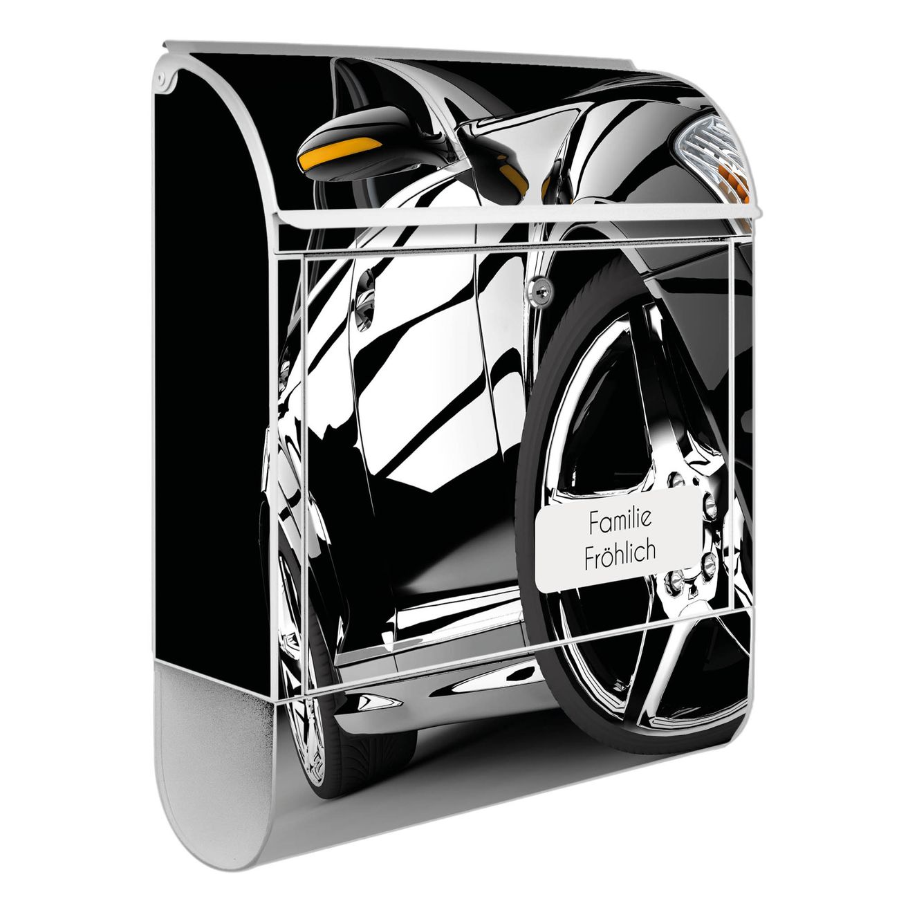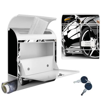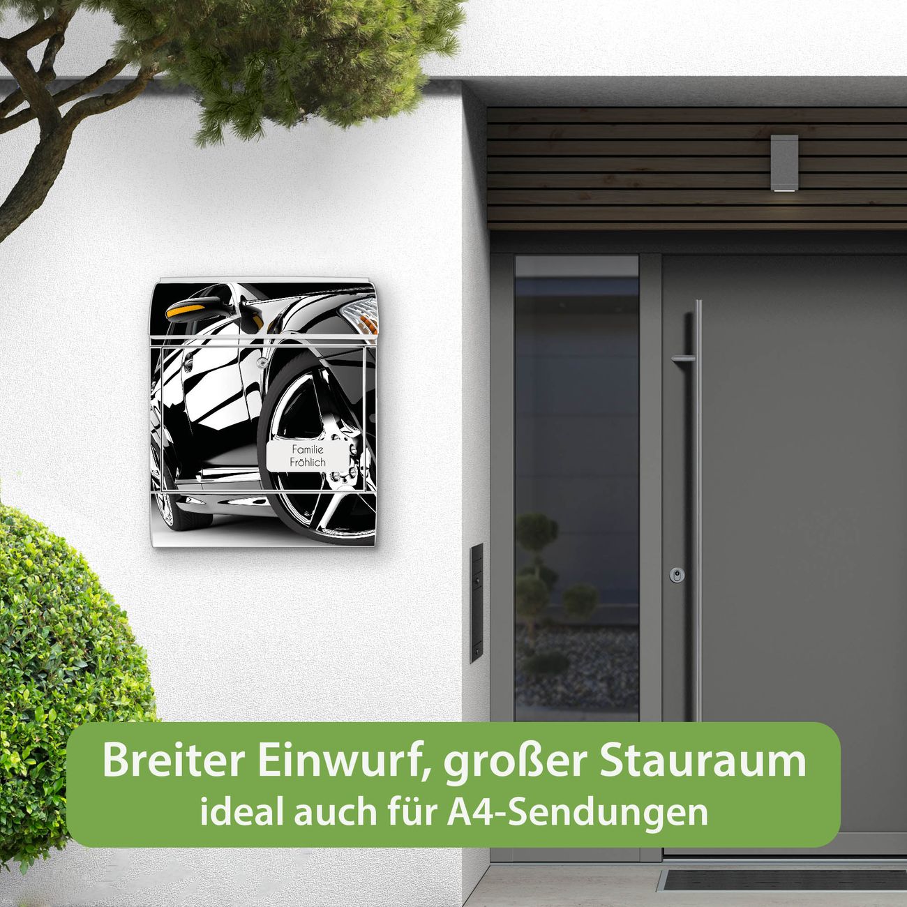 Motiv Luxus Car Nr. 10177 Material weiß pulverbeschichtetes Stahlblech Dekorfolie UV-beständig, wetterfest Gesamtgröße 38x47x13cm BxHxT Briefschlitz 33x3,5cm BxH Gewicht ca. 3,5 kg Zubehör Montagezubehör, 2 Schlüssel, Bohrschablone