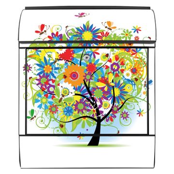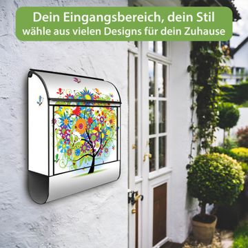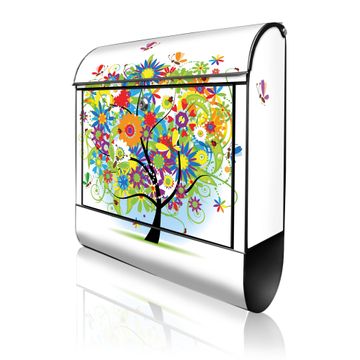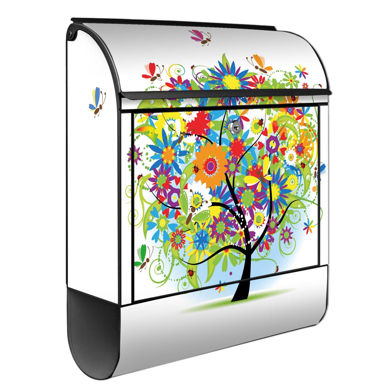 Motiv Märchenzauberbaum Nr. 10149 Material schwarz pulverbeschichtetes Stahlblech Dekorfolie UV-beständig, wetterfest Gesamtgröße 38x47x13cm BxHxT Briefschlitz 33x3,5cm BxH Gewicht ca. 3,5 kg Zubehör Montagezubehör, 2 Schlüssel, Bohrschablone