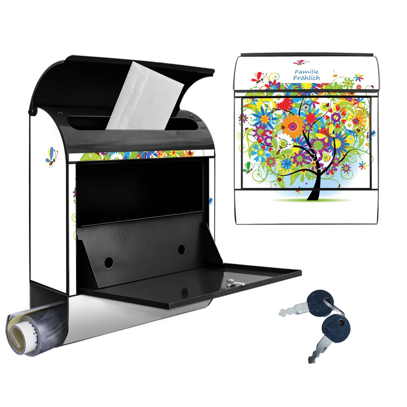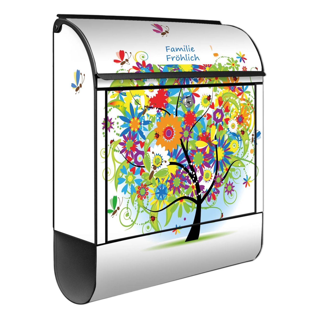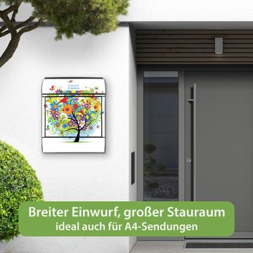Motiv Märchenzauberbaum Nr. 10149 Material schwarz pulverbeschichtetes Stahlblech Dekorfolie UV-beständig, wetterfest Gesamtgröße 38x47x13cm BxHxT Briefschlitz 33x3,5cm BxH Gewicht ca. 3,5 kg Zubehör Montagezubehör, 2 Schlüssel, Bohrschablone