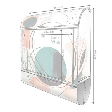 DESIGN: Der Postkasten mit Motiv Motiv Abstrakte Formen hat ein sehr ansprechendes und ausgefallenes Design, damit entlocken Sie Ihren Nachbarn und dem Postboten ein Lächeln. Heben Sie Sich von der tristen grauen Masse ab, ohne auf Funktionalität zu verzichten. DETAILS: Der Postkasten besteht aus pulverbeschichtetem Stahl. Er ist 38x46x12,5cm groß. Das Motiv besteht aus einer wetter- und UV-resistenten Folie, die mit einem Schutzlaminat überzogen ist, sodass der Briefkasten zusätzlich vor Kratzern geschützt ist. Der Briefkasten wird mit Montagematerial, zusätzlich zwei Schlüssel sowie einer Bohrschablone geliefert. NUTZEN: Sie können diesen Briefkasten sowohl als Wandbriefkasten montieren oder einen passenden Ständer kaufen und als Standbriefkasten einbetonieren. Die Größe bietet genügend Platz für Sendungen aller Art, der Einwurf fasst auch größere A4 Sendungen. BANJADO: Ihr Briefkasten wird in Sachsen in einer kleinen Manufaktur von Hand veredelt. Die Motivfolie ist lösungsmittelfrei und schutzlaminiert für einen langen Halt. Wir legen großen Wert auf die Verbindung von Funktionalität und Design. Sie erhalten Handarbeit aus Sachsen.