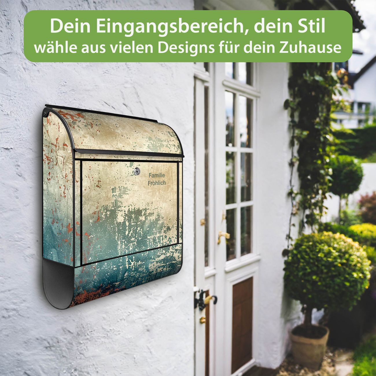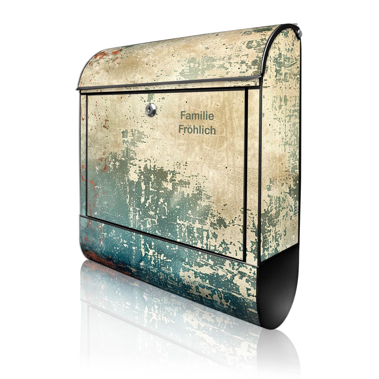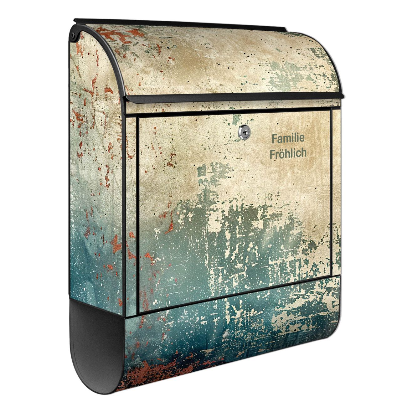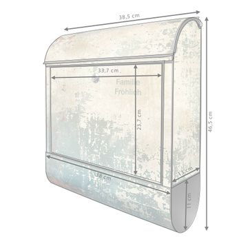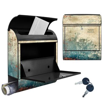 DESIGN: Der Postkasten mit Motiv Motiv Abstrakte Patina hat ein sehr ansprechendes und ausgefallenes Design, damit entlocken Sie Ihren Nachbarn und dem Postboten ein Lächeln. Heben Sie Sich von der tristen grauen Masse ab, ohne auf Funktionalität zu verzichten. DETAILS: Der Postkasten besteht aus pulverbeschichtetem Stahl. Er ist 38x46x12,5cm groß. Das Motiv besteht aus einer wetter- und UV-resistenten Folie, die mit einem Schutzlaminat überzogen ist, sodass der Briefkasten zusätzlich vor Kratzern geschützt ist. Der Briefkasten wird mit Montagematerial, zusätzlich zwei Schlüssel sowie einer Bohrschablone geliefert. NUTZEN: Sie können diesen Briefkasten sowohl als Wandbriefkasten montieren oder einen passenden Ständer kaufen und als Standbriefkasten einbetonieren. Die Größe bietet genügend Platz für Sendungen aller Art, der Einwurf fasst auch größere A4 Sendungen. BANJADO: Ihr Briefkasten wird in Sachsen in einer kleinen Manufaktur von Hand veredelt. Die Motivfolie ist lösungsmittelfrei und schutzlaminiert für einen langen Halt. Wir legen großen Wert auf die Verbindung von Funktionalität und Design. Sie erhalten Handarbeit aus Sachsen.