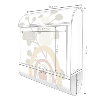 DESIGN: Der Postkasten mit Motiv Motiv Boho Katze Regenbogen hat ein sehr ansprechendes und ausgefallenes Design, damit entlocken Sie Ihren Nachbarn und dem Postboten ein Lächeln. Heben Sie Sich von der tristen grauen Masse ab, ohne auf Funktionalität zu verzichten. DETAILS: Der Postkasten besteht aus pulverbeschichtetem Stahl. Er ist 38x46x12,5cm groß. Das Motiv besteht aus einer wetter- und UV-resistenten Folie, die mit einem Schutzlaminat überzogen ist, sodass der Briefkasten zusätzlich vor Kratzern geschützt ist. Der Briefkasten wird mit Montagematerial, zusätzlich zwei Schlüssel sowie einer Bohrschablone geliefert. NUTZEN: Sie können diesen Briefkasten sowohl als Wandbriefkasten montieren oder einen passenden Ständer kaufen und als Standbriefkasten einbetonieren. Die Größe bietet genügend Platz für Sendungen aller Art, der Einwurf fasst auch größere A4 Sendungen. BANJADO: Ihr Briefkasten wird in Sachsen in einer kleinen Manufaktur von Hand veredelt. Die Motivfolie ist lösungsmittelfrei und schutzlaminiert für einen langen Halt. Wir legen großen Wert auf die Verbindung von Funktionalität und Design. Sie erhalten Handarbeit aus Sachsen.
